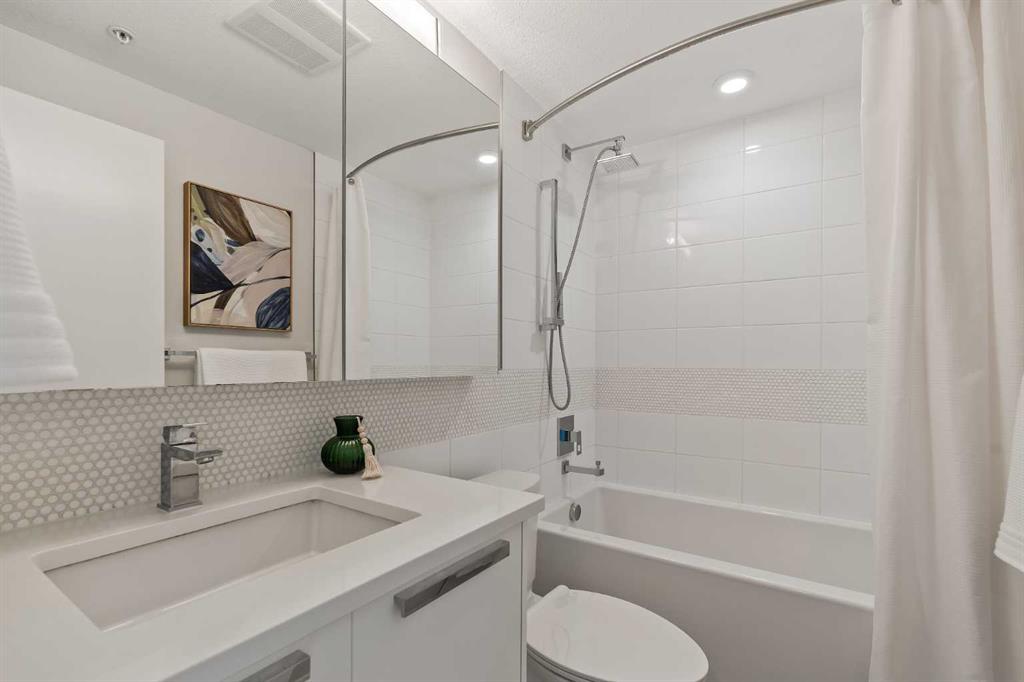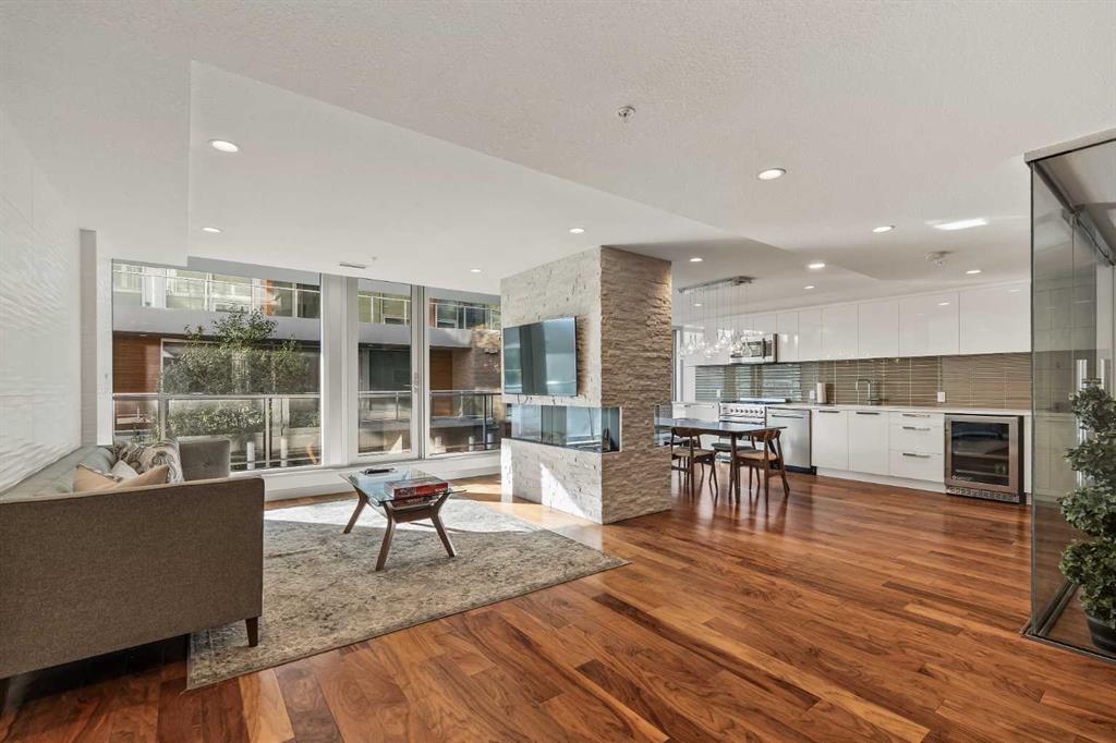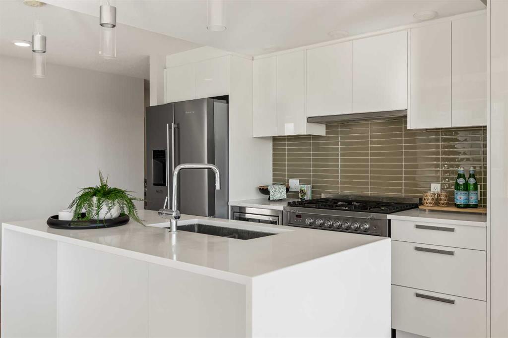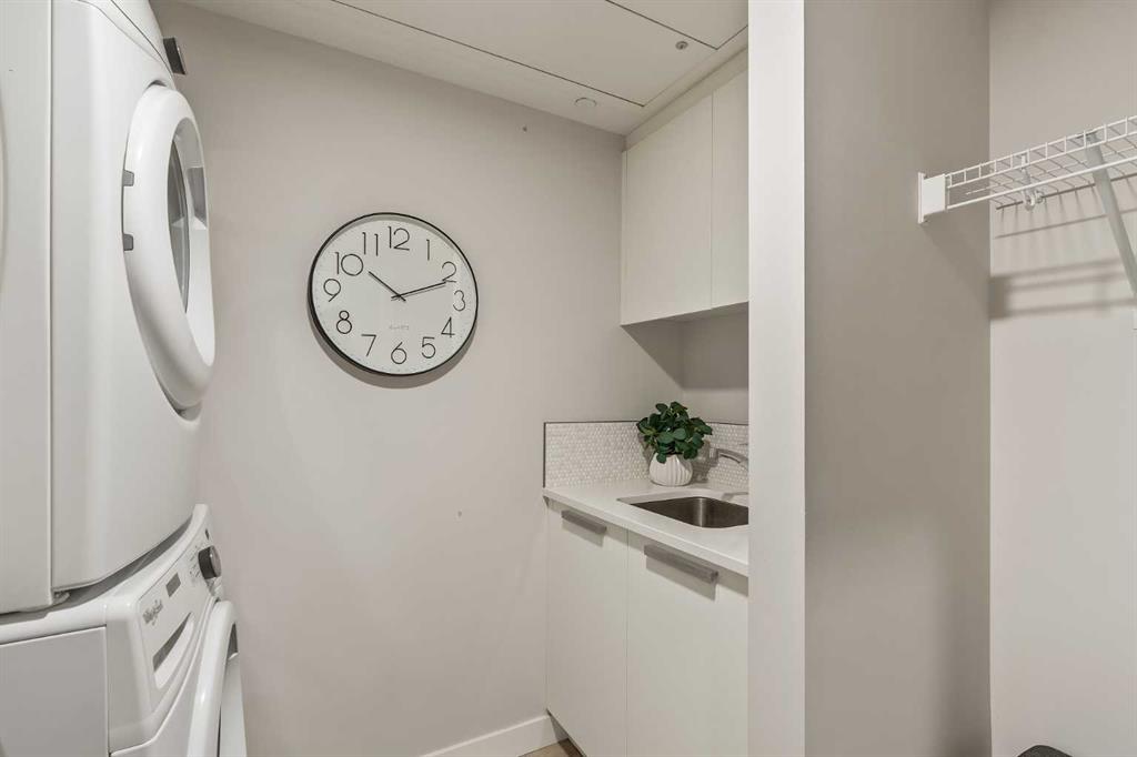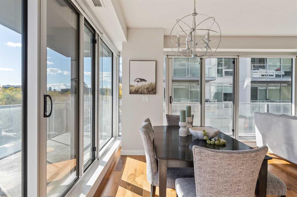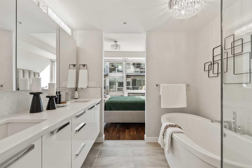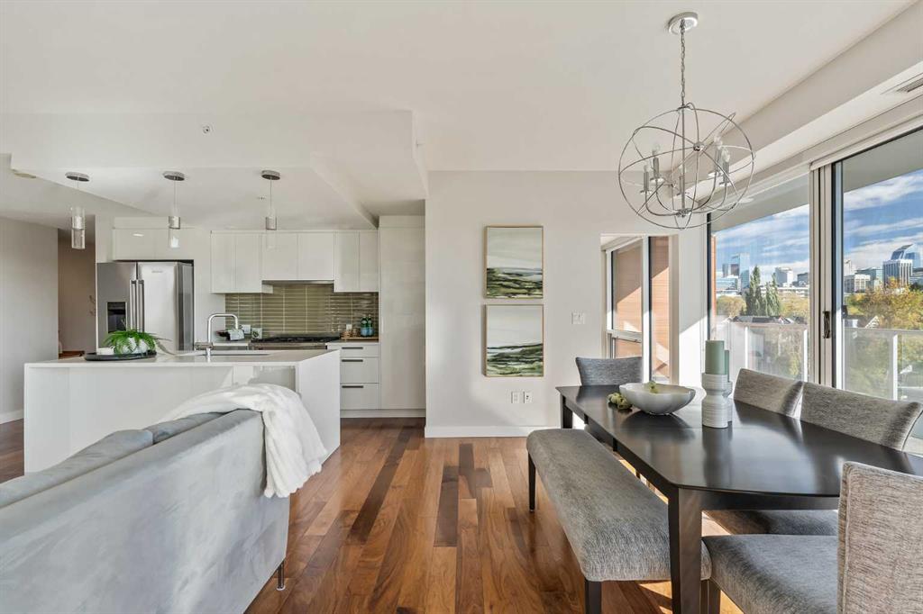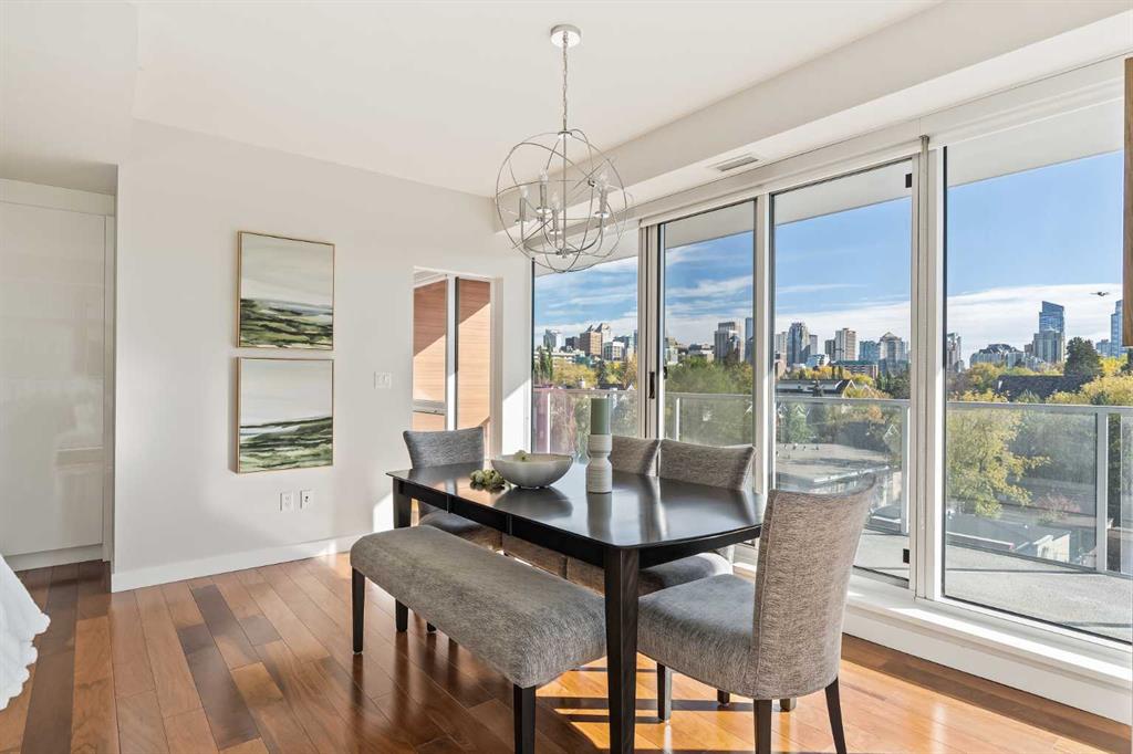 Experience refined urban living in this bright corner unit, thoughtfully designed with two bedrooms and exceptional flow throughout. Floor-to-ceiling windows flood the space with natural light, while the open-concept living and dining areas create an inviting atmosphere. Step out onto the private balcony to take in sweeping south-facing views of downtown. The contemporary kitchen blends style and function, featuring high-end stainless steel appliances, a gas range, and a large quartz island that’s perfect for casual dining or entertaining. The primary suite offers a generous walk-in closet and a spa-inspired 5-piece ensuite complete with a free-standing soaker tub. The second bedroom enjoys convenient cheater access to the main 4-piece bath, ideal for family or guests. A separate laundry room with full-sized machines adds extra practicality. Upgraded engineered hardwood floors extend throughout, bringing a warm, modern finish. This home also comes with one titled underground parking stall and secure storage. At Ezra, residents enjoy exclusive amenities including a stylish party lounge with wine storage in the East tower and a fitness/recreation facility in the West tower. Situated next to historic Riley Park, you’ll be just steps from the LRT, Kensington shops, Safeway, and an abundance of bike paths and walking trails. A truly elevated lifestyle in the heart of the city.