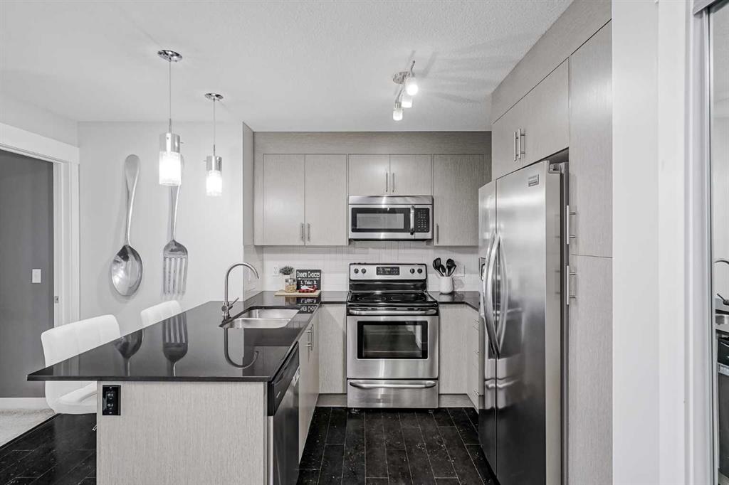 IMMEDIATE POSSESSION! VACANT and MOVE-IN READY! Welcome to this bright and beautifully designed TOP-FLOOR condo in the sought-after community of Skyview Ranch—where style, comfort, and convenience come together. As you enter, you're welcomed by a spacious and sunlit open-concept living area, perfectly suited for both relaxing and entertaining. The seamless flow into the contemporary kitchen is sure to impress, featuring sleek grey cabinetry, granite countertops, stainless steel appliances, and an abundance of counter and storage space. Whether you're preparing a quiet meal or hosting friends, this kitchen is both beautiful and practical. A dedicated office nook offers the ideal tucked-away workspace for remote professionals or students, making working from home effortless and efficient. Step through the sliding glass doors from the bright and airy living room onto a generous east-facing balcony—perfect for sipping your morning coffee or hosting summer barbecues. Take in the open, unobstructed views while enjoying the convenience of a built-in BBQ gas line, ideal for effortless outdoor entertaining. Designed for comfort and privacy, this well-planned layout places the primary bedroom on one side of the unit, complete with a walk-in closet and a spa-inspired 4-piece ensuite bathroom. On the opposite side, a second generously sized bedroom sits adjacent to its own 4-piece full bathroom, making it perfect for guests, children, or roommates. Additional highlights include: a convenient in-suite laundry and storage room, stylish mix of cork, tile, and plush carpet flooring, secure underground parking stall with a private storage cage, key fob-secured front lobby with video surveillance for added peace of mind. Location is everything, and this home truly delivers. Just steps away from the brand-new Skyview Ranch Elementary/Middle School (K–9), this community is perfect for families. Enjoy the nearby playgrounds, parks, local shopping, and essential amenities—all within walking distance.This condo offers an exceptional opportunity to own in one of Calgary’s most vibrant and growing neighborhoods.