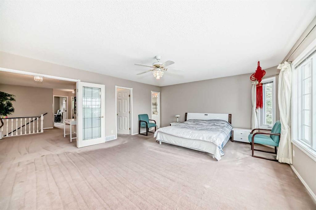 GREAT VALUE | OVER 2,670 SQ FT OF ELEGANT LIVING SPACE. This stunning two storey home offers timeless elegance and exceptional space.Step inside to soaring vaulted ceilings and classic French doors leading into a beautiful den. The main floor features a striking curved staircase, a bright all-white kitchen with abundant cabinetry, an inviting living area, a spacious family room, and a large formal dining room ideal for gatherings and entertaining. Natural sunlight streams throughout the home with its expansive windows and a charming skylight, while a convenient main-floor laundry adds everyday practicality. Upstairs, you’ll find three generous bedrooms, including a luxurious primary suite with a walk-in closet and a private 4-piece ensuite. The two additional bedrooms are bright and roomy, perfect for family or guests.The fully developed basement extends the living space with a large recreation area, an additional bedroom, and a 4-piece bathroom—offering endless possibilities for relaxation, entertainment, or hobbies.Located near James McKevitt Road, Macleod Trail, Shawnessy Boulevard, Evergreen Street SW, and with Stoney Trail just minutes away, this home offers both convenience and connectivity. Some updates are the hardwood floors, some windows and the Ploy b as been replace in the basement