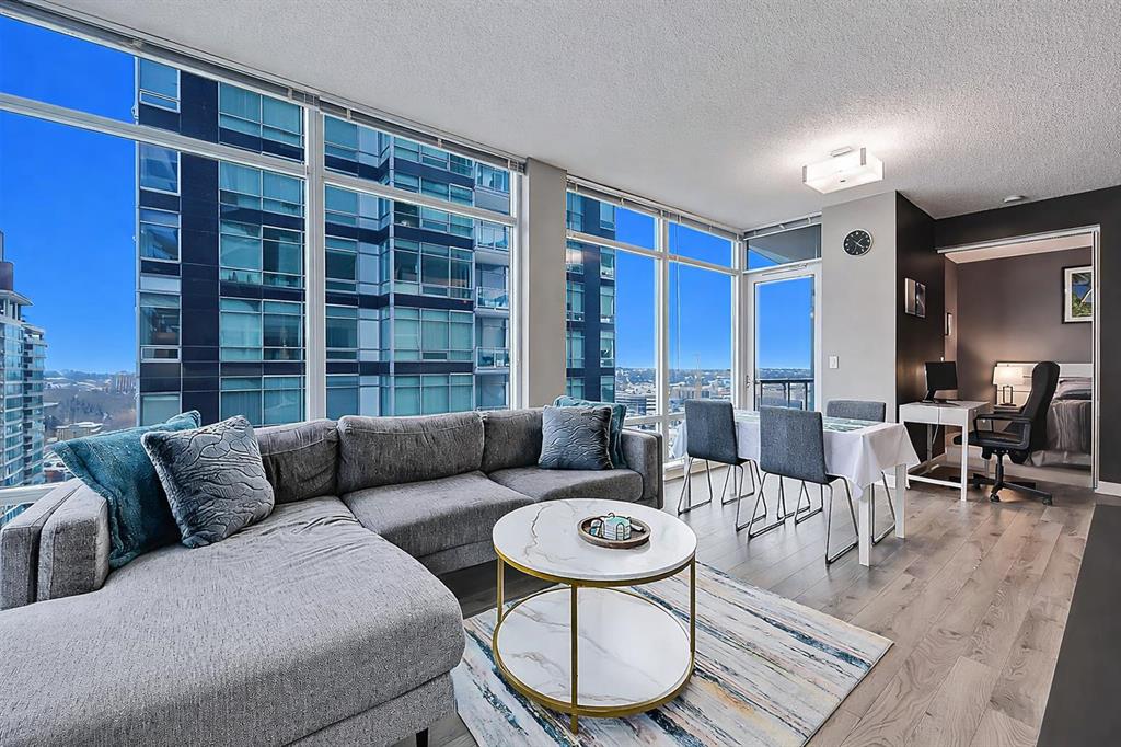 Welcome to Union Square, a premier complex located in the downtown community of Beltline. This unit offers over 900 sq ft of living space with 2 bedrooms, 2 full baths, and a secured underground parking stall. Step inside and you will be greeted with beautiful laminate flooring and an open concept layout. Floor to ceiling windows allow plenty of natural sunlight in to brighten up the space. The contemporary kitchen is equipped with wood cabinetry, modern backsplash, granite countertops, a kitchen island, and stainless-steel appliances. A door from the dining area gives access to the spacious private balcony where you can relax and enjoy city views. There are two generously sized bedrooms with large windows, including the primary bedroom that features 3-piece ensuite and large walk-in closet with organizers. Another 4-piece bathroom and an in-unit laundry provide added convenience, making this home the epitome of comfortable living. This unit also comes with a titled underground secured parking and assigned storage locker. Experience urban living at its finest with proximity to trendy shops and restaurants nearby. Close to schools, parks, playgrounds, and public transportation. Whether you're searching for an excellent home or an outstanding investment opportunity, this remarkable property caters to both. Book your private viewing today!