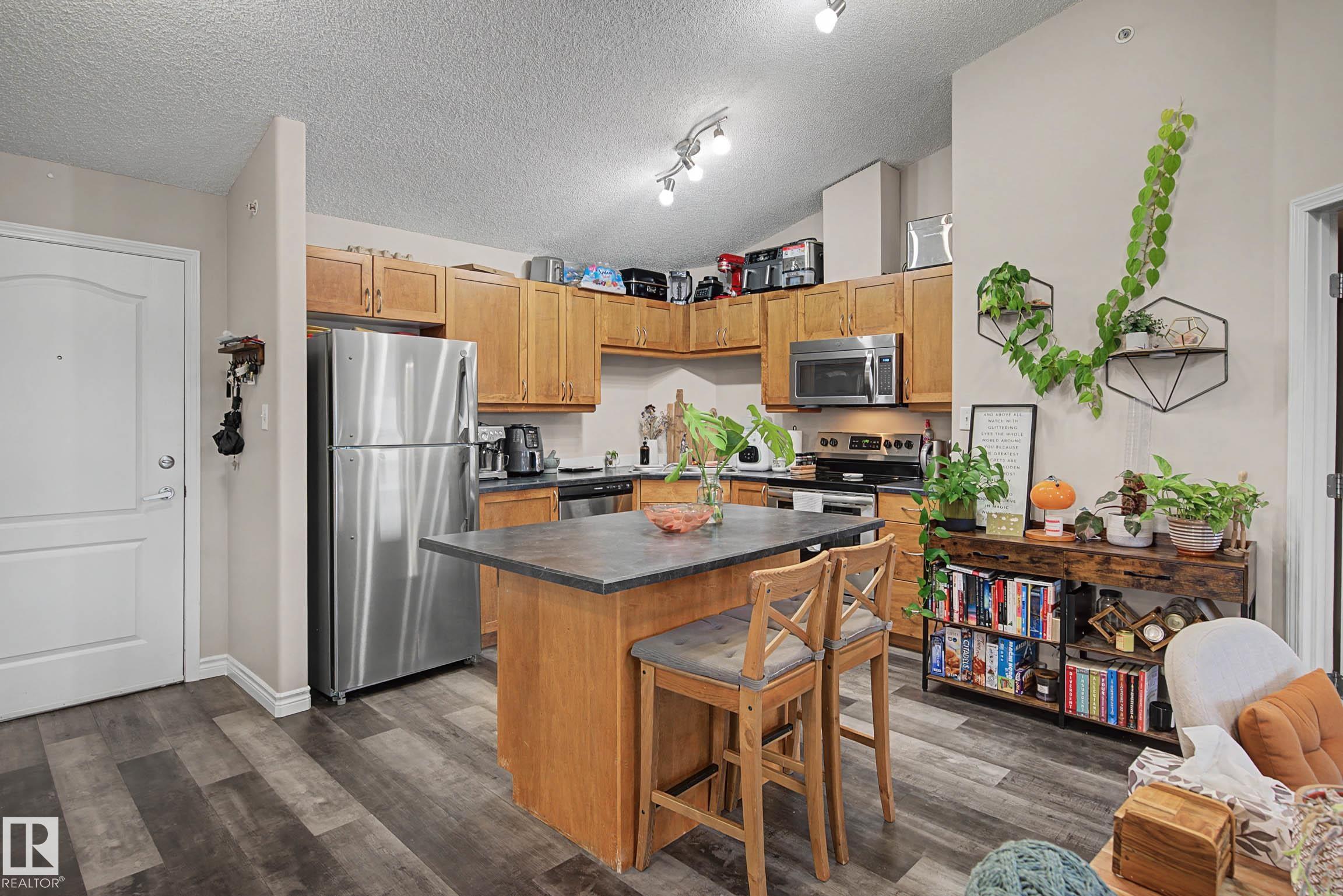 This top-floor unit features a vaulted ceiling and AIR CONDITIONING, setting it apart from other units in the building. The 2 bed, 2 bath layout is well designed with bedrooms and bathrooms on opposite sides. This is an ideal setup for roommates, guests, or added privacy. The kitchen offers an island, stainless steel appliances, and generous cabinetry. A rare full laundry room (not just a closet) provides valuable in-suite storage and adds to the overall functionality of the home. This unit also includes a titled surface stall with a plug-in, and plenty of visitor parking right at the front door. It is located just off Rabbit Hill Road with quick access to the Henday, and directly across from a major shopping hub with groceries, restaurants, and essentials. Condo fees include heat AND water.