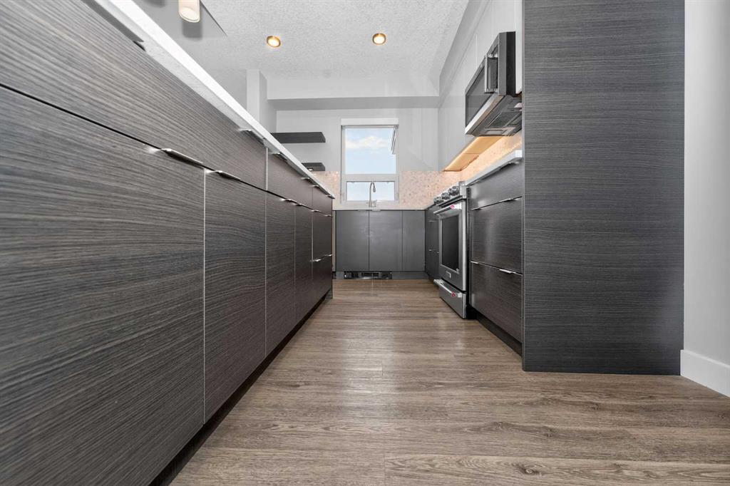 Discover this exceptional penthouse nestled in the heart of Currie Barracks, offering unparalleled elegance and comfort. Located on the top floor of a stunning four-storey building, this residence features soaring ceilings and an expansive open-concept living and dining area perfect for both relaxing and entertaining. Step outside onto the massive terrace, where breathtaking views and seamless indoor-outdoor living await. With dual balconies, you will enjoy stunning views from every direction, including mountain views from the primary bedroom balcony. Every detail of this penthouse exudes sophistication, from the sleek quartz countertops in the modern kitchen and bathrooms to the thoughtfully designed layout that maximizes space and natural light. For year-round comfort, the home is equipped with dual air conditioning units, one in the living room and one in the primary bedroom. Enjoy the convenience of two titled parking stalls in the heated underground parkade, along with two dedicated storage unit and secure bike storage. The parkade also offers 26 visitor stalls and a car wash for added convenience. The beautifully landscaped surroundings provide easy access to numerous nearby parks, creating a serene and inviting atmosphere. Experience the pinnacle of refined living in this one-of-a-kind penthouse where luxury truly meets lifestyle.