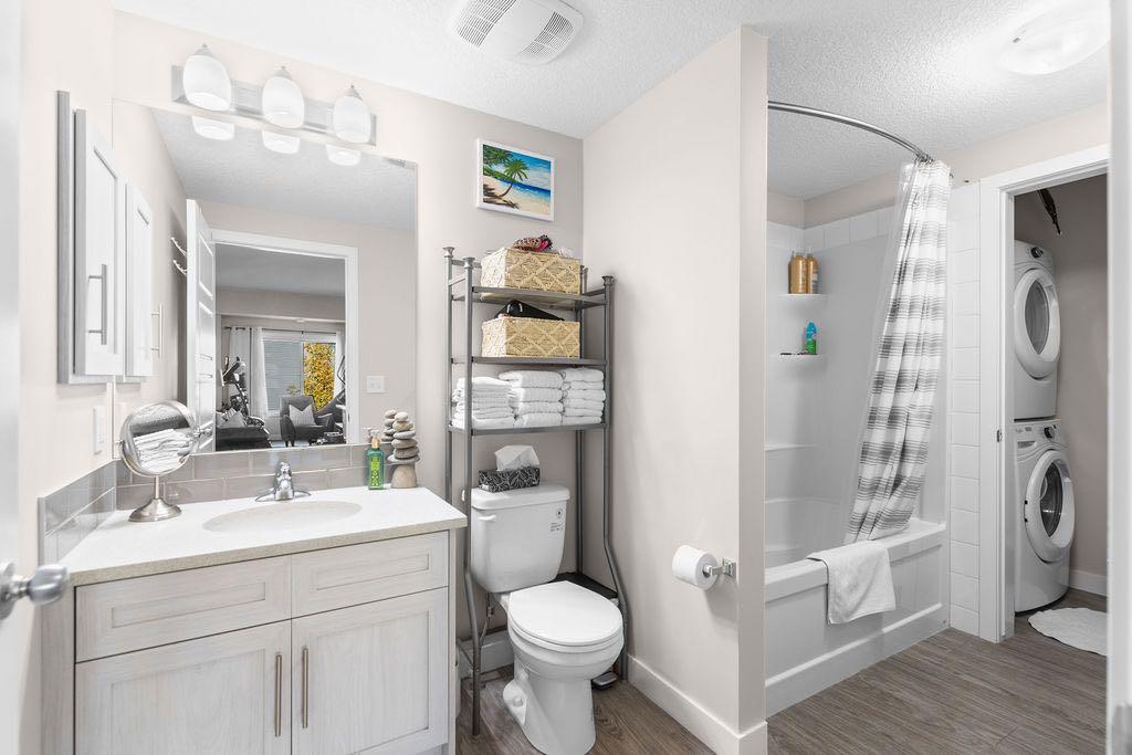Welcome to this beautifully maintained and stylish 2-bedroom townhouse in the desirable community of Baysprings, Airdrie. Offering 820 sq ft of thoughtfully designed living space, this unit combines modern finishes, functional design, a nd a bright open layout that feels warm and inviting from the moment you step inside. The spacious kitchen is the heart of the home, showcasing quartz countertops, full-height cabinetry, a subway tile backsplash, stainless steel appliances, and a large central island with seating perfect for morning coffee or entertaining friends. The open-concept living and dining area is filled with natural light from the large windows and flows seamlessly to the private balcony, an ideal spot to BBQ or relax outdoors. Both bedrooms are generous in size with ample closet space, while the 4-piece bathroom features contemporary finishes and convenient access to the in-suite laundry area. Vaulted ceilings add a sense of openness and style, while the neutral palette complements any décor. This pet-friendly complex offers assigned parking and is perfectly located close to walking paths, playgrounds, schools, and shopping. With quick access to major routes, this is an excellent opportunity for first-time buyers, downsizers, or investors seeking low-maintenance living in a growing community. Move-in ready and sure to impress!