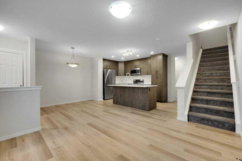 Welcome to this Upgraded 3-bedroom, 2.5-bathroom townhome with NO CONDO FEES! Nestled in the serene community of Carrington North West, Calgary. This 1443.22 sqft home provides excellent living for those seeking a modern and well-designed home. The main floor features a large living area, a dining area, and a large kitchen equipped with modern appliances and storage. The upper level boasts a spacious primary bedroom with a walk-in closet and a full ensuite bathroom. Two additional bedrooms and another full bathroom complete the second floor. This townhome has an attached double-car garage. The basement is unfinished however it is an excellent space for an extra family room. This stunning home is a MUST-SEE! Don't miss out. BOOK YOUR VIEWING TODAY!