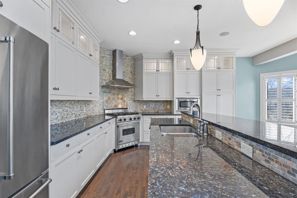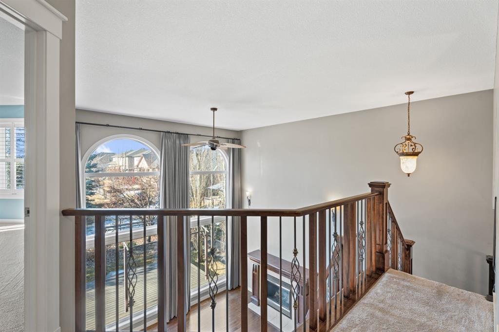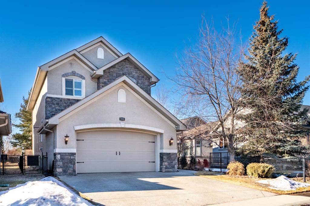Cancelled Open House Sunday. Welcome to 15 Cranleigh Way SE - Premier Cranston Ridge Living - Original owners, first time on market. This meticulously maintained estate captures everything that makes Cranston one of Calgary's most desirable communities. From arrival, curb appeal commands attention with its distinctive stone archway entrance, substantial pillars, and grand custom wooden front door handcrafted for this home. Mature evergreens and ornamental trees anchor the landscaping, while aggregate stone driveway and walkway lead to this elegant entrance. Step inside to a breathtaking vaulted foyer where soaring ceilings and rich hardwood flowing throughout the main level create impressive welcome. Continue into the formal dining room showcasing elegant coffered ceiling insets and custom statement chandelier. Upgraded lighting fixtures in most rooms, plantation shutters on most windows, and custom millwork elevate this home beyond standard builds, adding character throughout. The living room opens with stunning 18-foot ceilings and open to below design with elegant wrought iron railings. The floor-to-ceiling feature wall commands attention, anchored by gas fireplace. Oversized picturesque windows frame incredible greenspace views while flooding the space with natural light. The chef's kitchen flows seamlessly, featuring expansive granite countertops, substantial center island seating four, gas stove, premium stainless appliances, floor-to-ceiling cabinetry, and pantry with custom drawers. Custom pendant lighting highlights the island. Kitchen opens to eating area with west-facing windows overlooking the private backyard. Main floor offers laundry room and two-piece bathroom. Step outside to your west-facing private backyard with mature trees and foliage, perfect for entertaining. Composite deck features pergola, while mature landscaping balances beauty and low maintenance. Backing onto greenspace and pathway system - steps down the path to elevated positioning with unobstructed views of the ridge and valley that make this Cranston Ridge location desirable. Bow River paths and Fish Creek Park access moments away. Upstairs with open to above views of foyer and living room, the master suite offers true retreat. Luxurious five-piece ensuite features soaker tub, separate shower with glass enclosure, granite vanity, and walk-in closet with shelving. Two additional bedrooms share four-piece bathroom. Fully finished basement extends living space with fourth bedroom, full bathroom, and recreation room perfect for media, gym, or entertaining. Premium features include central air, on-demand hot water (2021), wired for sound with speakers, roughed in 240V for hot tub, drywalled insulated garage with gas heater and attic storage. New shingles (2022) and carpet (2021). Minutes to schools, shopping, highway access. Virtual tour in the links, book your exclusive showing today!