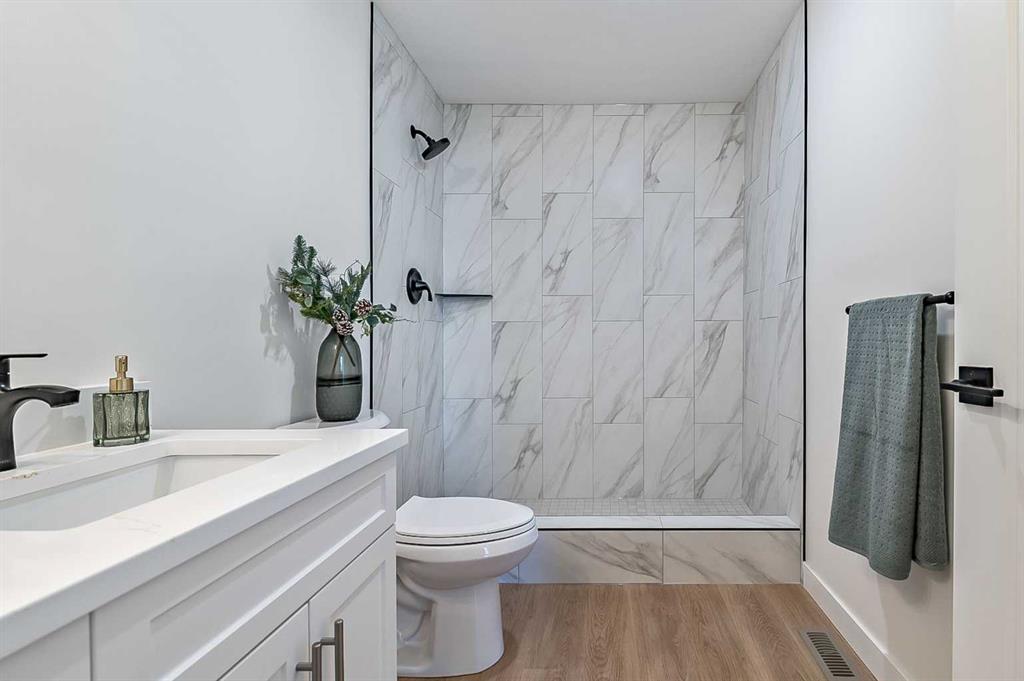Spectacular Renovated 4 level split, over 2,000 sq.ft of developed space, 3 bedrooms+ 3 Baths, Enter new luxury vinyl flooring, Beautiful new White kitchen w/stunning backsplash, Room for a table by the large west facing window w/ loads of natural light, New carpet- 50 oz. underlay on stairs , upper level and family room. Upper level has a large primary bedroom with a renovated 3pc bath with dual sinks and a tiled walk in shower. 2 other good size bedrooms and another 4pc bath. 3rd level walk out to the yard and a oversized 24 x 24 detached double garage, shed and fenced yard. Large family room with a number of windows, a gas fireplace and a 4pc bath, laundry room on 3rd level, 4th level games room, office or a 4th bedroom just needs a egress window. Freshly painted throughout neutral designer colour and accenting black railings. Move in ready. Mature landscaping and a nice quiet location. Woodbine is a wonderful community close to everything, Fish Creek Park, Stoney Trail, The BRT Bus service to downtown and many good schools and churches. Don't miss this great opportunity, Excellent Value!! You could even be in for the Holidays! (Loved for the last 30 years by the same Family)