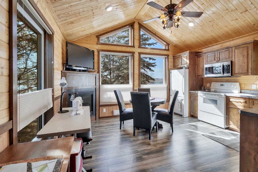 Visit REALTOR® website for additional information.Rare opportunity at Pine Lake! This beautiful 1.36-acre recreational waterfront retreat boasts over 400 ft of private shoreline, surrounded by mature spruce and pine. A boardwalk-style staircase leads you gently down to the lake, where you'll find a small dock-perfect for swimming, boating, or casting a line. The charming 852 sq. ft. home offers 3 bedrooms, a renovated kitchen with granite counters, stainless appliances, updated full bath, wood stove, and a 248 sq. ft. 3 season sunroom with sweeping lake views. Each room has electric heat and the main room has the wood fireplace for comfort in every season. We are currently using as a 3-season property without winter water, but plumbing upgrades could make year-round use possible. A 528 sq. ft. finished accessory building (bunkee) is fully winterized and ideal for guests or family. Complete with kitchen, dining area, washer and dryer, 3/4 bath, and gas fireplace, it's a cozy and versatile space to enjoy all year round. Outside, enjoy a 25x25 fenced garden, beautiful yard, stone firepit, and endless recreational opportunities. The property also offers long-term potential. This retreat is an ideal getaway for snowbirds, outdoor enthusiasts, and families alike. All just 30 minutes to Red Deer, 90 minutes to Calgary and 120 minutes to Edmonton.