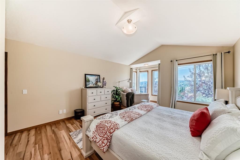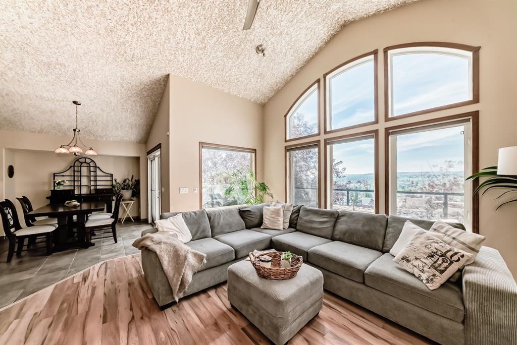 Fantastic location in award winning HANSON RANCH on a Cul de sac with south facing back yard overlooking environmental reserve and long views to Nose Hill Park! Walk into this beautiful custom built, open-concept, walk-out bungalow. Two toned vaulted ceiling with arched art-niches and archways throughout the main floor. The gourmet ranch-style kitchen boasts two-tone Maple cabinetry with glass door feature cabinets and soapstone countertops including oversized island with two level divide and undermount sink. Newer stainless-steel appliances including ceramic top stove and corner pantry with hardwood door. Dining area off the kitchen has extra room with bump out for buffet or China cabinet and overlooks the upper wrap around deck with panoramic south views with stairway to yard and access to escarpment and environmental reserve. Living room has corner fireplace with slate surround and oversized arched windows with stunning long views. Master ensuite has raised sitting area with windows on three sides. Four-piece spa-like ensuite includes large corner soaker tub and oversized walk-in shower. Second bedroom/office also on main floor with built in hardwood window bench and adjacent to the recently updated four-piece bathroom. Large mud room leads to oversized garage and laundry room with stacked washer and dryer and exotic hardwood cabinetry and laundry sink. Stairwell with Maple railings and wrought iron spindles leads to fully developed luxury walk out basement. Main family room has custom hardwood wainscoting and pool table with custom made hardwood wet bar. Recently updated three-piece bath has fully tiled walk in shower, vessel sink and heated floor. Double French doors lead to huge hobby area/bedroom with oversized windows overlooking the beautifully landscaped and manicured back yard with a removable catio (cat patio.) Fourth bedroom is currently being used as an office. Lots of storage in the utility room. The two-tiered custom-made media/theatre room is something to behold with manually placed fiber optics in ceiling and hidden speakers. Beautifully landscaped yard has underground irrigation system. Shingles have been recently replaced. Hanson Ranch is an Estate community set along the sandstone escarpment of Northwest Calgary with homes in harmony with nature and Alberta's proud ranching heritage. Great access to Stoney Trail and all amenities including Creekside Shopping Centre.