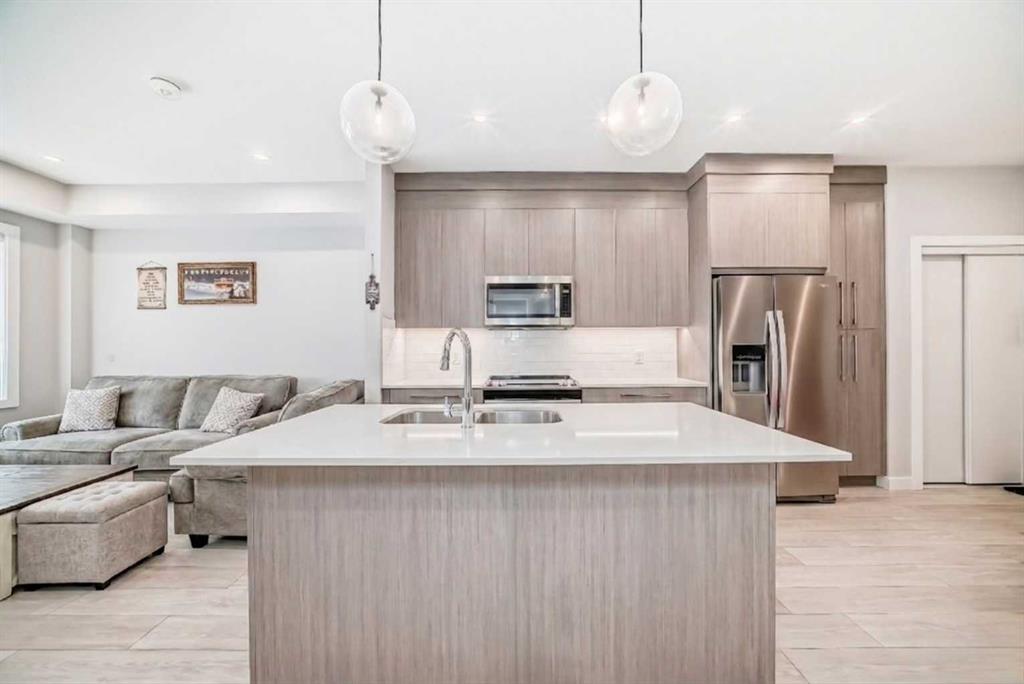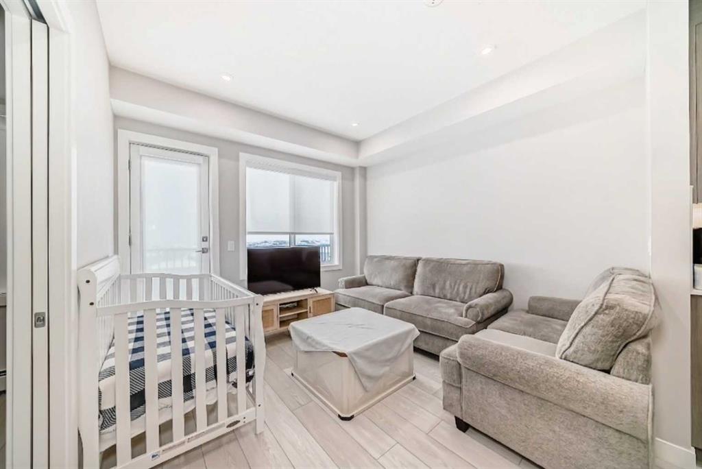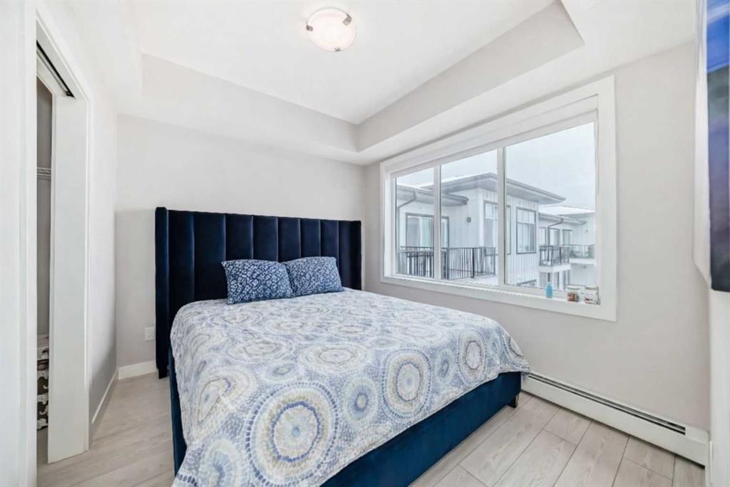 Stylish Top-Floor Condo with Premium Finishes & Top Amenities. Welcome to this modern, energy-efficient top-floor unit offering comfort, convenience, and low-maintenance living. This home features 2 bedrooms, 1 bathroom, 1 storage/locker, and 1 outdoor titled parking stall and low condo fees; ideal for first-time buyers, downsizers, or investors. Conveniently located close to the elevator with easy access east to major highways and nearby amenities. The building offers secure entry, landscaped grounds, and excellent amenities including a full fitness centre (weights, yoga & spin studio), entertainment lounge, pet spa, bike storage/repair room, and a courtyard seating area. Inside, enjoy 9’ ceilings, large windows, luxury vinyl plank flooring, designer lighting, and in-suite laundry. The contemporary kitchen features quartz countertops, full-height backsplash, stainless steel Whirlpool appliances, and sleek cabinetry with soft-close details. The bathroom is finished with quartz counters, modern fixtures, and a deep soaker tub. A perfect blend of style, location, and everyday convenience.