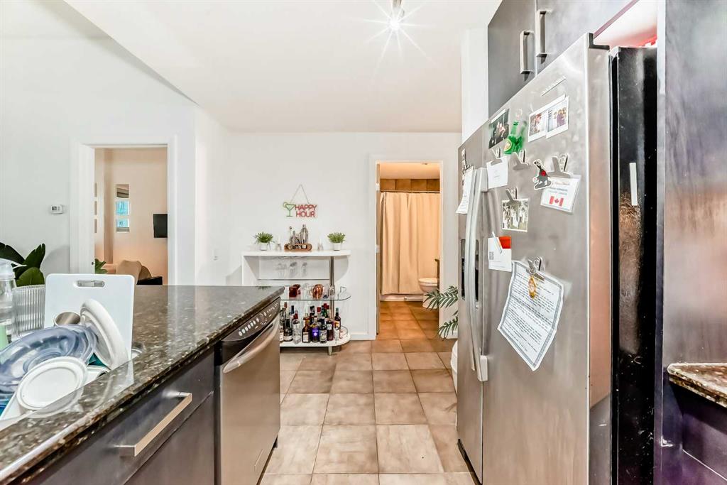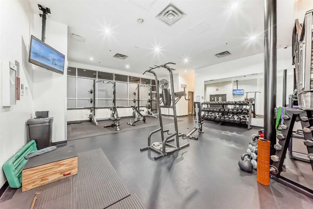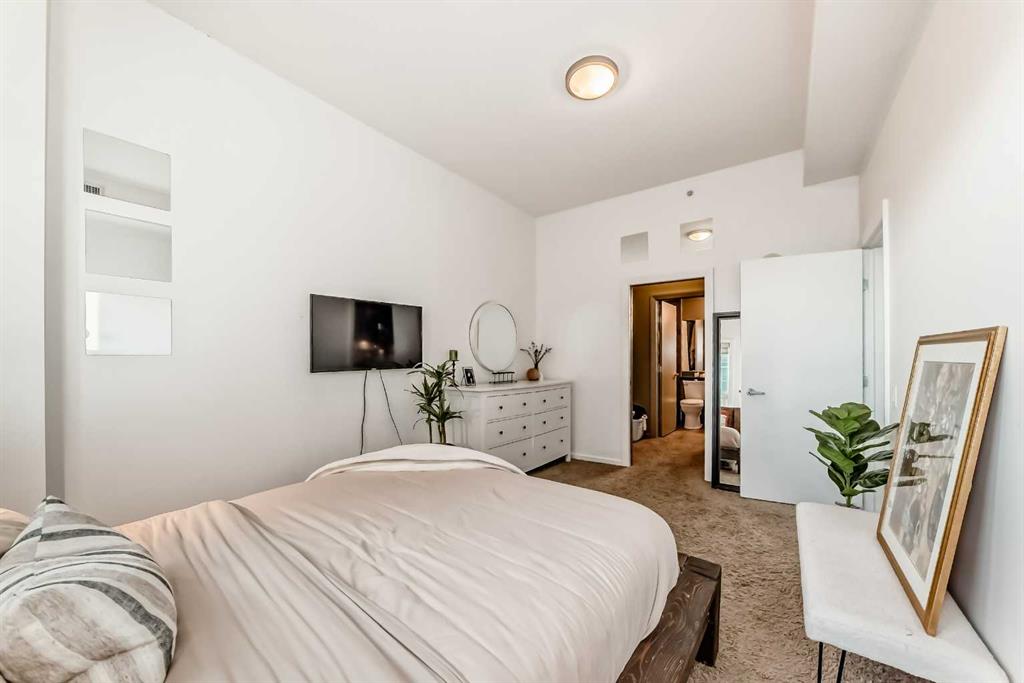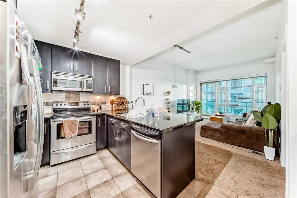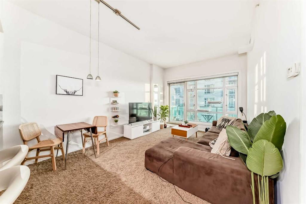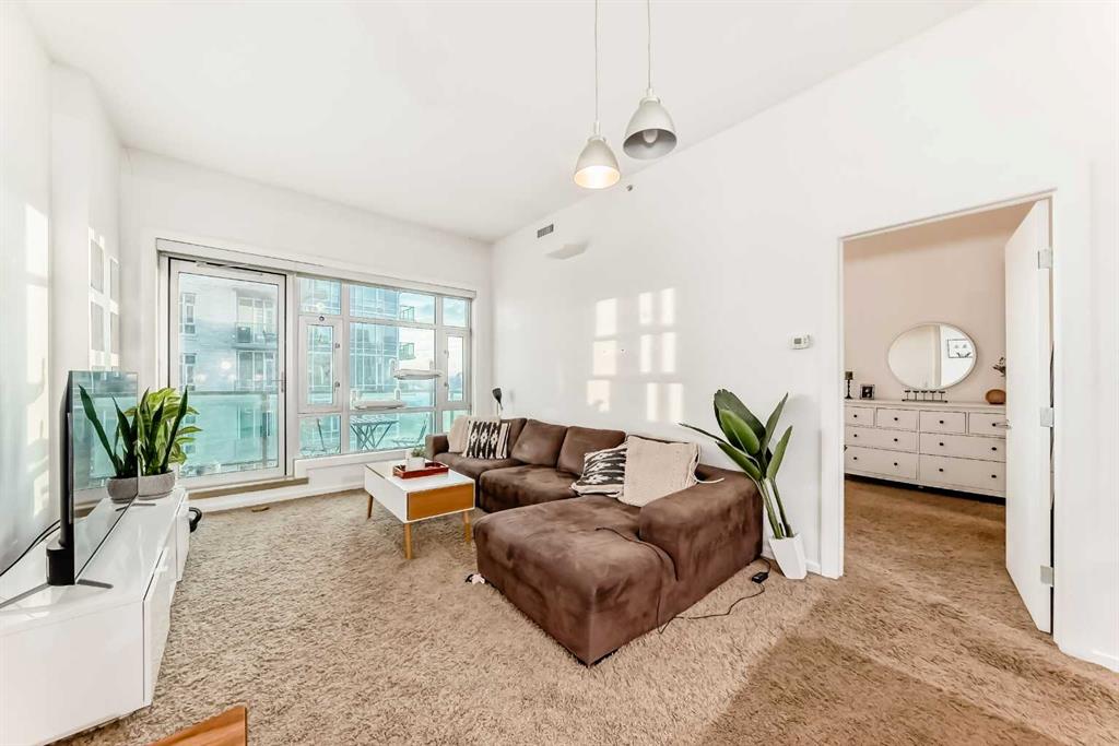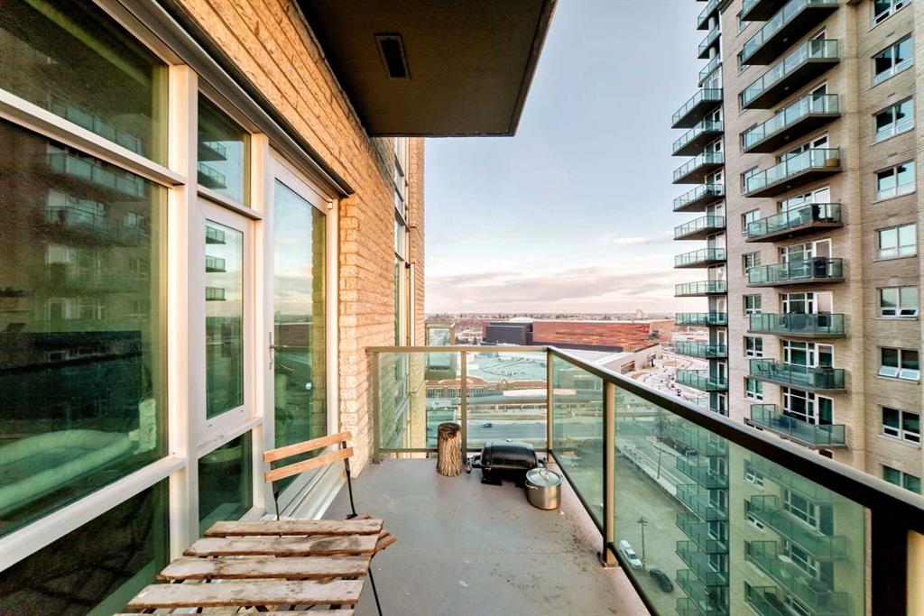 Enjoy stunning mountain and Stampede Grounds views from this well maintained 1 bedroom + den condo in the highly sought-after Sasso building. This apartment offers a rare and functional floor plan with 10-foot ceilings and an abundance of natural light throughout. The spacious primary bedroom features a walk-through closet leading to a convenient 4-piece “cheater” ensuite bathroom.The open-concept layout seamlessly connects the kitchen, living and dining areas, enhanced by floor-to-ceiling windows that showcase the incredible views. Additional highlights include in-suite laundry, central air conditioning, and a large private balcony —perfect for relaxing. This unit comes complete with one titled underground parking stall. Residents of Sasso enjoy exceptional amenities, including a fully equipped fitness centre, hot tub, multiple outdoor patios and decks, a large owners’ lounge with TVs, pool tables and card tables, plus an impressive theatre room. The location truly can’t be beat—just steps to the Saddledome and Stampede Park, a short walk to downtown, minutes from 17th Avenue’s shopping, dining and nightlife, and only one block from the LRT station. Incredible views, outstanding amenities, and an unbeatable inner-city location—this is urban living at its best.