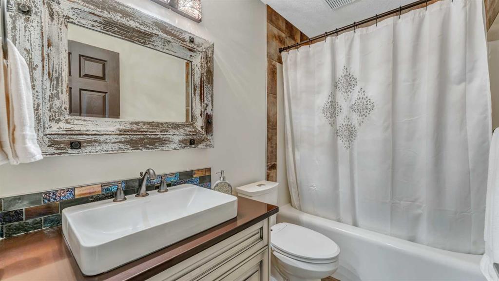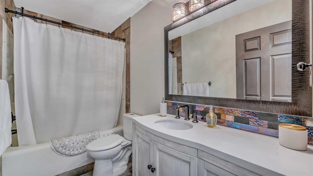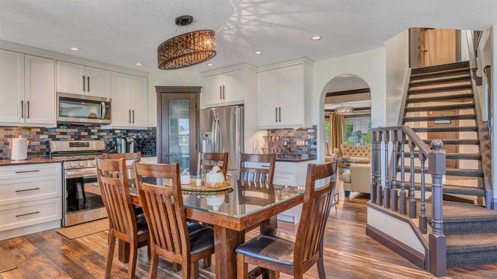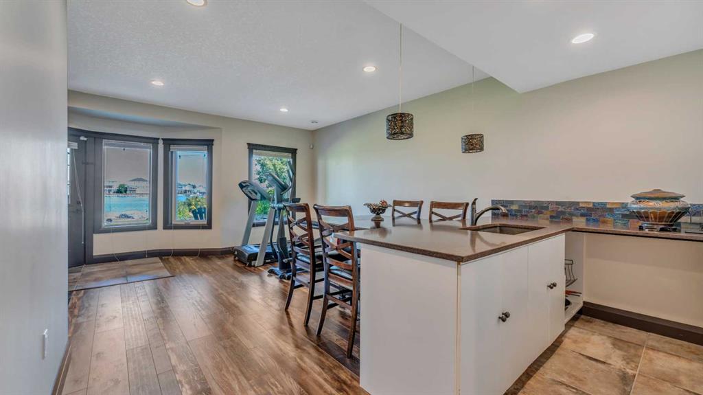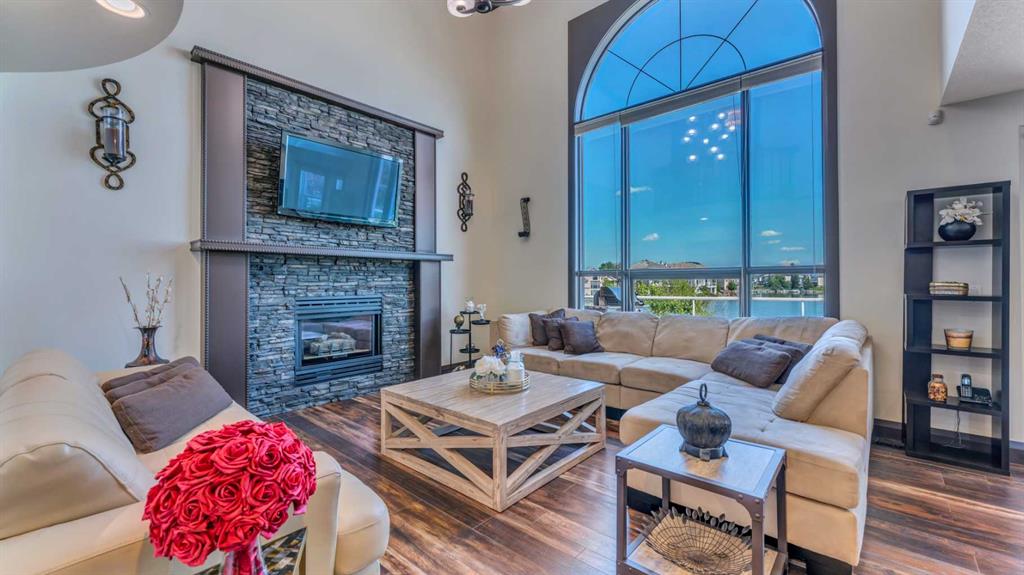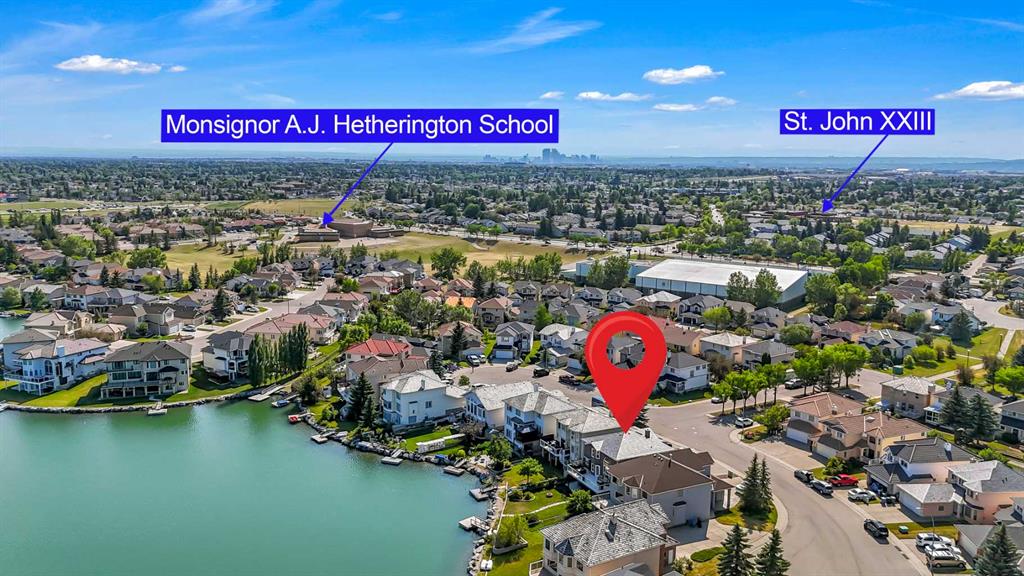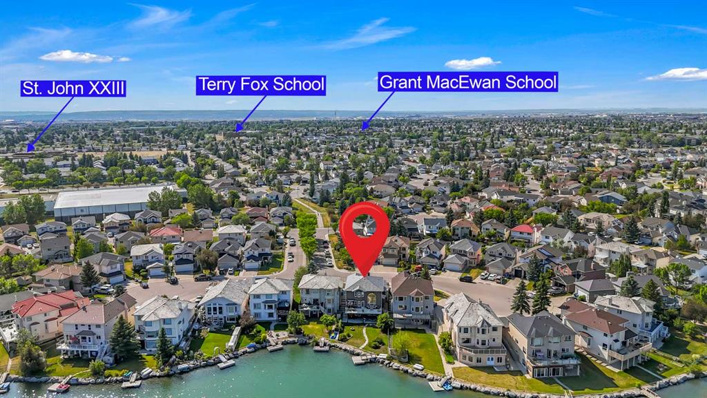 BACKING ONTO LAKE WITH A PRIVATE DOCK | BEAUTIFULLY RENOVATED | 5 BEDROOMS + DEN | LAKE VIEWS FROM EVERY LEVEL | LUXURIOUS WALKOUT | BEDROOM & FULL BATH ON THE MAIN FLOOR | Nestled on a quiet cul-de-sac and set on an extra-deep 132’ lot, this beautifully renovated lakefront home blends timeless design with an unmatched lakeside lifestyle. Enjoy direct water access from your private dock, multiple outdoor living spaces and captivating views from every level. The elegant stucco exterior, inviting front porch and durable metal roof provide lasting appeal and peace of mind. Inside, rich flooring, crown moldings and refined lighting elevate the home’s character. A bayed front living room sets the stage for formal gatherings, while the private den offers a quiet workspace. At the heart of the home, the family room impresses with soaring cathedral ceilings, a statement gas fireplace with stone surround and expansive windows that frame the sparkling lake. The adjoining dining room, wrapped in bayed windows, opens onto the full-width upper deck, ideal for seamless indoor/outdoor entertaining. Culinary creativity is inspired in the gourmet kitchen featuring full-height shaker cabinetry, stainless steel appliances including a gas stove, upgraded backsplash, pantry and generous counter space for everyday prep or hosting. A versatile main floor bedroom (or 2nd den) and full 4-piece bathroom add flexibility for guests or multigenerational living. Upstairs, crown moldings continue through four spacious bedrooms, including a serene primary suite with a cozy sitting area, walk-in closet and a spa-inspired ensuite with dual sinks and an oversized tiled shower, all framed by sweeping lake views. A second 4-piece bath serves the additional bedrooms, one of which overlooks the family room below and can be closed for privacy. The fully finished walkout basement expands your living space with a flexible recreation zone for media, games or fitness, opening directly to the covered patio and landscaped yard. A stylish wet bar with peninsula seating enhances entertaining, while a 5th bedroom and full 4-piece bath create a private retreat for guests or extended family. Outside, lush landscaping leads to a paver stone patio and firepit overlooking the water, offering the perfect spot to unwind at sunset. A private dock invites swimming, paddling or simply relaxing by the lake. Additional highlights include a double attached garage, two high-efficiency furnaces and ample storage. Located in Calgary’s only Californian-themed lake community, residents enjoy year-round recreation - beach days, skating, green spaces, walking paths and community events all within walking distance of schools, parks, shopping and services. A truly exceptional home offering luxury, comfort and the best of lakeside living!