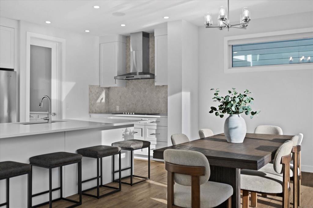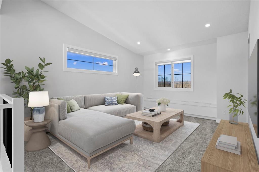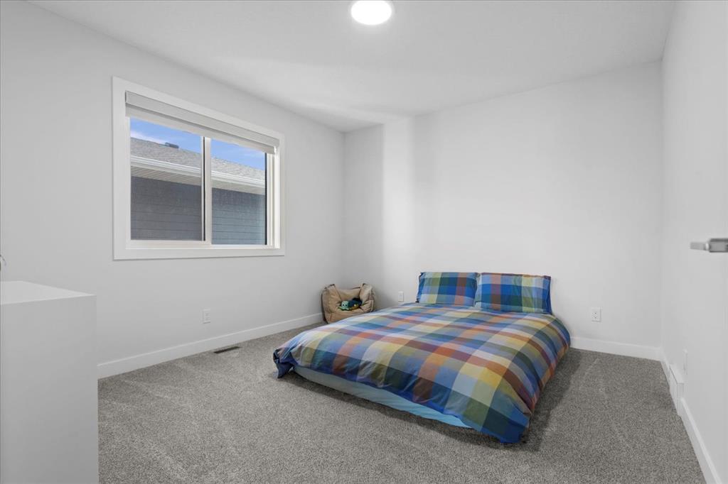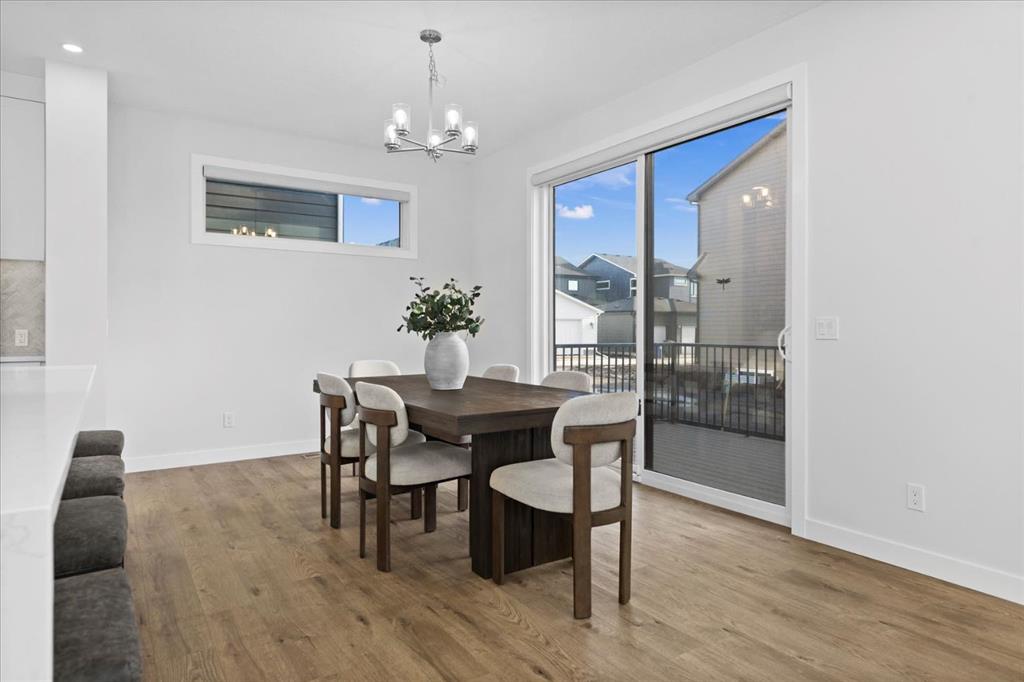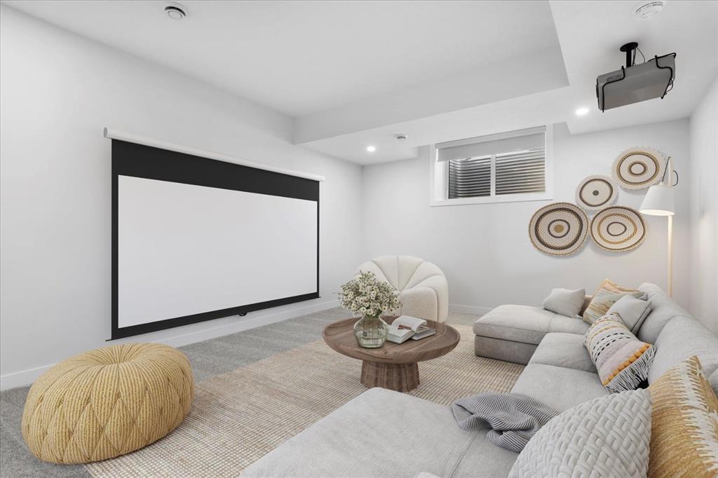 A beautifully crafted 2025-built Amber model by Sterling Homes, ideally situated on a premium corner lot in the sought-after community of Harmony. Offering over 3,750 sq ft of fully developed living space, 5 bedrooms, and more than $120,000 in upgrades, this home is truly exceptional. Barely lived in and meticulously maintained, it shows like new and is ready for immediate possession. The modern stone exterior and clean architectural lines create a striking first impression, while the corner-lot placement allows for large windows throughout and an open, airy feel. Located directly across from green space and pathways, the setting offers privacy and a strong connection to the outdoors. Inside, the open-concept main floor is designed for everyday comfort and entertaining, featuring soaring ceilings and wide plank flooring throughout the main and upper levels. The living room is anchored by a stunning floor-to-ceiling fireplace that serves as a statement feature, adding warmth and architectural presence. A private main-floor office and stylish powder room add functionality without disrupting the flow. The kitchen is the heart of the home, designed for gathering and hosting, with quartz countertops, an oversized island, stainless steel appliances, a beverage fridge, and a walk-in pantry, all open to the main living and dining areas. A custom mudroom with built-ins off the double attached garage keeps daily life organized. Upstairs, the home opens to below, enhancing the sense of space. The primary retreat offers a peaceful escape with large windows, including an additional upgraded west-facing window positioned to capture sunset and mountain views, a spacious walk-in closet, and a spa-inspired 5-piece ensuite with quartz countertops, a freestanding soaker tub, and a walk-in shower with built-ins. Two additional generously sized bedrooms with walk-in closets are located on the opposite side of the level, alongside a well-appointed 5-piece bathroom. The bonus room features built-in benches and large windows overlooking the green space and park, creating an inviting space for relaxed family time, while the upper laundry room is conveniently located nearby. The fully finished basement completes the home with a large recreation area perfect for games nights and entertaining, a wet bar, and double French doors leading to a versatile space ideal as a private theatre, home office, or guest room, along with a fifth bedroom and full bathroom. Built with family living in mind, this home offers generous spaces and a layout that supports everyday routines. Outside, a rear deck invites summer evenings, while the unfinished landscaping provides a blank canvas for your outdoor vision. All of this is paired with the exceptional amenities Harmony is known for, including lake access, golf, scenic pathways, and a vibrant community atmosphere.