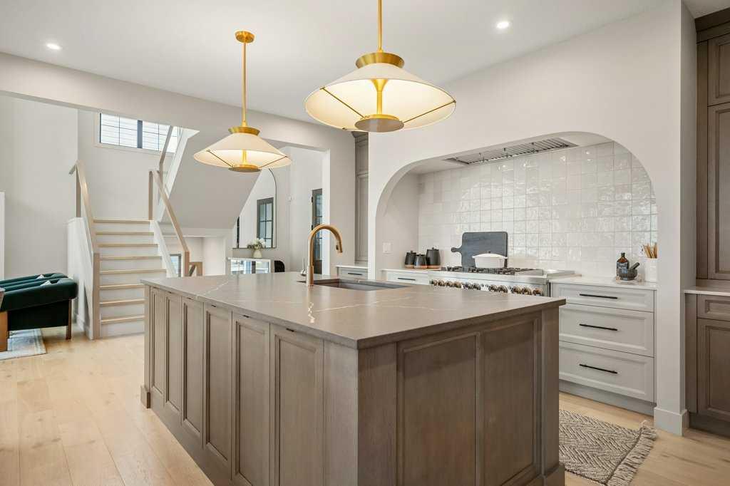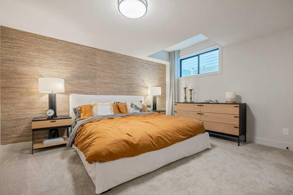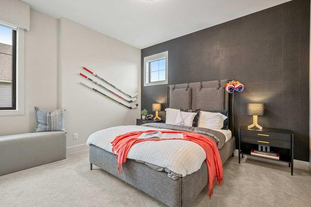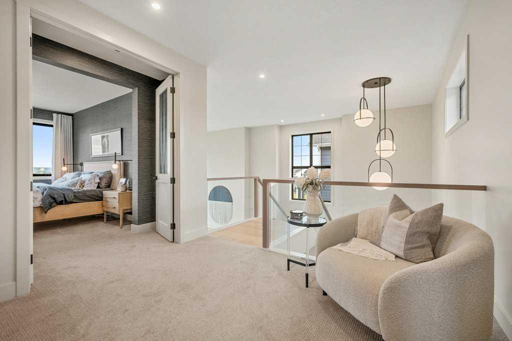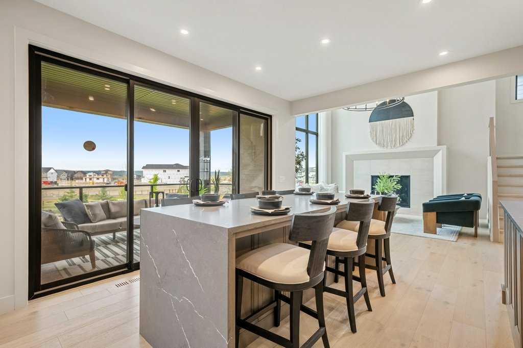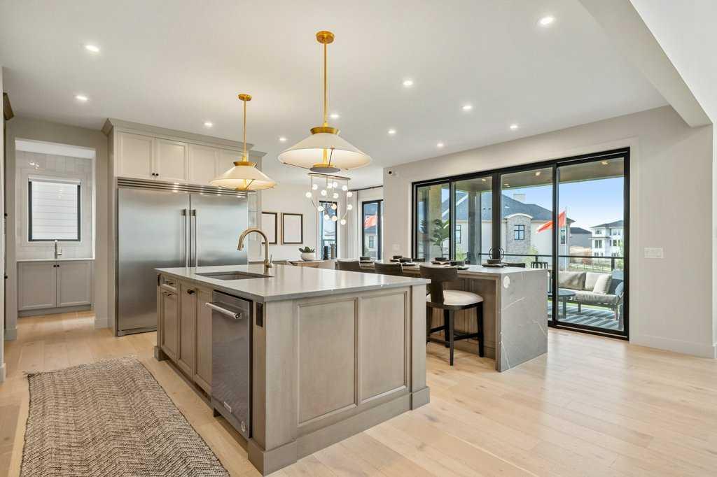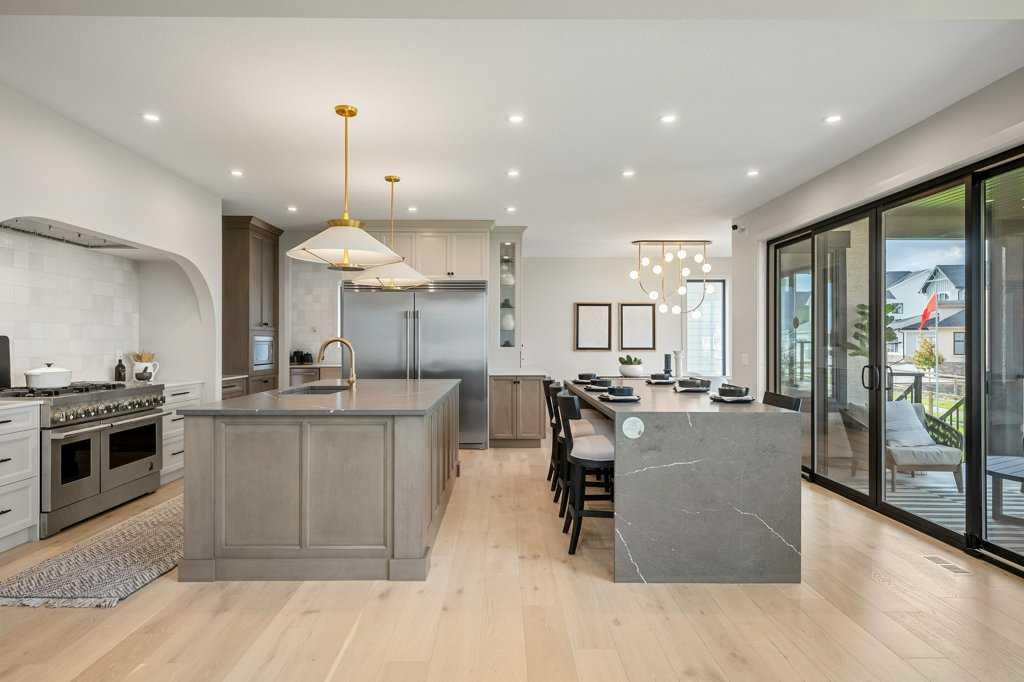 Lake side living at its finest! Presenting the Scarlett Show Home built by Baywest Homes. Ideal for the modern family at just over 5,000 square feet of total developed space, featuring 4 bedrooms, plus generous living and gathering spaces all wrapped in an abundance of style, design and the over-the-top upgrades you would expect in Harmony Estates. Gemstone lighting, a triple front garage, central air, custom window treatments and lighting, a grand open to above, covered deck, 4 full baths, a gym, butlers pantry, generous size mudroom and enclosed front den. Enter into engineered flooring, dual island concept in the kitchen within the themed concept of entertaining and hosting, side by side professional fridge, freezer and gas stove. Built in's throughout the main floor space including the dining area, butlers pantry, den and lower level recreation room. The 'WOW' factor offered from the open to above lifestyle room with its focal 2 story fireplace offers natural light throughout this space. The family convenience of a spacious mudroom located off the butlers pantry, secondary pantry with a corridor hall connecting the front foyer hidden behind the stunning main floor design. An upper floor created for personal space, but welcoming to all. The 3 upper bedrooms situated to the front of the home smartly designed with a 5-peice Jack and Jill en-suite opposite the 3rd bedroom with its own private 4-peice en-suite bath. The laundry area is located just off the bridge access to this level and rests beside the vaulted bonus room. Dual door access to the rear primary bedroom overlooking the green space and walking paths with heated floors in the 5-piece en-suite bath, a full size shower, soaker tub, full width vanity, his and her sinks, an abundance of storage giving off the 5 star hotel vibes from the hanging mirrors to the faucets and fixtures. A lower level for room to relax and gather with a recreation room, wet bar, 5th bedroom and a pocket door to the 4-piece lower bath with heated floors from the curated gym space. Your outdoor space has a covered deck with access to the walking paths, a short trip to current and future local amenities as well as the beach club, Launchpad and Mickelson National Golf Course.