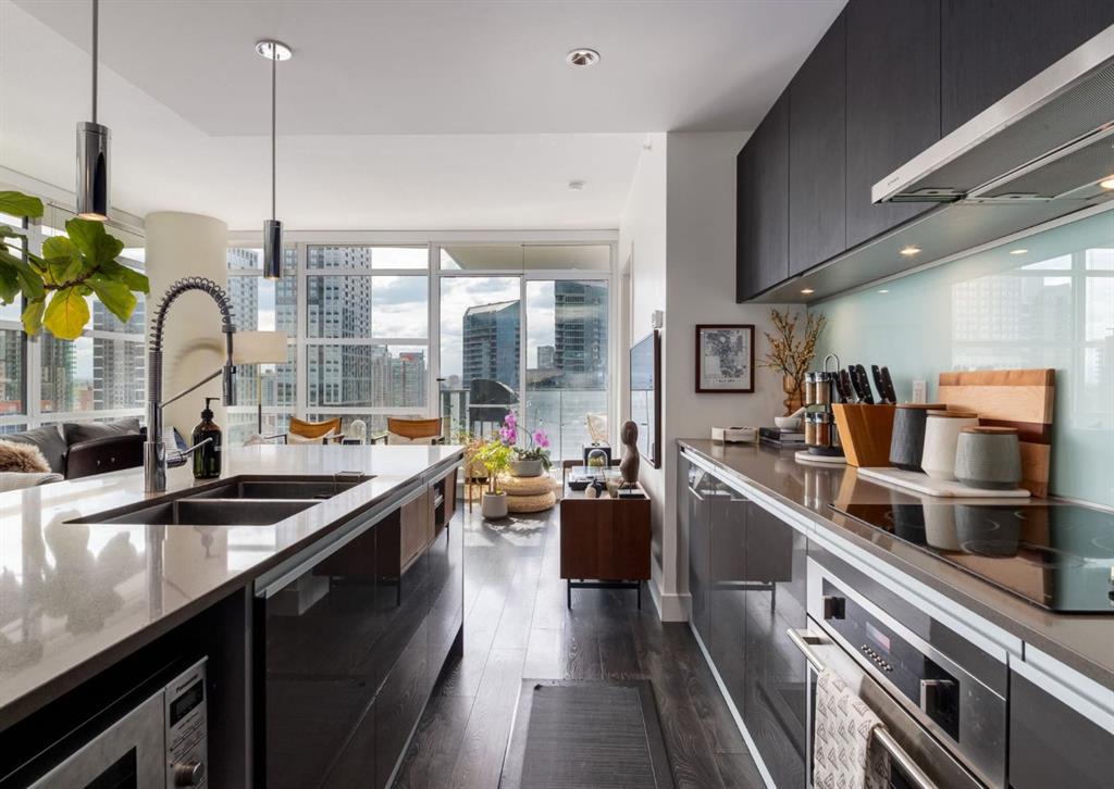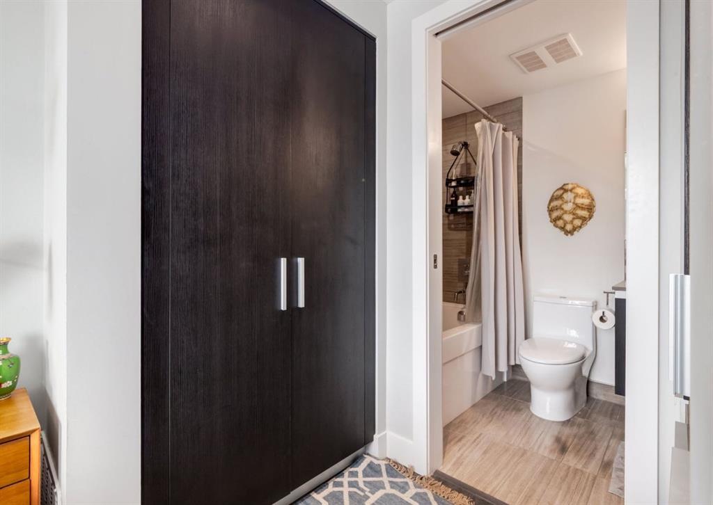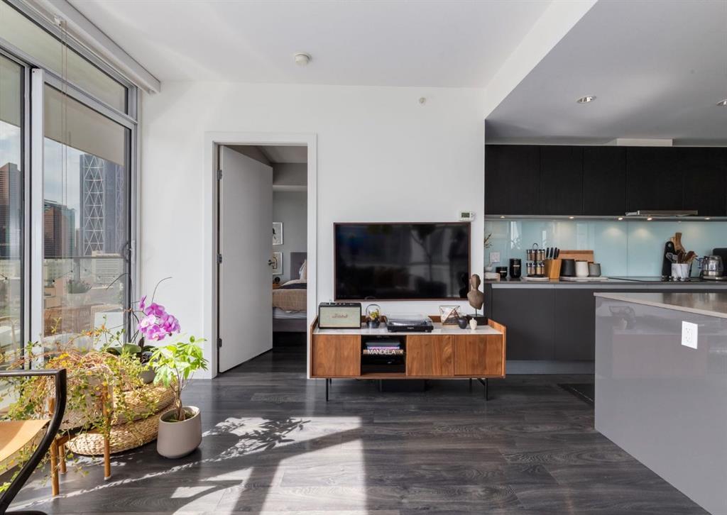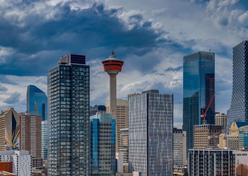 CITY & MOUNTAIN VIEWS from this stunning southwest corner unit! This bright and welcoming open-concept home is filled with natural light and offers 2 bedrooms, 2 full bathrooms, tandem titled parking for two vehicles, and a large balcony with breathtaking views you’ll enjoy every day. The modern kitchen features sleek cabinetry, stainless steel appliances including panelled refrigeration, quartz countertops, and plenty of storage. The primary bedroom easily fits a king-size bed and includes a walk-through closet with custom built-ins leading to a contemporary ensuite. The second bedroom is conveniently located next to a full 3-piece bathroom—perfect for guests, roommates, or a home office. Enjoy the perks of this executive concrete building, which offers concierge service, a fitness centre, party room, rooftop terrace, workshop, air conditioning, high-speed elevators, visitor parking, and a separate assigned storage locker. Impeccably maintained by its original owners, this move-in-ready home is also pet friendly (with board approval) and ideally located—just steps from Pixel Park, river pathways, the LRT, Stampede Grounds, Central Library, restaurants, cafes, shops, and groceries. Floor plans and a 3D tour are readily available, providing a glimpse into this stylish condo!