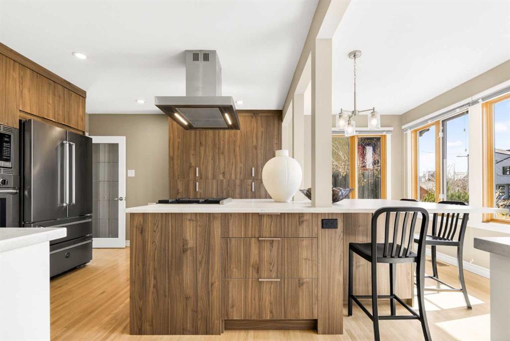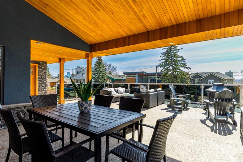 In an era of generic luxury, this striking home, with architectural lines redefined by Architect Richard Davignon, is an elevated sanctuary for the active, executive family. Sprawling over 4,000 square feet of developed living space on a generous 75’ wide lot, this residence perfectly bridges a vibrant inner-city lifestyle with seamless access to the mountains. William Blake Homes was enlisted to execute the dramatic primary suite, while Marvel Kitchens designed the heart of the home, a sophisticated culinary hub focused on performance. It features a massive quartz island with glimpses of the downtown skyline, high-end appliances, clever cabinetry, and a dedicated coffee bar area. Adjacent, the Davignon designed studio, built over the garage space, is an exercise in intentional, architectural detail; defined by soaring ceilings and an expansive gas fireplace, this light-filled space offers independent front and back exterior access, serving effortlessly as a professional home office option or the home's primary gathering hub. Ascend to the primary suite, a masterwork by William Blake Homes. The private balcony offers cinematic, dual-directional views of both the city skyline and the Rocky Mountains. A study in quiet luxury, the suite features 12ft vaulted ceilings, a sunroom, and a meticulous 5-piece ensuite where heated floors extend even into the shower, complemented by a deep soaker tub and heated towel rack. The remainder of the upper level houses 2 additional generously-sized bedrooms with substantial closets, and a large family bath, all positioned at the rear of the home for ultimate privacy. The lower levels are equally purposeful: the north side offers a self-contained retreat with a family room, bedroom, bath, kitchenette type space, and laundry, ideal for teens, nannies, or generational living. The south side transitions into the ultimate active base, featuring a home gym (or 5th bedroom) and a dedicated gear room for ski tuning, bike maintenance or storage, complete with a cold room for wine. This leads to the attached triple garage, a core feature for the collector, redefined with over-height ceilings to accommodate a car lift and an innovative tandem bay. Outdoor living is prioritized through a series of defined spaces, beginning with a partially covered, south-facing patio off the entrance that facilitates effortless alfresco dining or a glass of wine while taking in the views. The private, tiered backyard is an entertainment retreat featuring multi-level decking, a hot tub, elevated flat space to play, and a double parking pad off the back lane. The front yard presents a sophisticated, climate-conscious xeriscape for a low-maintenance lifestyle. Located within walking distance to amenities and offering rapid access to the Children’s and Foothills Hospitals, the U of C, The Calgary Winter Club and downtown, the home is finished with enduring materials, including a 50-yr blue metal roof, upgraded insulation, and an efficient multi-zoned heating system.