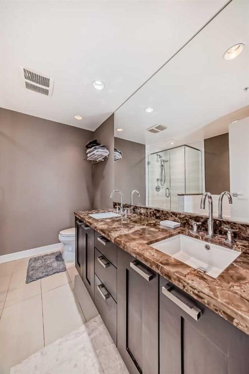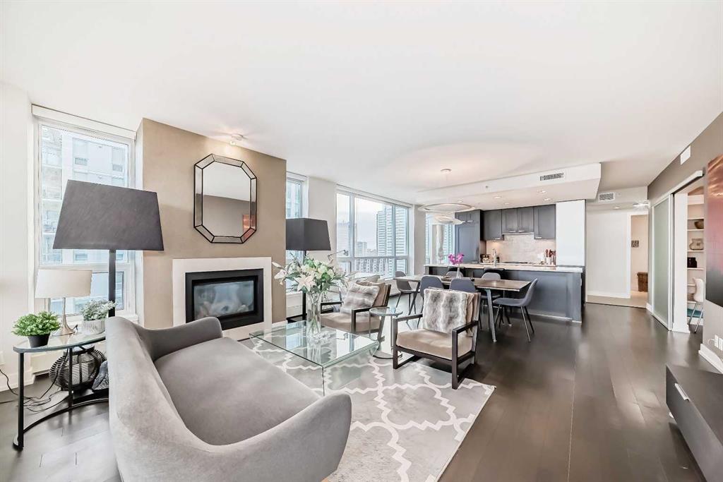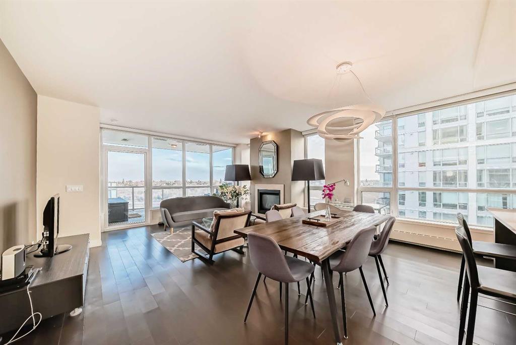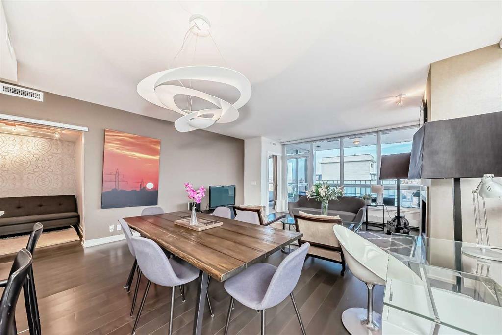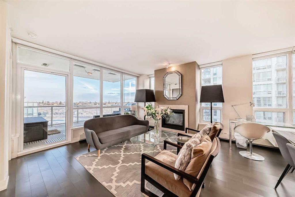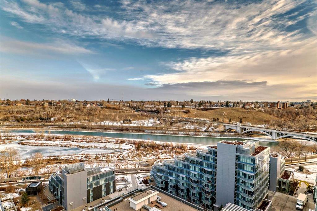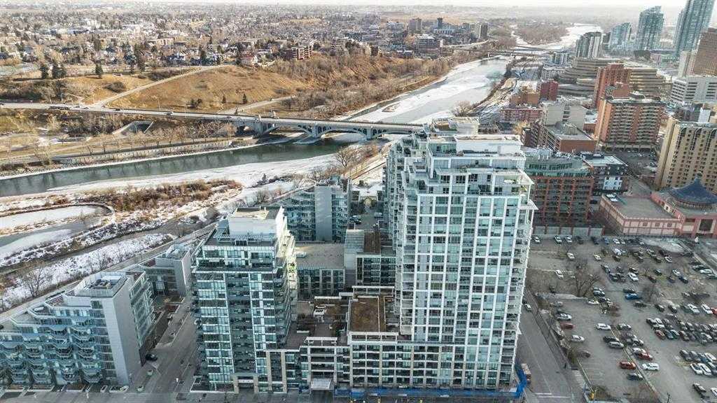 Welcome to the 17th floor of the prestigious Waterfront Calgary Towers. This spacious 2-bedroom corner unit offers stunning views of the Bow River, Centre Street Bridge, Prince's Island Park and downtown. Bright and airy with floor-to-ceiling windows, the open-concept layout seamlessly connects the living, dining, and kitchen areas—ideal for everyday living and entertaining. The modern kitchen features a gas cooktop, built-in oven, and a large quartz island. The primary bedroom offers a private retreat with walk-in closets and a luxurious ensuite. The second bedroom includes large windows and ample closet space, perfect for guests or family. A full 3-piece bathroom and dedicated office/den add flexibility for today’s lifestyle. Enjoy the private balcony with impressive city and river views. Additional features include in-suite laundry and two heated underground side-by-side parking stalls directly behind the elevator for maximum convenience. Residents enjoy access to premium amenities including concierge service, fitness centre, hot tub, and social lounge. Pet-friendly building with nearby river pathways and green spaces. Unbeatable downtown location close to shopping, dining, public transit, and the Bow River pathway system. Many upgrades include California Closets in the primary and second bedrooms as well as the laundry area, along with upgraded blinds. Exceptional value in one of Calgary’s most sought-after communities.