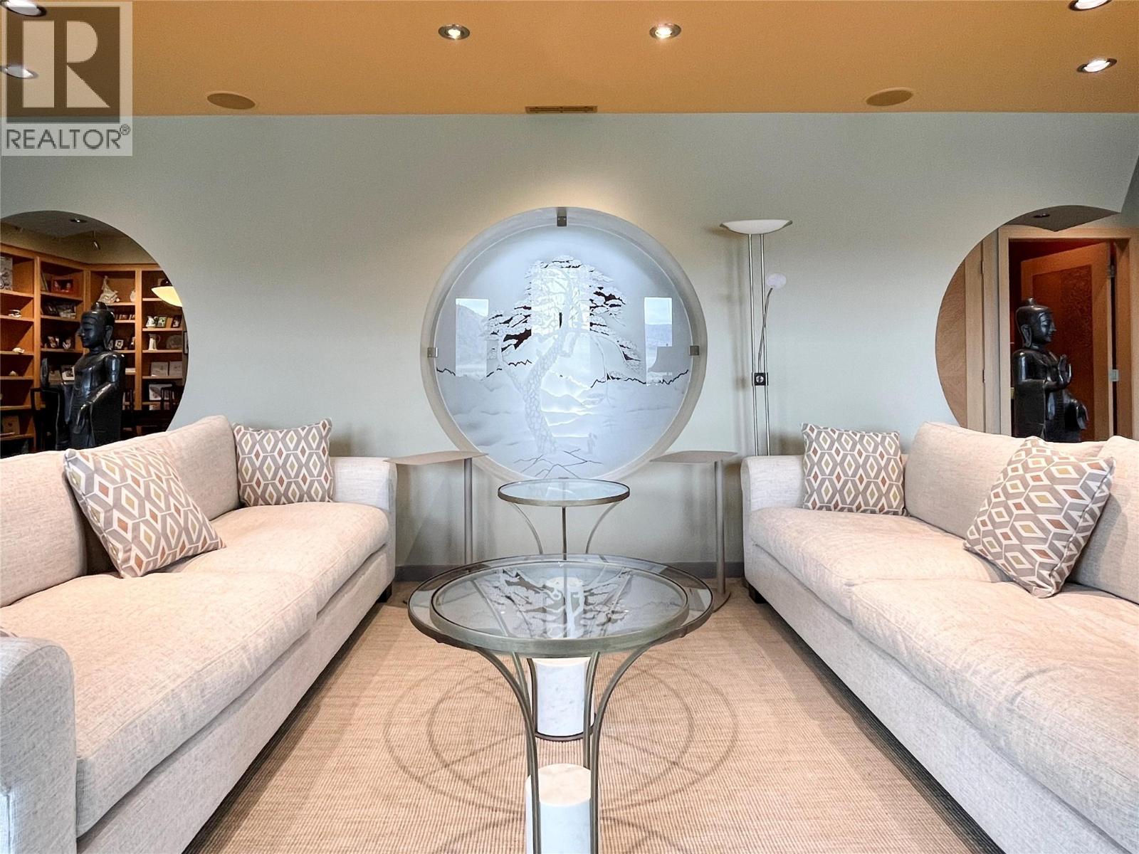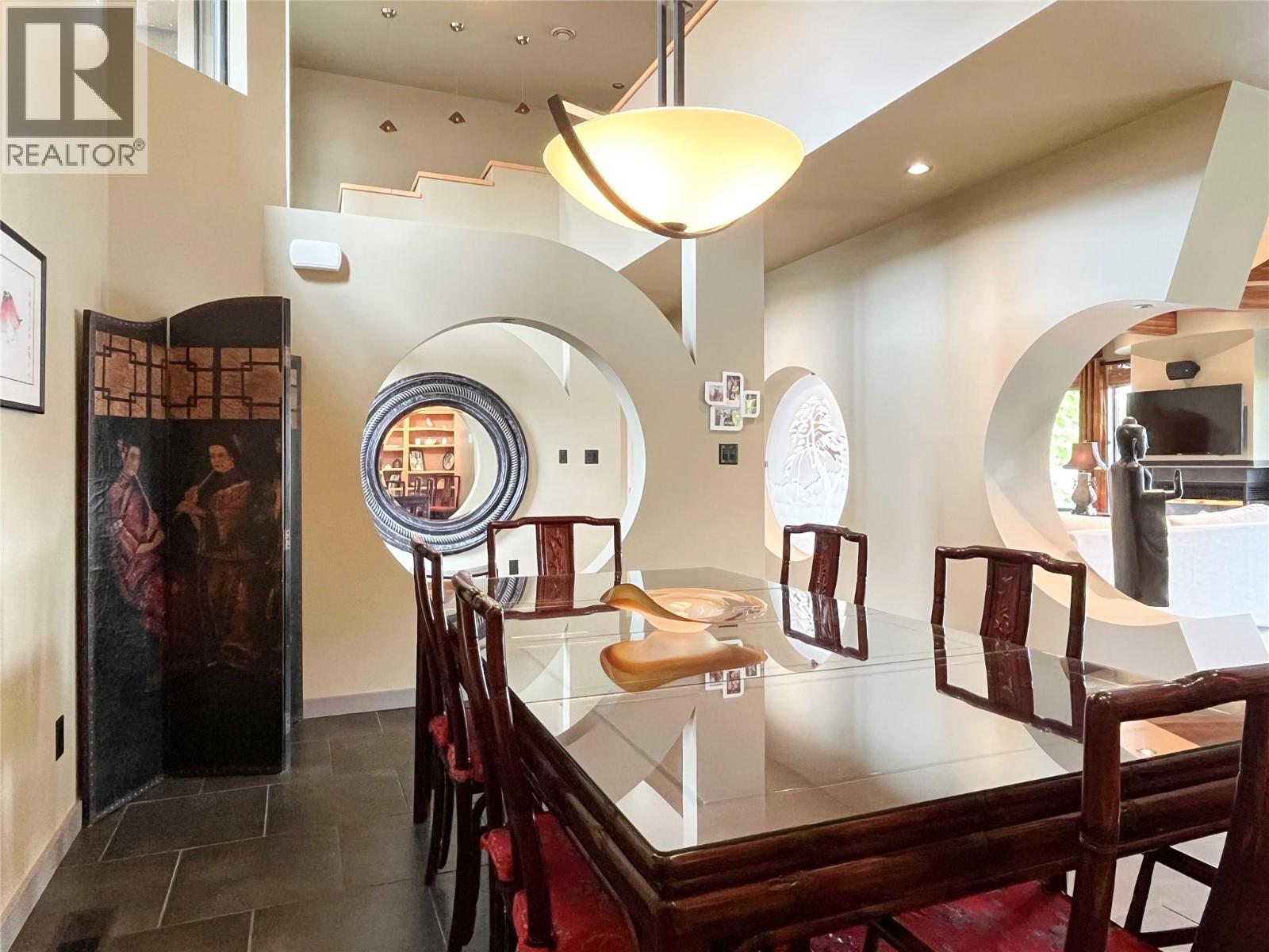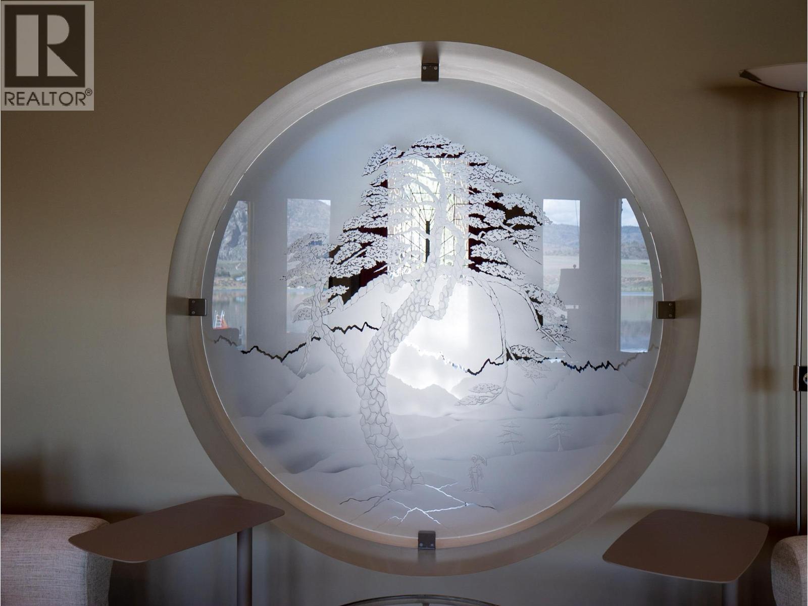 ""The Rising Sun"", a unique architectural masterpiece located on the shores of Osoyoos Lake will definitely captivate your senses. Crafted by the visionary designer Paul Nesbitt, founder of Nesbitt Originals, this extraordinary home is situated on nearly half an acre property with 90ft of waterfront, and it is meticulously aligned along an east-west axis, perfectly harmonizing with the sunrise and symbolizing renewal and balance. The front courtyard features Asian architectural elements that connect the two detached garages to the house with elegant arches and columns. The livingroom has a sun-shaped ceiling, exposed beams, circular drywall accents and hand-sculpted glass accents. Inside, a cozy gas fireplace paired with an outdoor wood-burning fireplace add warmth to the whole home. The central geothermal system with radiant in-floor heating and cooling ensures total comfort. The master bedroom has his and her ensuites and walk-in closets, while the upper loft has two guest bedrooms with ensuites. The property is fully fenced and features a circular driveway, a central zen garden and electronically controlled gates. The 2 detached garages also feature in-floor heating and wall heat pumps. The rear yard includes a pebbly beach and a portable boat dock. Celebrated for its Asian-inspired design and unique architecture, ""The Rising Sun"" has been featured in Best Home Magazines, standing out as a true gem in the South Okanagan. Full Info package available upon request.