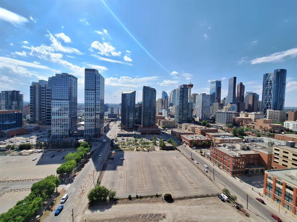 Welcome to the 18th floor of South Guardian Tower—this bright and spacious one-bedroom, one-bathroom condo in the South Tower offers stunning views of downtown Calgary and the mountains. Expansive windows fill the space with natural light while showcasing breathtaking scenery. The open-concept kitchen is designed for both functionality and style, featuring a central island, quartz countertops, and stainless steel appliances—perfect for cooking and entertaining. The bedroom offers floor-to-ceiling windows, a walk-through closet, and access to a sleek four-piece bathroom. Enjoy the views from your living room or step out onto your oversized private balcony to take it all in. This unit also includes a titled underground parking stall, a storage unit, and access to premium building amenities, including a modern fitness center (6th floor), yoga studio, social lounge with a garden terrace, and a meeting space. Ideally located across from the Calgary Stampede grounds and Cowboys Casino, you’re just steps from events, entertainment, dining, cafes, and boutique shopping, with quick access to Macleod Trail and Deerfoot Trail. Don’t miss this opportunity, book your private viewing today and be sure to check out the virtual tour!