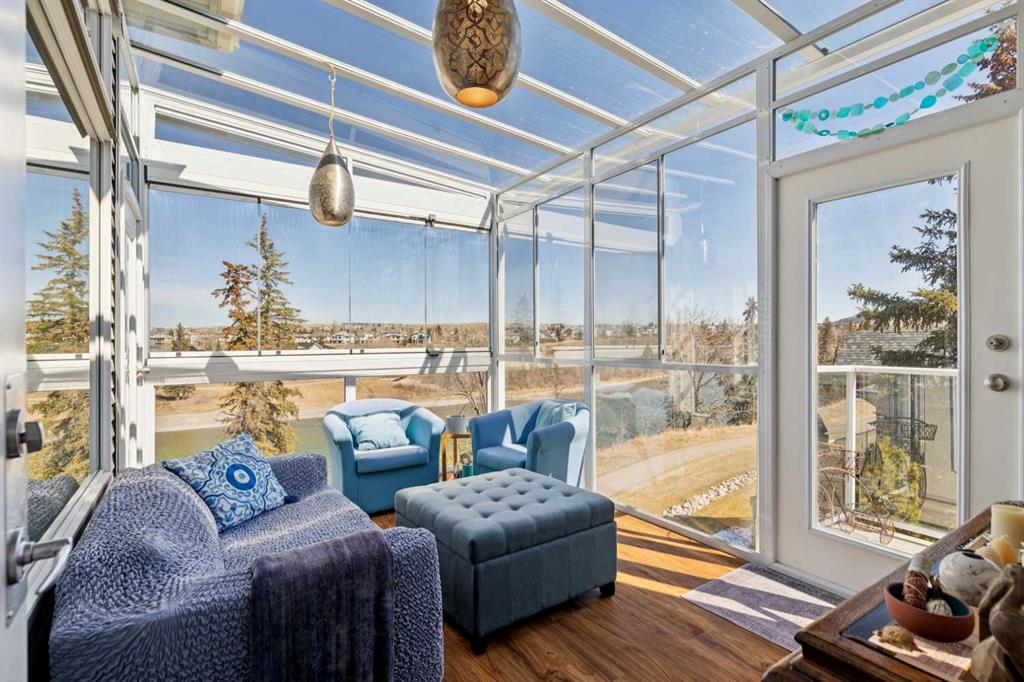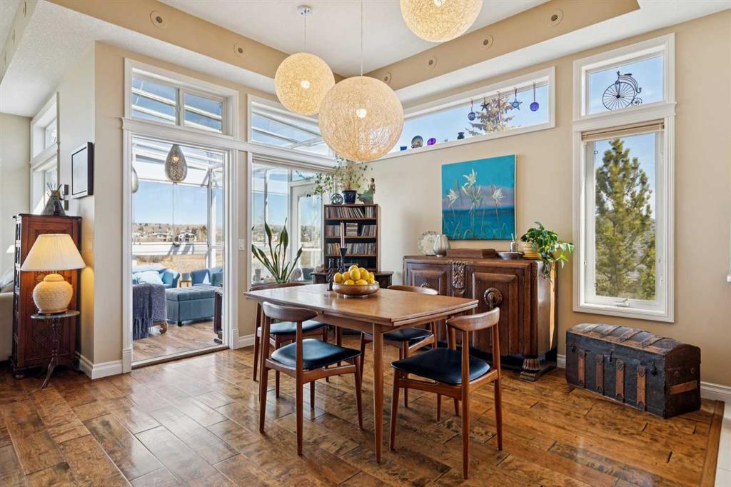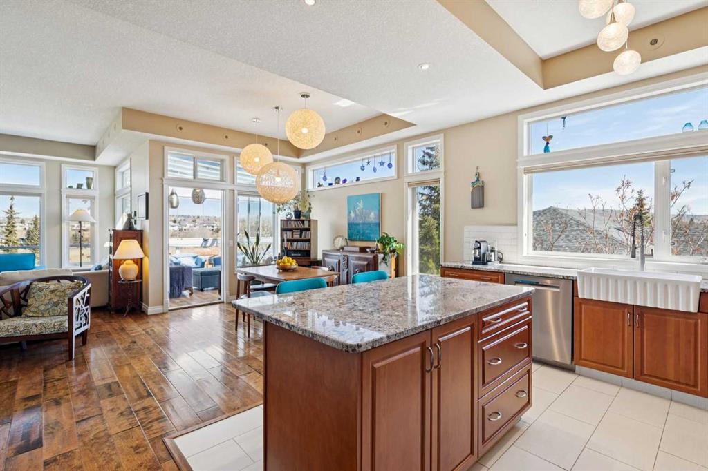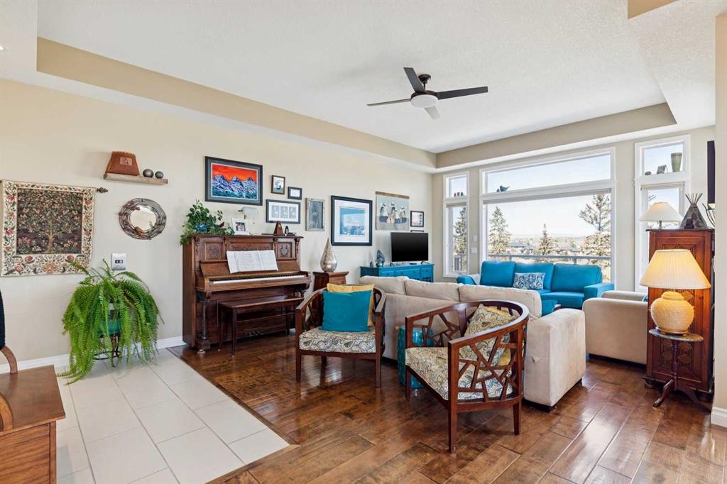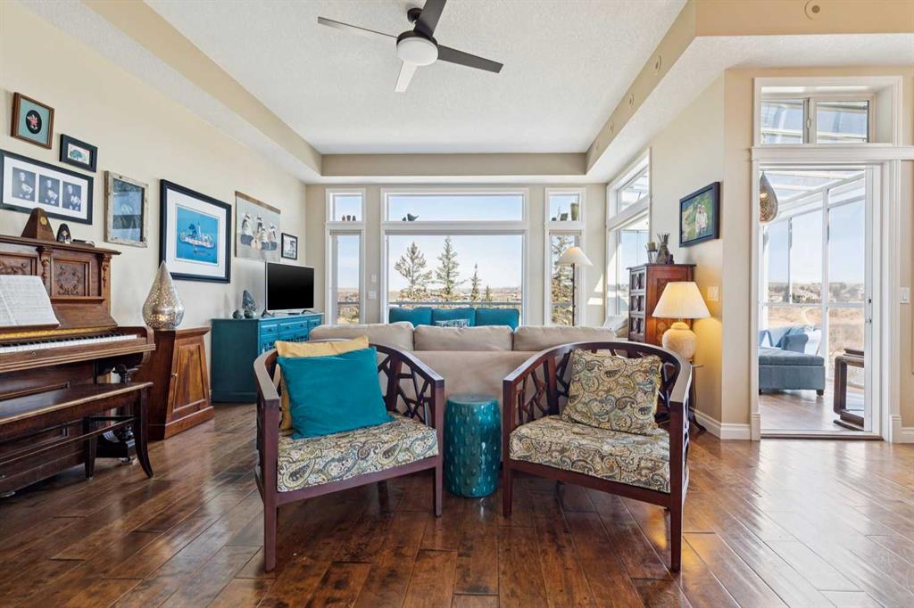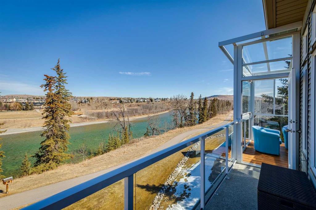 WOW! Prepare to be impressed by this stunning, ultra-stylish, recently updated TOP FLOOR condo offering breathtaking, UNOBSTRUCTED VIEWS of the Bow River, River valley and ROCKY MOUNTAINS! This exceptional home delivers a truly unique lifestyle, featuring a PRIVATE ELEVATOR with direct access to your unit and a HEATED DOUBLE GARAGE with additional storage. Nestled along the Bow River and Jumping Pound Creek, this tranquil setting is surrounded by scenic pathways, creating the perfect backdrop for relaxing, entertaining, and enjoying the outdoors year-round. Inside, the home is flooded with natural light, showcasing soaring 10-foot ceilings and beautiful engineered flooring throughout. The open-concept main living area is both elegant and functional, highlighted by a modern kitchen complete with a gas stove, stainless steel appliances, and granite countertops—ideal for hosting or everyday living. To the front of the unit, you’ll find two spacious bedrooms, including a large primary retreat with a luxurious 4-piece ensuite featuring a soaker tub. A second 4-piece bathroom also offers granite countertops. A bright and spacious office provides an ideal work-from-home space. This home is loaded with premium features, including AIR CONDITIONING and convenient ATTIC STORAGE for seasonal items. Recent upgrades elevate both comfort and style, including a STUNNING 3 SEASON SUNROOM ($34,000 ), new sliding doors and designer lighting throughout the entire home. Additional updates include LG washer and dryer (Nov 2023), Whirlpool refrigerator (2022), and Bosch dishwasher (2025). With unparalleled views, upscale finishes, and a serene natural setting, this is a rare opportunity to enjoy refined riverside living at its finest. Book your showing today!!