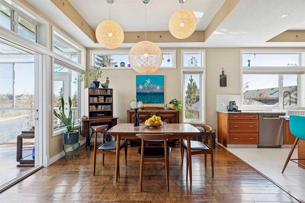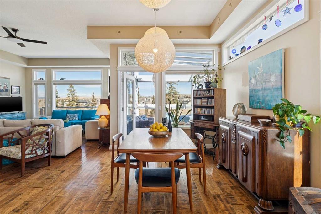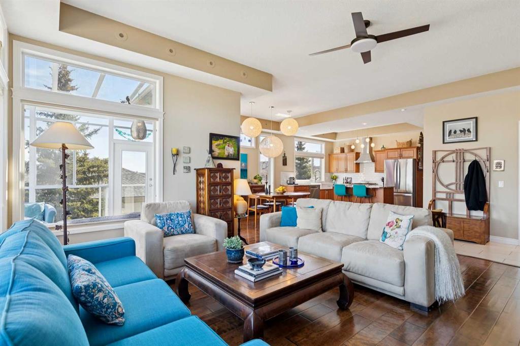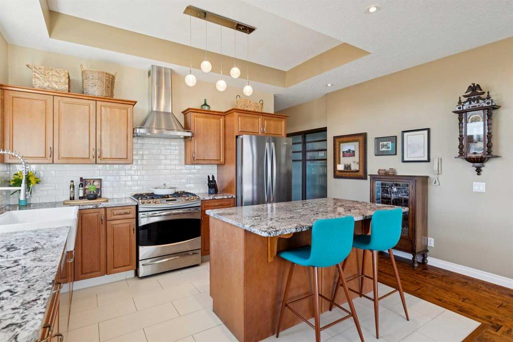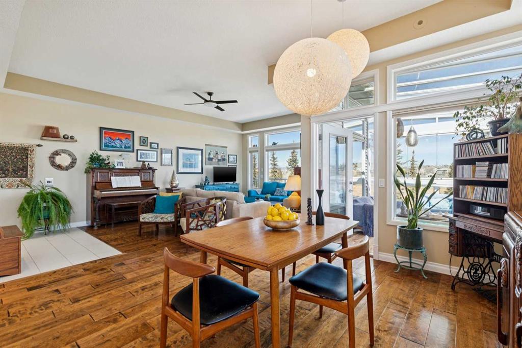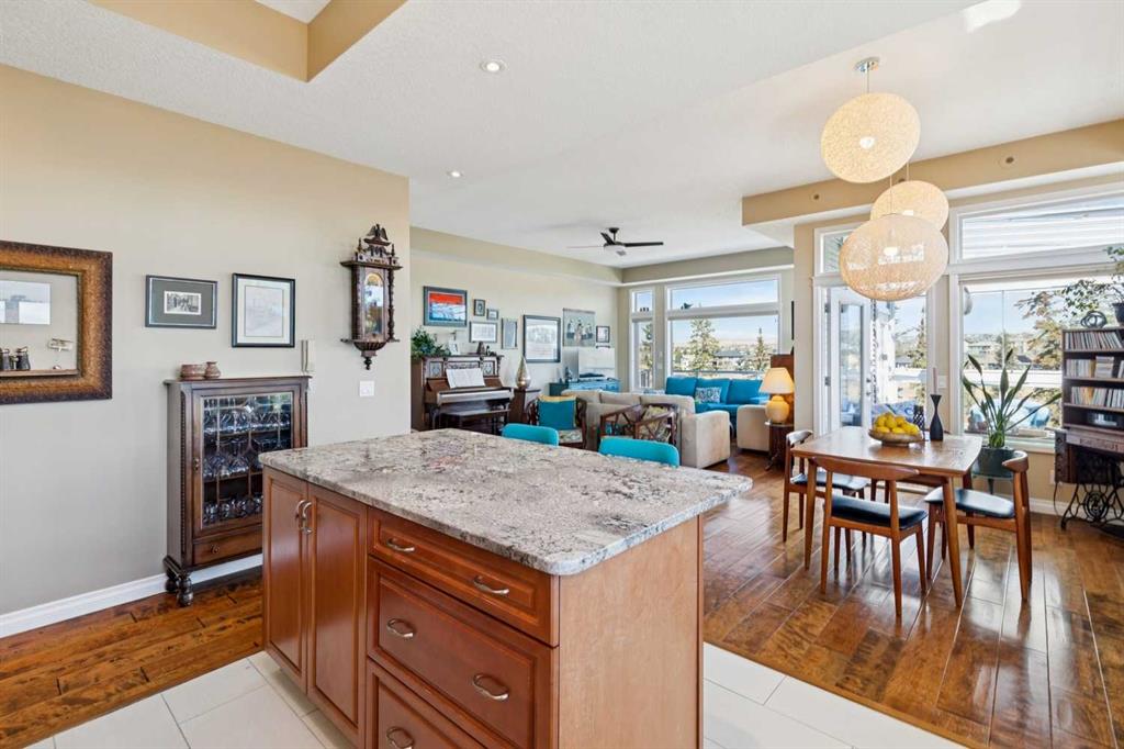 WOW! Prepare to be impressed by this stunning, ultra-stylish, recently updated TOP FLOOR condo offering breathtaking, UNOBSTRUCTED VIEWS of the Bow River, River valley and ROCKY MOUNTAINS! This exceptional home delivers a truly unique lifestyle, featuring a PRIVATE ELEVATOR with direct access to your unit and a HEATED DOUBLE GARAGE with additional storage. Nestled along the Bow River and Jumping Pound Creek, this tranquil setting is surrounded by scenic pathways, creating the perfect backdrop for relaxing, entertaining, and enjoying the outdoors year-round. Inside, the home is flooded with natural light, showcasing soaring 10-foot ceilings and beautiful engineered flooring throughout. The open-concept main living area is both elegant and functional, highlighted by a modern kitchen complete with a gas stove, stainless steel appliances, and granite countertops—ideal for hosting or everyday living. To the front of the unit, you’ll find two spacious bedrooms, including a large primary retreat with a luxurious 4-piece ensuite featuring a soaker tub. A second 4-piece bathroom also offers granite countertops. A bright and spacious office provides an ideal work-from-home space. This home is loaded with premium features, including AIR CONDITIONING and convenient ATTIC STORAGE for seasonal items. Recent upgrades elevate both comfort and style, including a STUNNING 3 SEASON SUNROOM ($34,000 ), new sliding doors and designer lighting throughout the entire home. Additional updates include LG washer and dryer (Nov 2023), Whirlpool refrigerator (2022), and Bosch dishwasher (2025). With unparalleled views, upscale finishes, and a serene natural setting, this is a rare opportunity to enjoy refined riverside living at its finest. Book your showing today!!