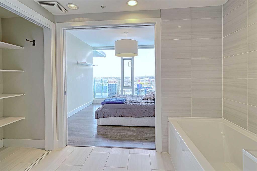 Welcome to an amazing condo with OUTSTANDING VIEWS of downtown Calgary, including the gorgeous Calgary Tower, Calgary Public Library, Studio Bell and Saddledome. Your future home is located on the 19th floor of the sought after EVOLUTION building, which is walking distance to a myriad of of amenities in the East Village, and downtown. This luxury unit offers a beautiful kitchen with GAS STOVE, huge stone countertop, and plenty of cupboards. There is a dining area, a cozy living room with access to a good size balcony, a bedroom with a posh 4PC ensuite and a walk-in closet. Both living room and the bedroom have FLOOR to CEILING windows facing south. ***Enjoy the spectacular views***