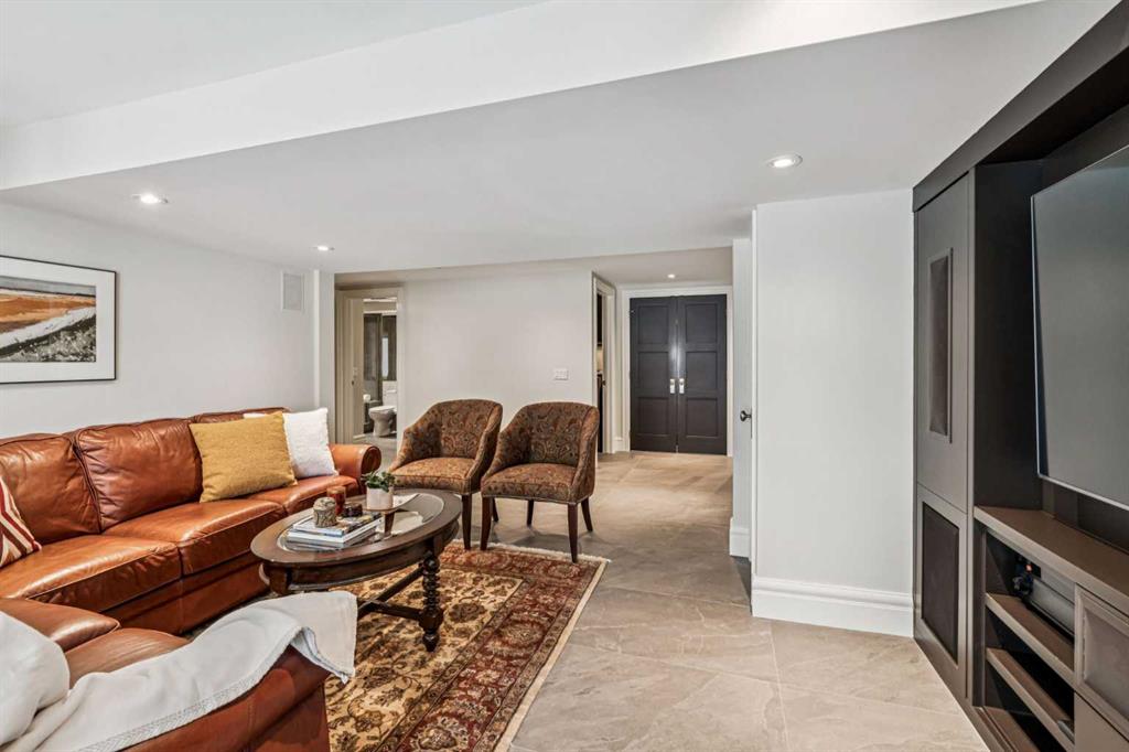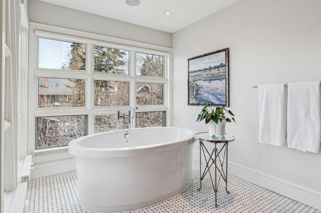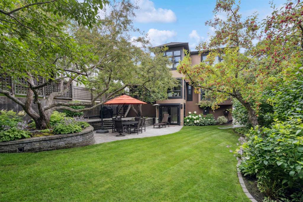 Discretely built into a Mount Royal hillside, this property is a jewel for those seeking a distinguished residence in an established neighbourhood. The home was rebuilt to the highest standard using the highest quality finishing materials. Interior design by Paul Levoie showcases outstanding features including hidden cabinetry, distinctive lighting, interesting fireplace surrounds and vaulted ceilings. The décor is a curated blend of Contemporary and Traditional elements, with a design is enduring and timeless. The MAIN LEVEL presents a two story foyer with a gorgeous chandelier, open plan living and dining area, kitchen with top of line appliances, sun filled breakfast nook over viewing the garden, full bath and two bedrooms ( one bedroom is used as an office). A cozy den with gas fireplace complete this level. The UPPER LEVEL is devoted to the Primary Oasis, offering a spacious bedroom, two walk-in closets and the most amazing ensuite - a true luxury spa with in-floor heat, twin vanities, dressing table, glass shower and a free standing soaker tub with views that embrace tree tops and the city centre. The LOWER WALK OUT LEVEL provides great extra spaces with access to the attached heated tandem two car garage, media room with fitness area, forth bedroom, full bath and laundry. Heated floors are controlled by three separate zones. Glass doors from the lower level give way to the most beautifully landscaped private retreat - a garden accentuated with mature deciduous and fruit trees, a wide assortment of perennial plantings, patio, lush lawn and a pond! Buddha resides in the pond and hopes to remain in his peaceful retreat. Lightly lived in, this notable home is a MOVE IN READY OPPORTUNITY.