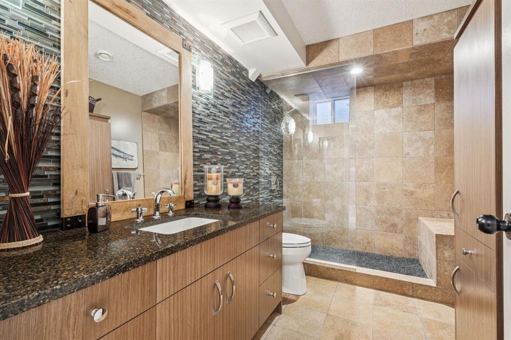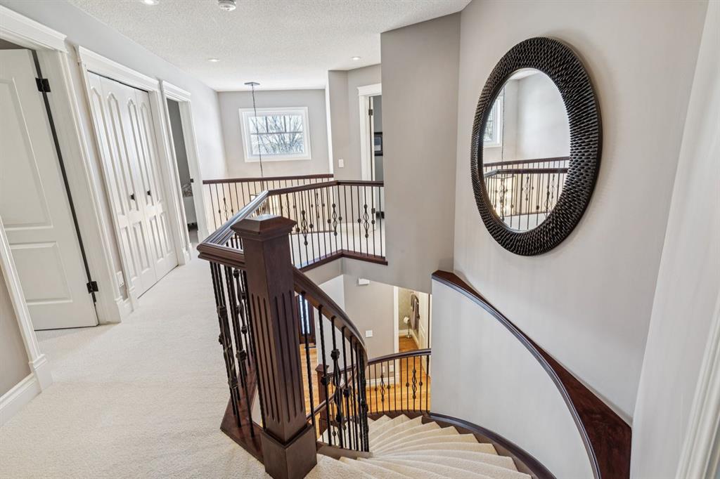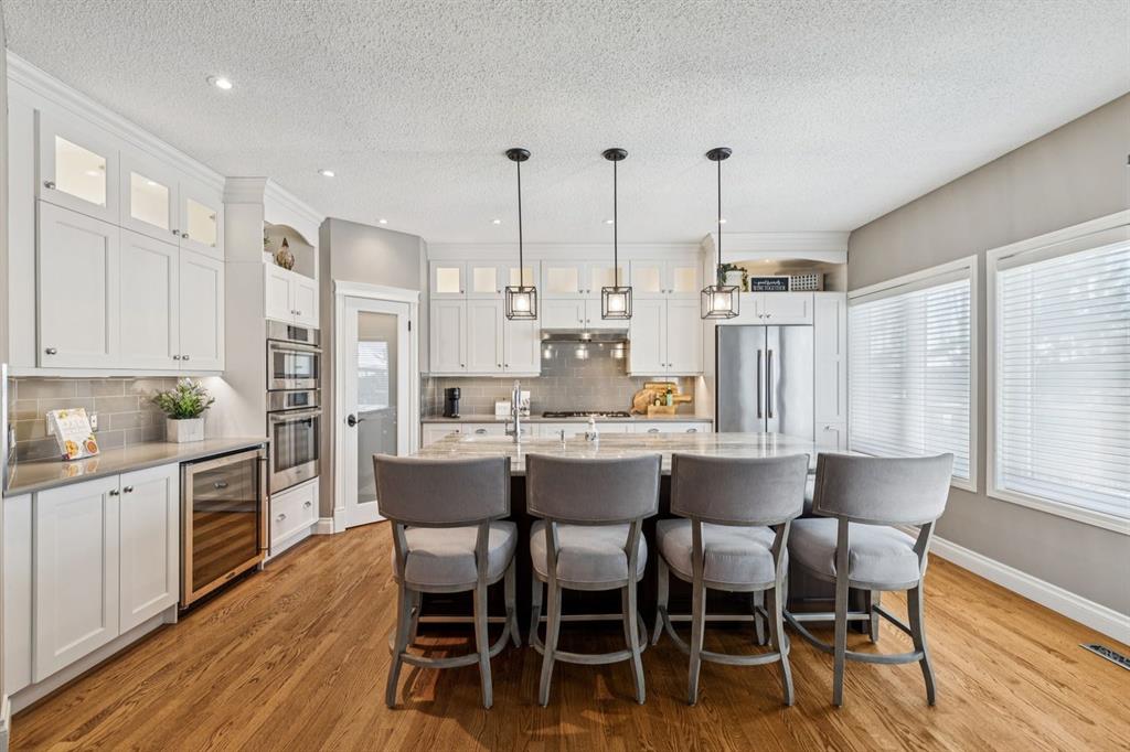 Absolutely immaculate and beautifully upgraded 2-storey walkout in the highly sought-after community of McKenzie Lake — offering lake living just in time for summer. In addition access to Mckenzie Lake Golf Course and walking distance to both public and catholic schools. From the moment you step inside, the pride of ownership is undeniable. The main floor features a stunning laundry room off the garage with custom cabinetry, a beautifully updated powder room, and a bright private office — perfect for working from home. Attention to detail is undeniably noticed for finishes and design. The layout flows seamlessly through the large formal living and dining areas into the warm and inviting family room with a classic gas wood-burning fireplace. The kitchen is truly exceptional — showcasing high-end custom cabinetry with thoughtful built-ins and storage throughout showcasing custom interior options for optimum entertaining, stainless steel wall unit appliances, a gas cooktop, and a large central island with large cast iron sink ideal for gathering. Hardwood floors add warmth and elegance across the main level. Step outside to the extended upper deck — a perfect space for entertaining or enjoying quiet evenings. Upstairs you’ll find four spacious bedrooms, a beautifully updated main bath, and a huge primary retreat with mountain view from master complete with a large ensuite and double closets. The fully finished walkout basement expands your living space with a fifth bedroom with custom cabinetry built ins, a spa-inspired bathroom with a walk in shower, a generous recreation area, and a full second kitchen offering modern custom cabinetry throughout and custom quartz countertops. — offering excellent flexibility for extended family or future potential (subject to city approval and permitting). Additional upgrades include custom silhouette blinds, all new exterior Lux windows and doors throughout, two new furnaces, and central air conditioning, replaced shingled roof, custom staircase and rails on second/upper floor and basement . House Security (monitored by Telus) access control panels in laundry area and master bedroom.