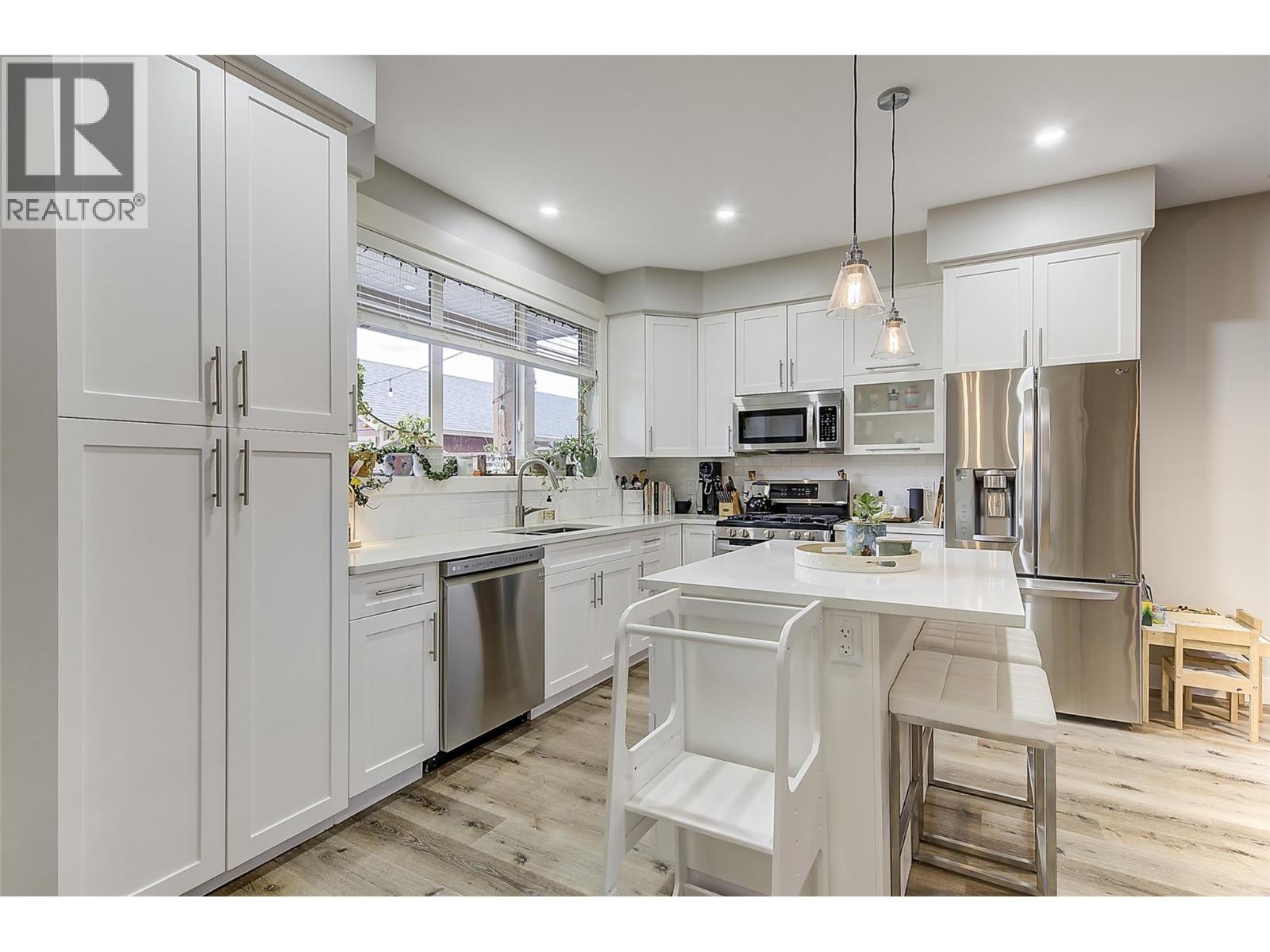 Experience relaxed, connected Kelowna living in this beautifully maintained townhome crafted by Maraine Construction. Thoughtfully designed with a warm, modern aesthetic, the home offers an inviting atmosphere from the moment you step inside. Sunlit living spaces create an easy flow for daily life—perfect for quiet mornings, relaxed evenings, or hosting friends in comfort. The kitchen’s quartz surfaces, stainless steel appliances, and gas range set the stage for effortless cooking and gathering. Upstairs, three bright bedrooms—primary with its own ensuite—provide privacy and comfort for homeowners, guests, or renters. A rare advantage in this category, the generous yard offers room to unwind outdoors, garden, or simply enjoy your own slice of city space. With covered garage parking, extra storage (including above-garage storage accessed by pull-down stairs), and efficient heating and cooling, the home delivers convenience without compromise. Situated near transit, schools, and essential amenities—and within a five-minute walk to three different parks with playgrounds—the location unlocks a genuinely walkable lifestyle. Bike or stroll to Pandosy Village or Downtown with ease, supported by direct access to the Ethel biking corridor. Offering style, comfort, and long-term value, this thoughtfully kept two-story townhome is an appealing alternative to condo living—ideal for a first home, investment, or those seeking a vibrant urban-adjacent community.