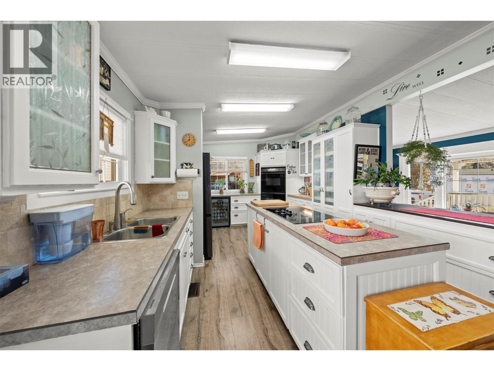 Newly renovated home in a desirable park BEAUTIFUL double wide home boasts 2 bed 2 bath and 1650 sq ft. Step onto your private front veranda thru the french doors and relax with morning coffee and soak up the sun all while enjoying the unparalleled view of Mount Boucherie, and mountains along OK lake. Freshly painted, totally updated with drywall throughout. Living room is large with plenty of light and lovely views from the bay windows and french double door leading to the side deck to the back yard. Appliances are SS and fairly new, fridge (2021), DW (2023), washer/dryer (2020). Both bathrooms have a walk-in glass shower, and the spa like ensuite has a double jetted tub. Master bed has large windows with plenty of light, a large bright office and walk in closer with built in shelves and drawers. The 2nd bedroom is bright and spacious with plenty of light and room for king bed and dressers. A gardeners dream with raised beds along the entire length of the mobile, the front has a beautiful garden bed and side bed alongside a large brick driveway. Newly landscaped private back yard including patio area. Both front and back yards are fenced. Roof is 5 years old, furnace was replaced in 2020 with a high efficiency and windows are new. House is located on a very quiet road in a well managed park. It is in the adult section (19+). Close to shopping, wineries, beaches, and hiking trails. 2 Pets welcome without size limits, with park approval.