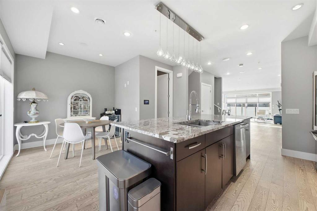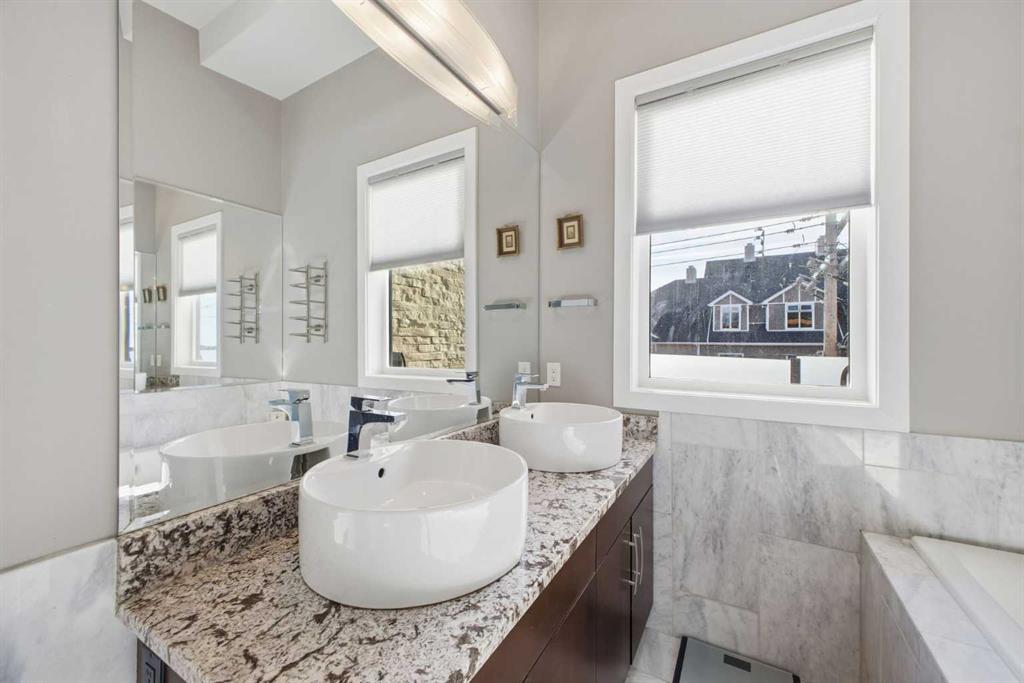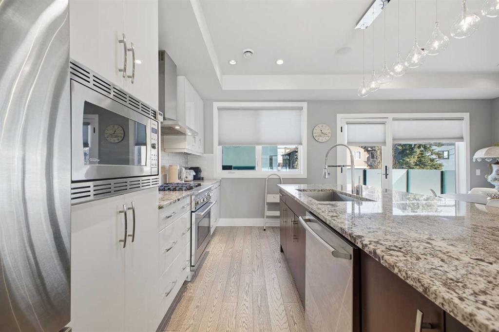 OPEN HOUSE SATURDAY, FEBRUARY 14TH FROM 2-4 PM. Gorgeous upscale 3 bedroom townhome in the heart of South Calgary offering over 2100 sq ft of living space & an ELEVATOR SERVING ALL 3 LEVELS! The open & airy main level presents wide plank hardwood floors, lofty ceilings & is drenched in natural light, showcasing the spacious living room that’s anchored by a feature fireplace & has access to a private deck with outdoor fireplace. The dining area with stylish light fixture provides ample space to host family & friends & seamlessly flows into the kitchen that’s tastefully finished with granite counter tops, island/eating bar, plenty of storage space, stainless steel appliances & cozy breakfast nook with access to the north balcony with BBQ gas hookup. A 2 piece powder room completes the main level. The second level hosts 3 bedrooms plus 4 piece main bath & laundry facilities. The generously sized primary retreat with private balcony boasts a walk-in closet & luxurious 5 piece ensuite with marble flooring, dual sinks, relaxing soaker tub & rejuvenating steam shower. Other notable features include an elevator, central air conditioning, built-in speakers & single attached garage. The prime location is incredibly convenient, walking distance to vibrant Marda Loop, River Park, Marda Loop CA, schools, shopping, public transit & effortless access to 14th Street & Crowchild Trail.