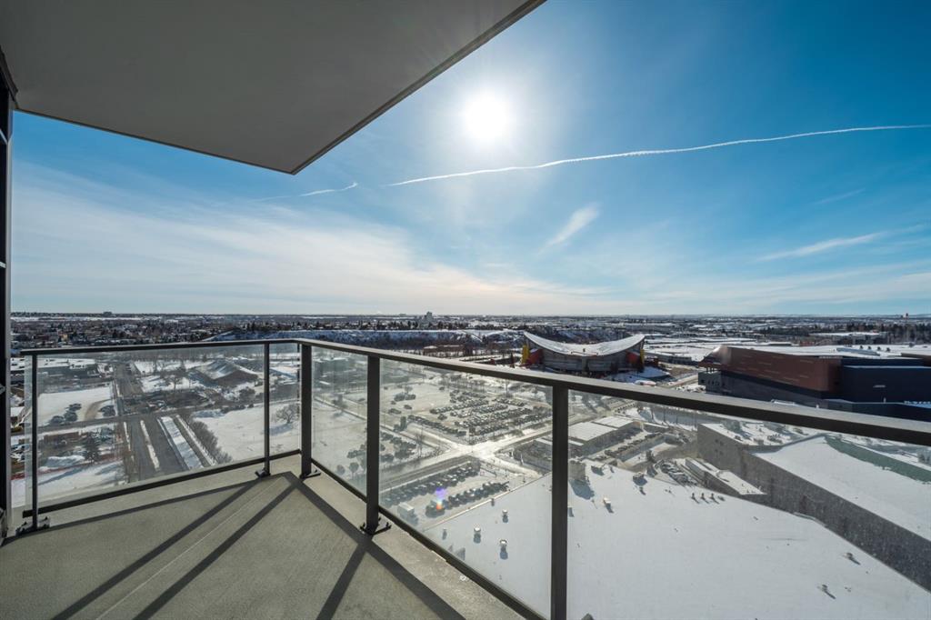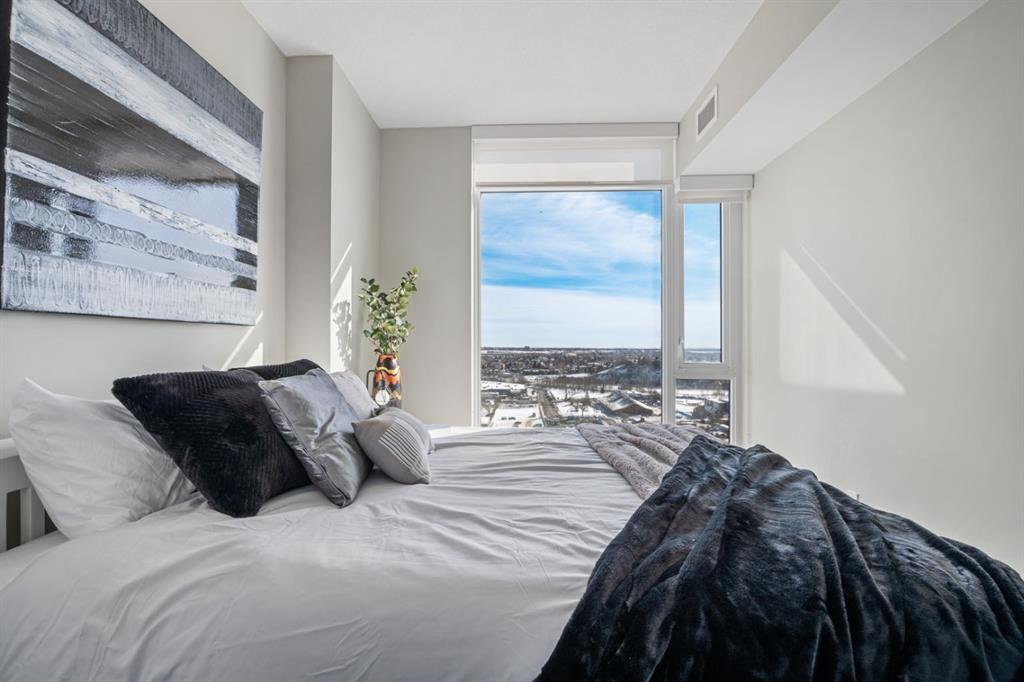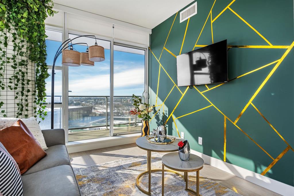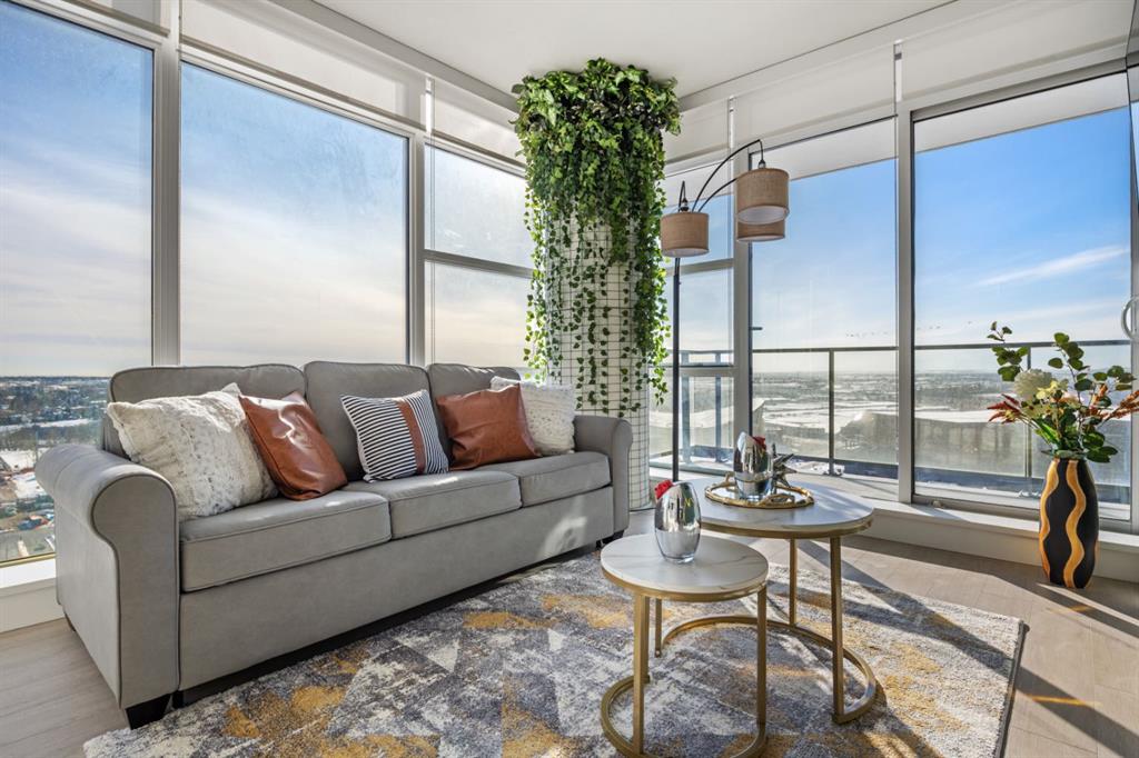 Premium Corner Unit with Unmatched Views in The Guardian South Tower. Step into elevated urban luxury with this exceptional, fully furnished corner residence on the 20th floor of The Guardian — Calgary’s tallest residential tower. Perfectly positioned in the most desirable stack of the building, this rare opportunity offers unobstructed panoramic views of the mountains, Bow River, downtown skyline, and Calgary’s emerging entertainment district, including the upcoming events centre and new stadium. From sunrise to sundown, the floor-to-ceiling glass walls flood the space with natural light and provide a cinematic backdrop to every room — a feature only available in premium-tier corner units. Inside, the home boasts: • Two well-separated bedrooms for privacy and functionality • A sleek, modern kitchen with high-gloss cabinetry, integrated appliances, and quartz countertops • An open-concept layout ideal for entertaining or executive living • A spacious primary suite with walk-in closet and spa-inspired ensuite • Airy ceilings and high-end finishes that reflect The Guardian’s signature contemporary design Professionally staged, this suite shows like new — and includes the option to be sold fully furnished, offering an effortless move-in or turnkey investment for corporate stays or luxury short-term rentals. Located in East Village, steps from transit, cafes, the Saddledome, Stampede Park, and the future event hub, this is one of the best-positioned investments in Calgary’s core. ?? Includes titled parking and exclusive building amenities such as concierge, gym, social lounge, and workshop.