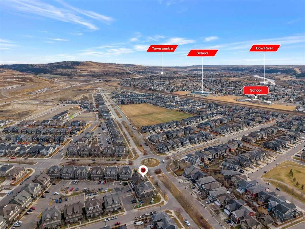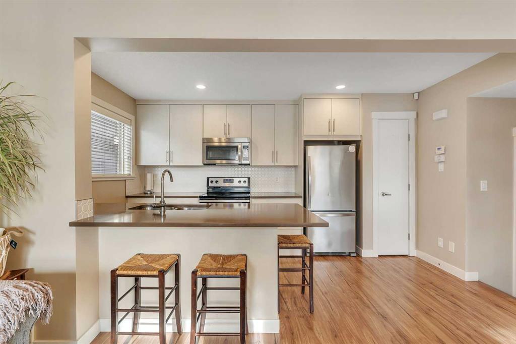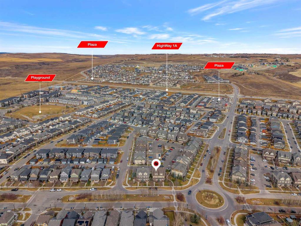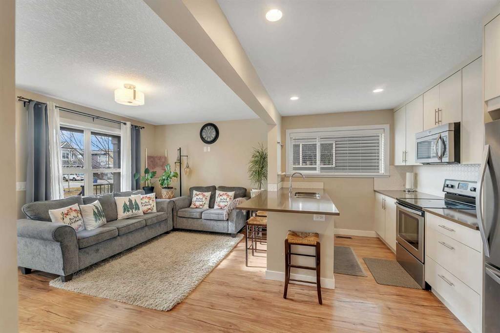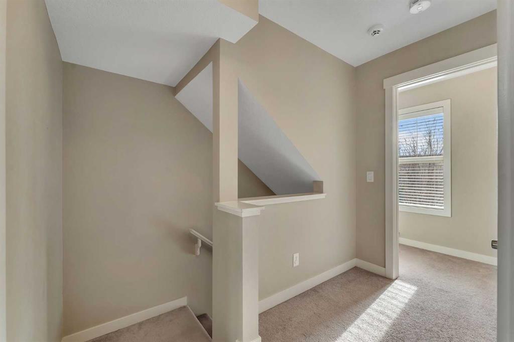 A beautiful townhouse located in one of Cochrane’s best communities Heartland. This home stands out with its charming front porch and eye-catching elevation across all three levels, giving it a unique and inviting presence. As you walk in, you are welcomed by a spacious foyer featuring ceramic tile flooring and a large closet. The main floor offers a bright dining area and a cozy living room filled with natural light from the large windows. The entire level is finished with luxury vinyl plank flooring for a clean and modern look. The fully upgraded kitchen is a true highlight, featuring extended cabinetry up to the ceiling, a stylish milky backsplash, quartz countertops, stainless steel appliances, double sink, pot lights, and a large window. A great-sized pantry completes this functional and beautiful kitchen. Just a few steps down, you’ll find a half bathroom and access to the massive unfinished basement. The basement, including the laundry area, is ready for your personal touch to create additional living or entertainment space. The second floor features two generous bedrooms and a 3-piece bathroom, with well-maintained carpet throughout the upper levels. One of the standout features of this home is the top-floor master bedroom, privately separated and designed with a vaulted ceiling, walk-in closet, and its own 3-piece ensuite. From this level, you can enjoy beautiful mountain views year-round. This home comes with two dedicated parking stalls, offering excellent convenience for homeowners and guests. Perfect for first-time buyers, this home offers comfort, style, and practicality. With no neighbors in front, walking distance to the shopping center, pathways, and very close to the school, it truly has everything you need.