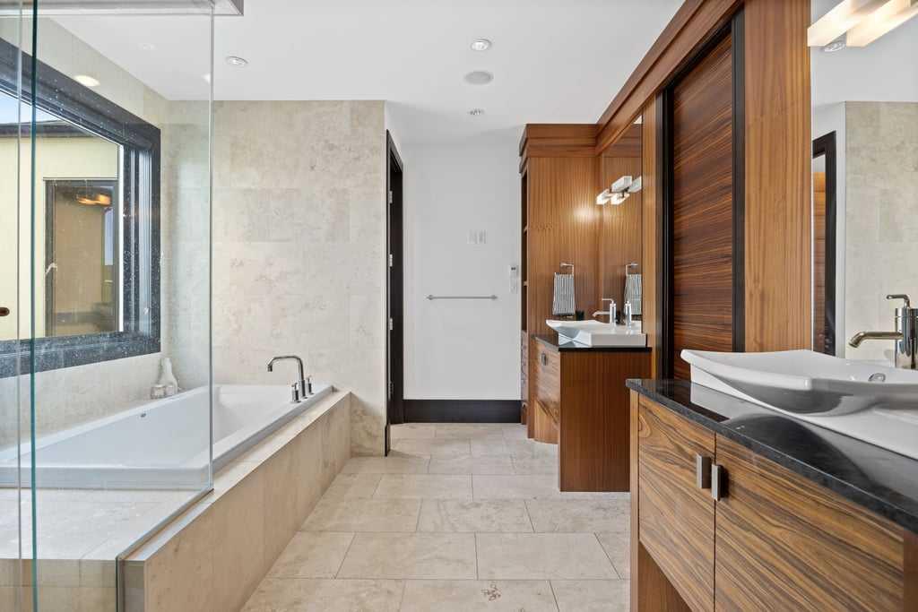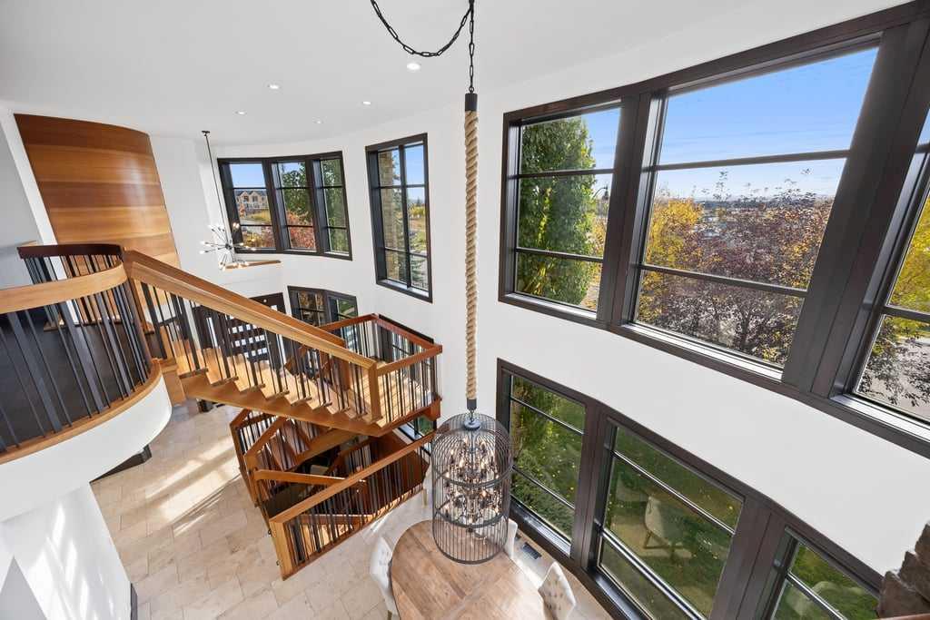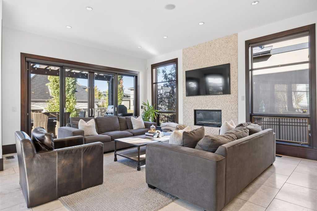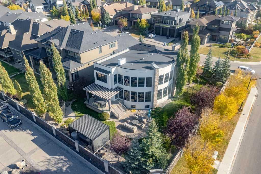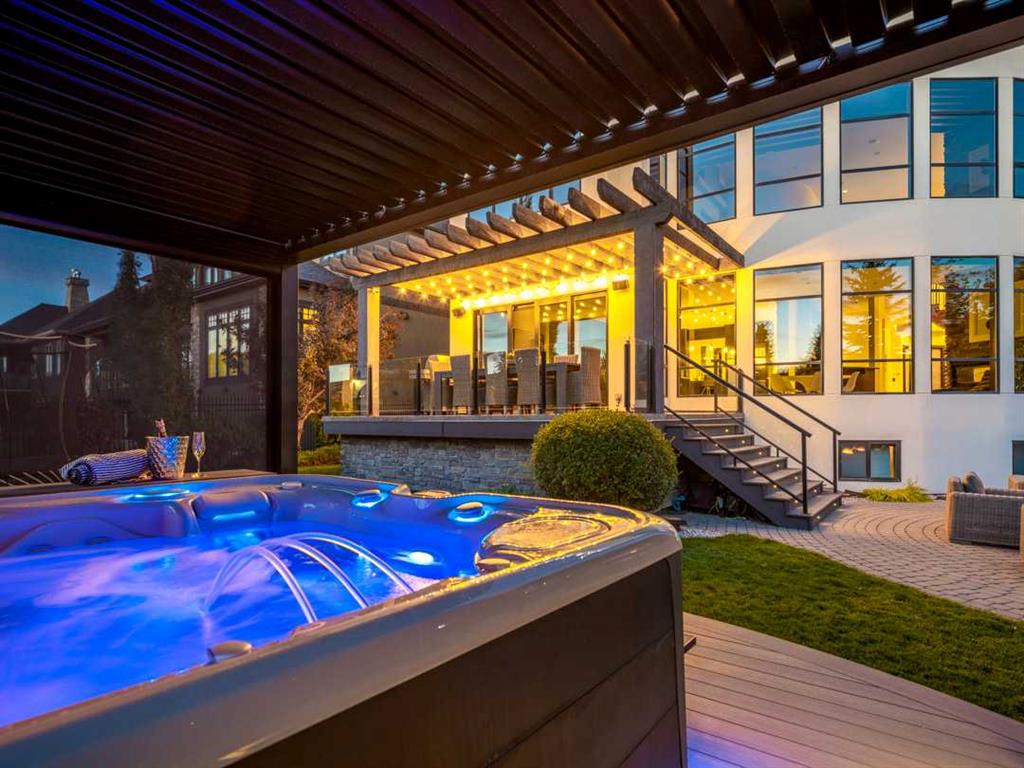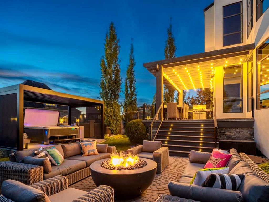 Set in the prestigious community of Aspen Estates, this custom-designed luxury home offers over 6,900 sq. ft. of total living space, blending architectural artistry with everyday comfort. From the moment you step into the dramatic 19-ft foyer—defined by its striking steel-framed glass wall—you’ll sense the sophistication and craftsmanship that define this exceptional residence. Every element has been meticulously curated. Rosewood cabinetry and solid doors, a Jatoba floating staircase, and heated limestone and hardwood floors create a seamless blend of warmth and refinement. Soaring 10-ft ceilings on the main level and 9-ft ceilings on the lower level enhance light and volume, while Montego linear fireplaces bring contemporary ambiance to the living spaces. The chef-inspired kitchen is the true heart of the home, combining form and function with a curved granite island, Sub-Zero and Wolf appliances—including a six-burner gas cooktop, double wall ovens, two dishwashers, and an integrated side-by-side refrigerator. A butler’s pantry and wet bar make entertaining effortless, whether hosting a quiet dinner or a lively gathering. With six bedrooms and five bathrooms, the layout offers exceptional flexibility for family and guests alike. The main floor includes a spacious bedroom with its own ensuite and walk-in closet—ideal for extended family or a private office retreat. Upstairs, each of the additional bedrooms features its own ensuite and walk-in closet, providing privacy and comfort for everyone. The primary suite stands as a serene escape, complete with a two-sided fireplace, 5x5 steam shower, deep thermal tub, and custom pillowed mahogany woodwork—a true statement of luxury. The lower level was designed as the ultimate entertainment and relaxation space, featuring a theatre room, large recreation area, wet bar, temperature-controlled wine cellar, golf simulator, dedicated office, and an additional bedroom—perfect for guests or live-in support. Outside, the property transforms into a private retreat designed for year-round enjoyment. Highlights include multiple patio spaces, a fire-pit, a covered hot tub area, an outdoor putting green, and an elevated deck with clear glass railing and BBQ—a seamless extension of the home’s indoor living spaces. Modern convenience meets timeless design with smart home automation, a five-zone lighting system, and computerized irrigation, ensuring ease, efficiency, and comfort at every turn.