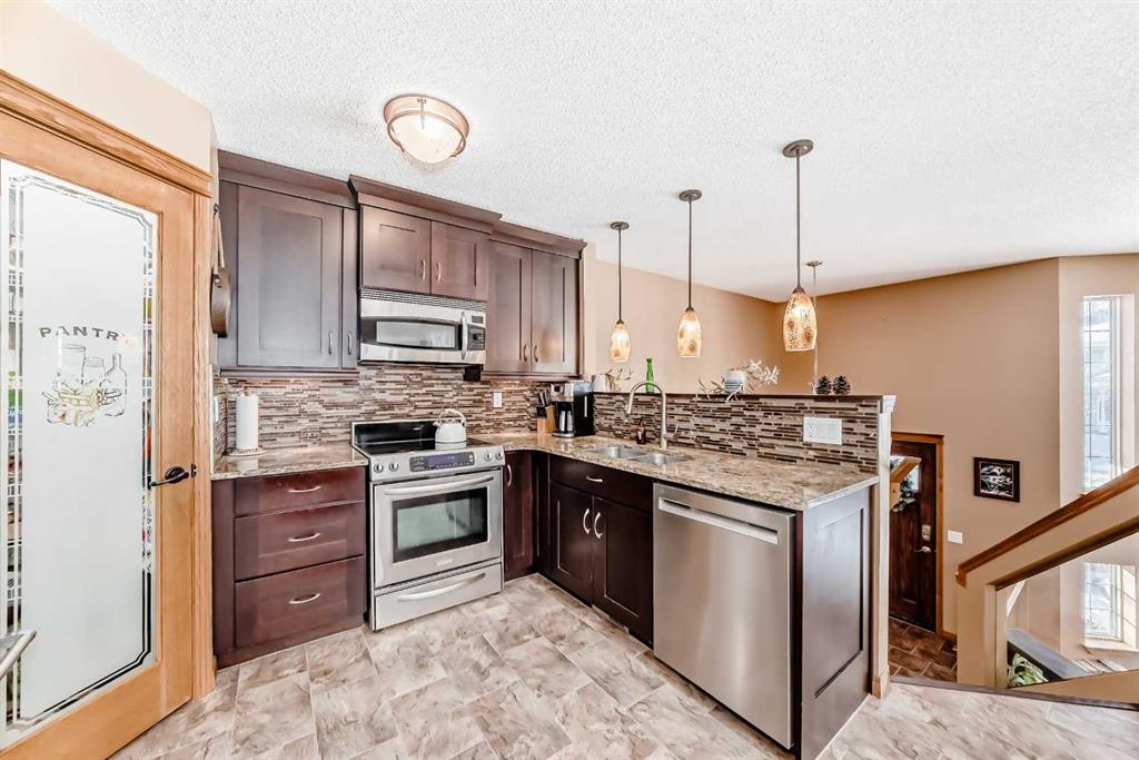 Every detail of this beautifully upgraded bi-level home reflects thoughtful craftsmanship and modern comfort—including a brand-new roof with premium shingles installed in 2025 for lasting protection and peace of mind. Step through the front door into a bright, vaulted entryway—your central hub for daily life. To your right, a large coat closet with mirrored double doors offers smart, accessible storage. Ahead, natural light streams in through the front window, featuring a remote-controlled shade for effortless privacy or sunlight control. Warm walls envelop the space, with hardwood stairs rising to the main living level and descending to the lower floor—offering smart separation between private and communal living. Upstairs, discover a stunning, newer kitchen complete with gleaming granite countertops, a full-height mosaic tile backsplash, soft-close touch-latch drawers, custom spice racks, and top-tier stainless steel appliances (dishwasher 2023, refrigerator 2024). A spacious walk-in pantry with frosted glass doors offers clever storage, while warm amber pendant lights illuminate the counter. Rich dark wood cabinetry contrasts beautifully with the flooring, creating a modern yet inviting space—perfect for everyday meals and entertaining. Down the hall, rich hardwood floors lead to three well-proportioned bedrooms, including a generous primary suite with a custom walk-in closet. Note the stylish interior doors with frosted glass inserts, contemporary hardware, and updated light fixtures throughout. The main bathroom shines with premium fixtures, granite countertops, striking tile, and timed heated floors—warm underfoot on cold winter mornings. The fully finished lower level offers versatile living space: a spacious family room, a quiet sitting nook, a dedicated play area, and a fourth bedroom—perfect for guests or a home office. Don’t miss the three-piece bathroom with granite counters, dark cabinetry, and a rainfall shower panel system, thoughtfully designed for everyday luxury. New lighting throughout the lower level enhances ambiance and function, and the renovated laundry room features a brand-new washer & dryer (2025)—tucked neatly behind closed doors for seamless style. The home is also equipped with a central vacuum system, fitted with a new, powerful motor in 2025, & attachments Walk out basement to your private oasis: a pristine, landscaped backyard featuring a soothing fountain, fresh rock beds, and mature trees—all newly installed after replacing the old shed. Both decks have been refreshed: the side deck re-boarded for safety and curb appeal, and the rear deck enlarged and upgraded for larger gatherings and outdoor relaxation. The oversized 21' x 23' garage is insulated and drywalled, offering year-round usability and pre-wired for a plug-in heater. Perfectly positioned near top-rated schools, lush parks, excellent pathways, and public transit, this home blends location, luxury, and livability. It’s not just a house—it’s a 10/10 lifestyle.