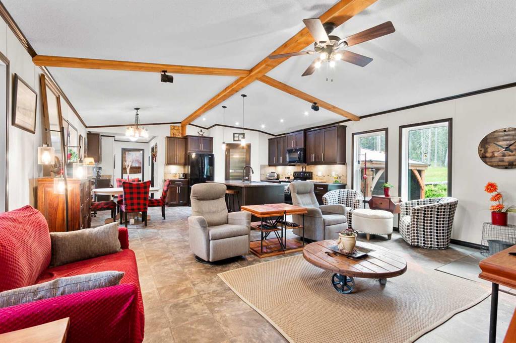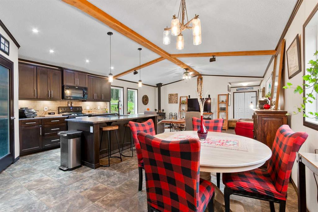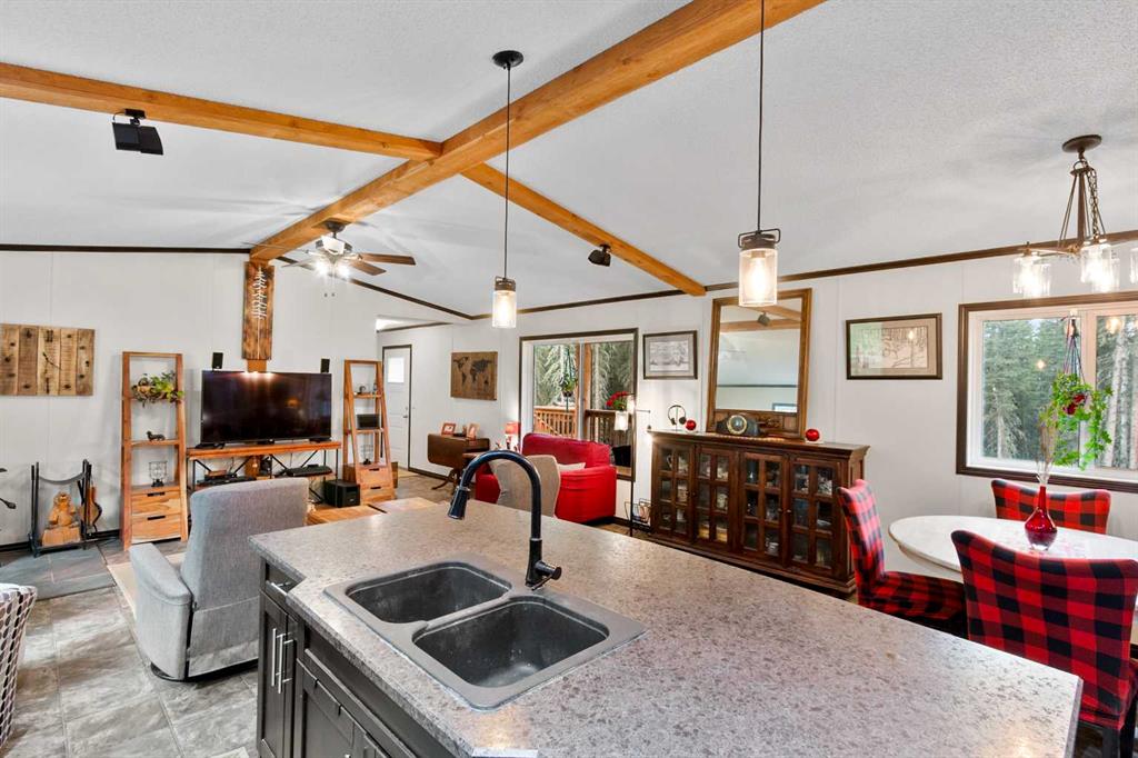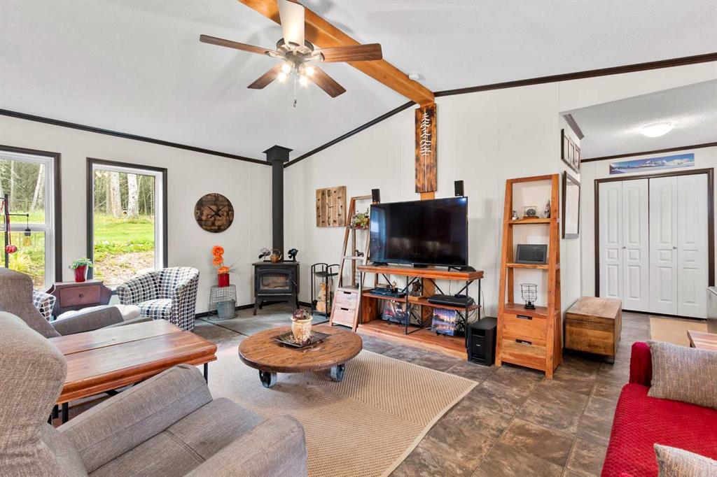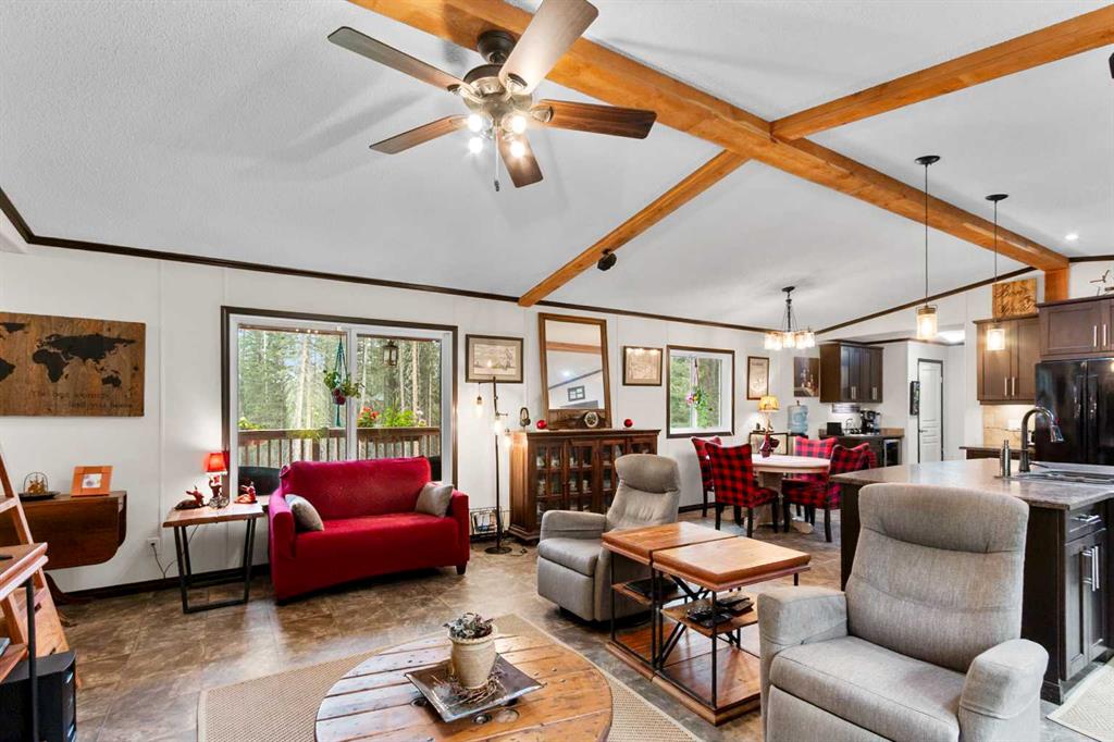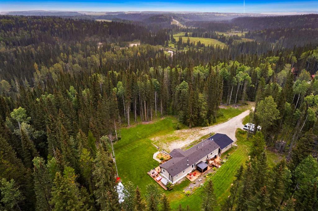 Set on a beautifully TREED SETTING, this 1,472 sq ft modular home offers the space and lifestyle acreage buyers crave. The OPEN-CONCEPT living area is warm and inviting, anchored by a WOOD BURNING FIREPLACE, exposed WOOD BEAMS & room to gather comfortably. A generous dining area flows into the functional kitchen featuring a center ISLAND, a COFFEE BAR and a large WALKTHROUGH PANTRY with convenient access to the laundry room and secondary entry, perfect for country living. The thoughtfully designed floor plan provides separation and privacy, with the primary suite tucked away on its own wing, complete with a walk-in closet and 4-piece ensuite. Two additional bedrooms and a second 4-piece bathroom are located on the opposite side of the home, ideal for family, guests, or a home office. Outside, enjoy wide-open space surrounded by forest, a DETACHED DOUBLE GARAGE, and a large WRAP AROUND DECK with pergola—an ideal spot to relax, entertain, and take in the peaceful, private setting that acreage living is all about. Additonally there is a Greenhouse, Wood Shed, and Hot Tub included with the property. You will love the PRIVACY of being at a dead end road and you cant beat the location being walking distance to the Little Red Deer River & community of Water Valley. Start living you Country Dream Life Today !!