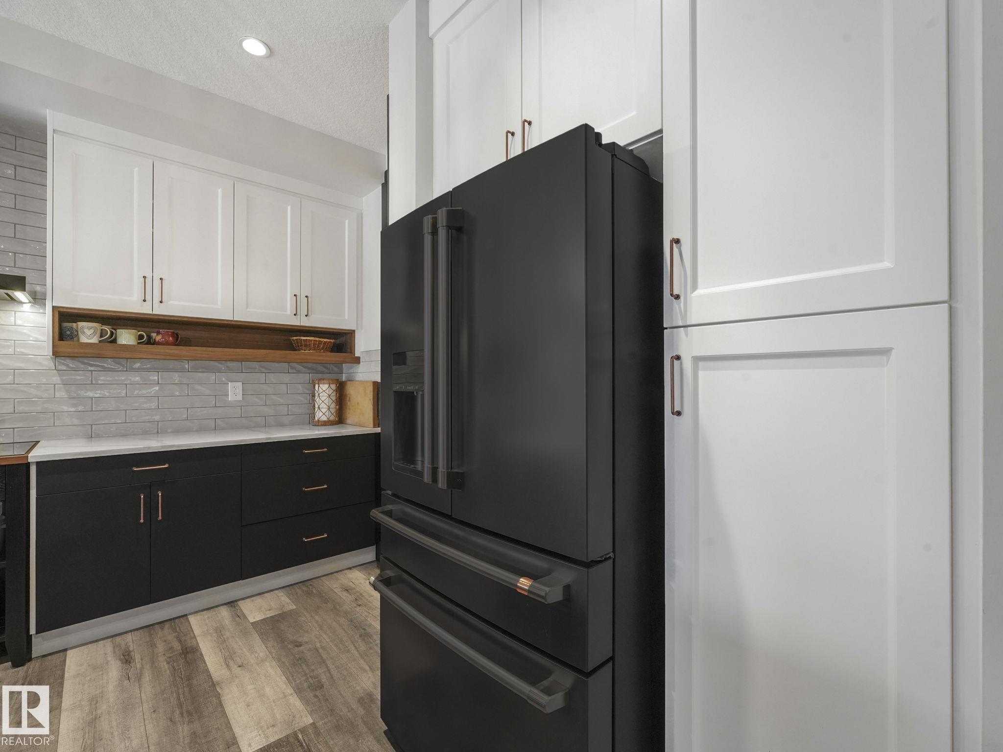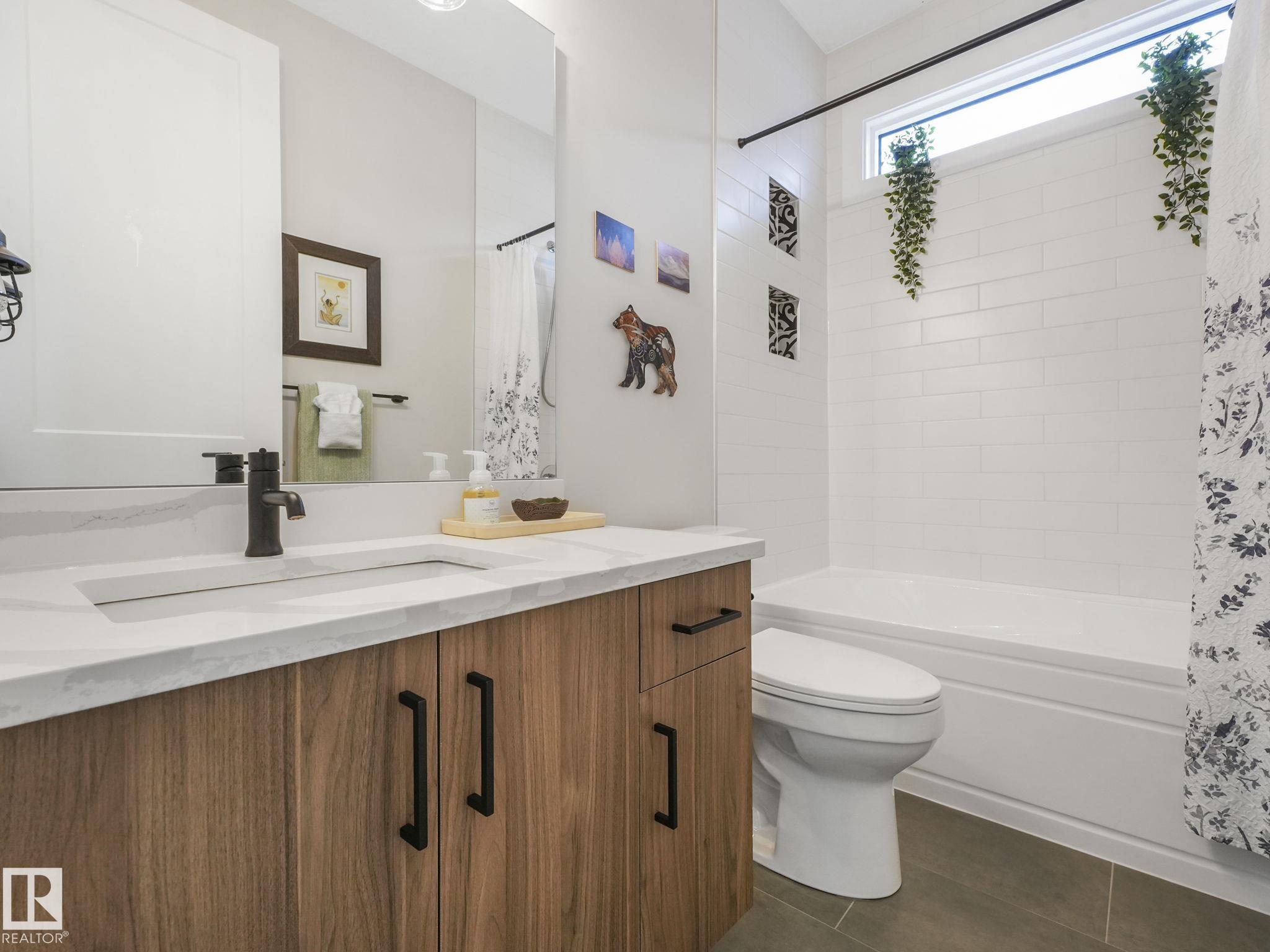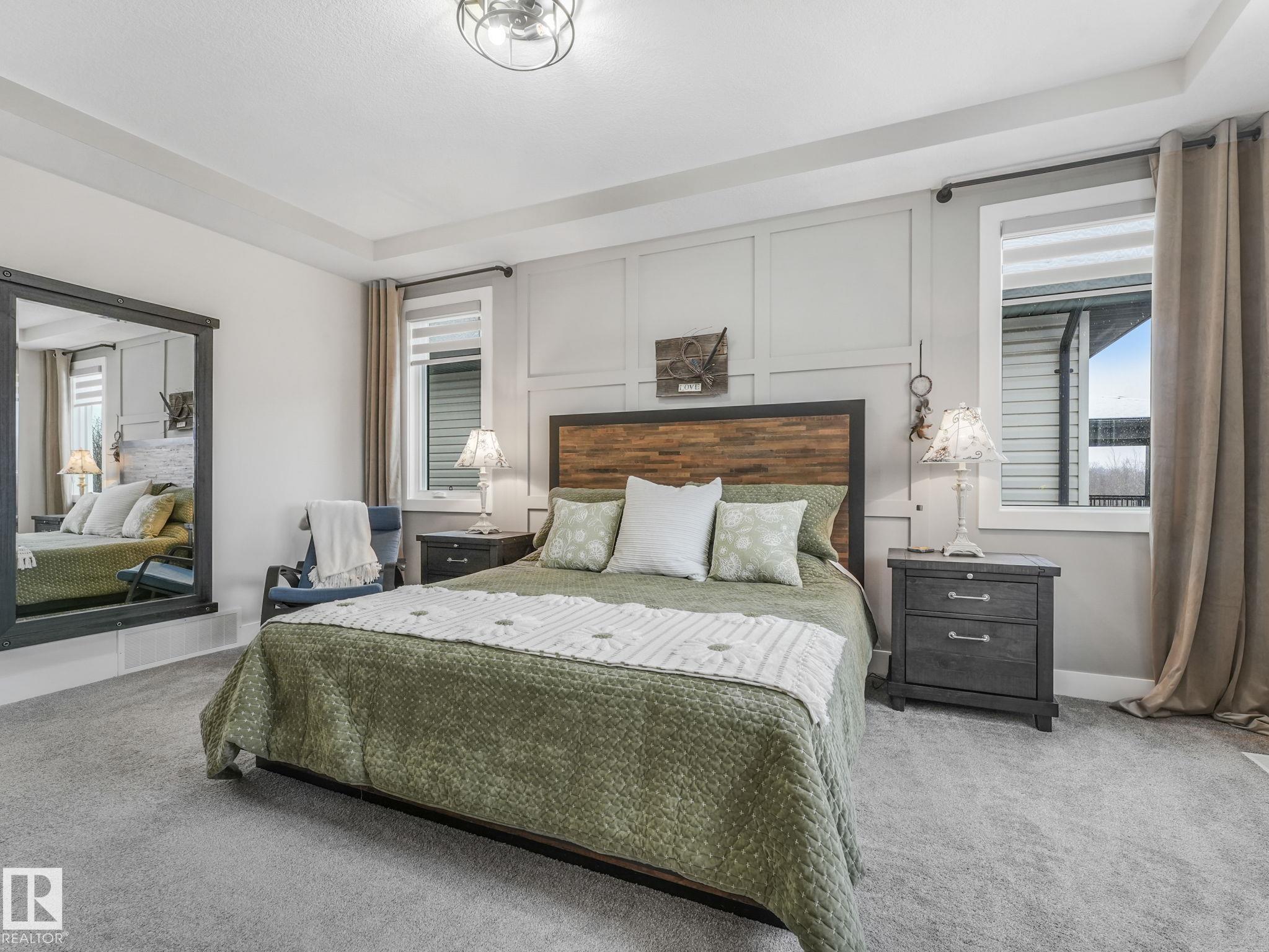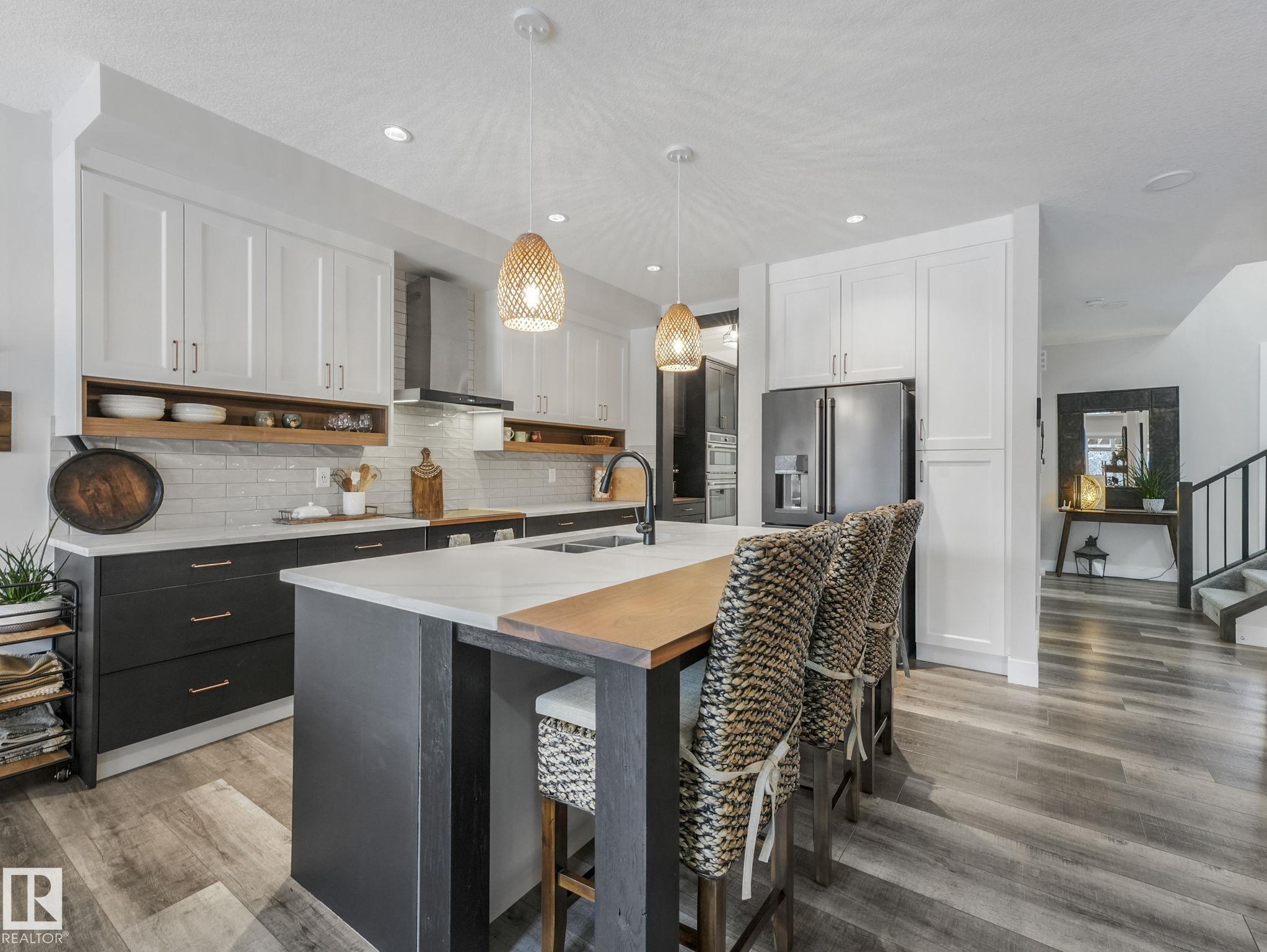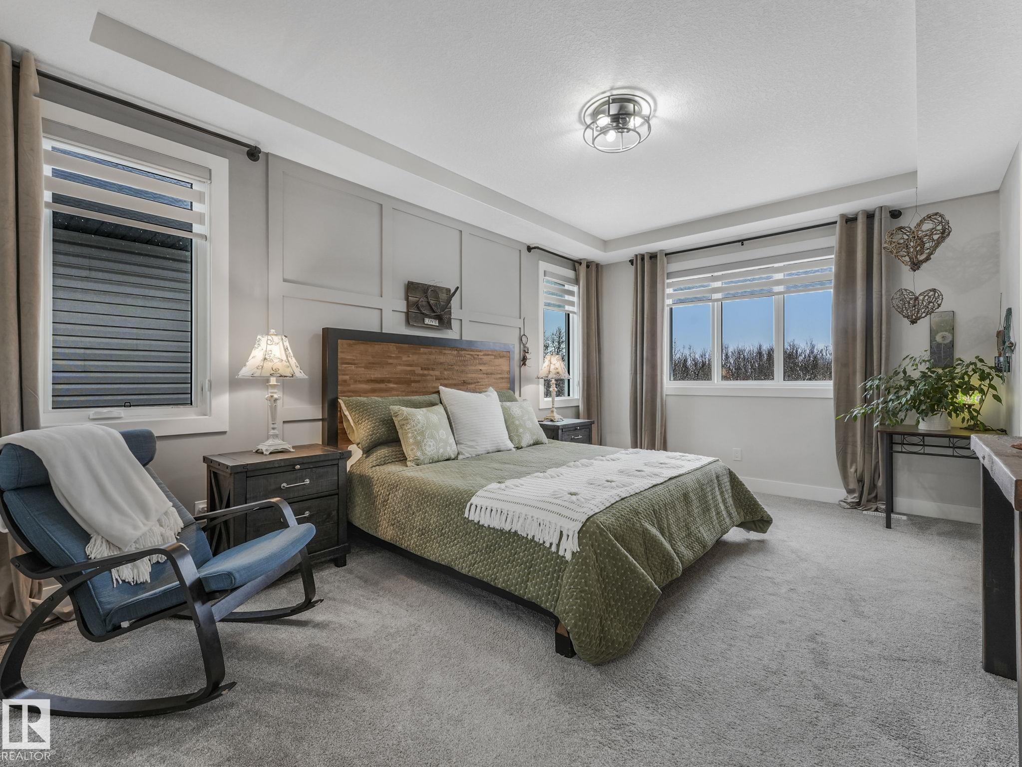 Prime Location! Private and sunny south backyard on a top-of-the-bank walkway adjacent to a Natural Conservation area. Enjoy privacy, natural light and wildlife views from your 2 level deck with pergola. Inside, this upgraded home features an open concept design with a $20,000 appliance upgrade including an induction cooktop on a custom-built cabinet, and in the new butler pantry there is a dual wall/convection oven beside a pullout pantry. The large custom walnut island extension is perfect for entertaining. All 3 levels feature 9'ceilings and triple pane windows. The upper level includes a spacious bonus room, laundry, and a generous primary suite with a dual vanity ensuite and 2 walk in closets. New A/C and garage heater. Side entrance has access to an enclosed dog run and the basement flex room with ample space for another bedroom. Trumpeter has it all ...wildlife and birdlife, hiking, biking, skiing and peaceful protected natural areas adjacent to the Lois Hole Provincial Park. Beautiful location!!