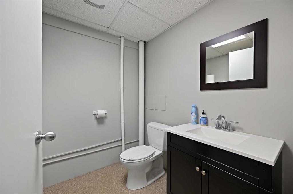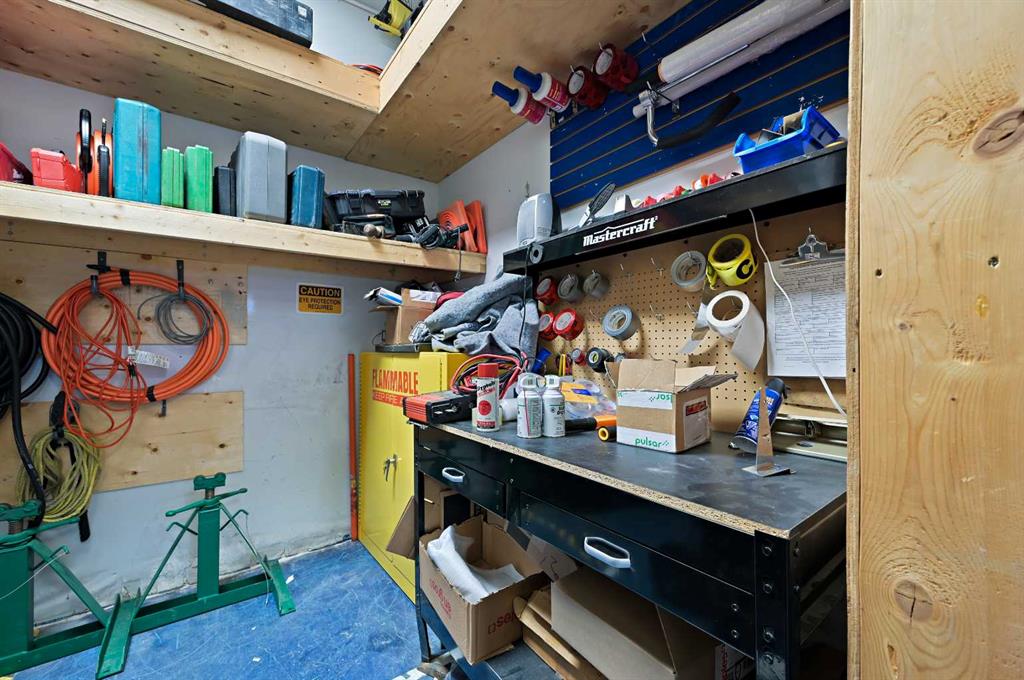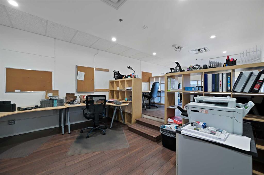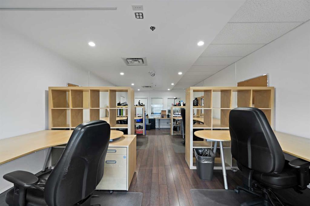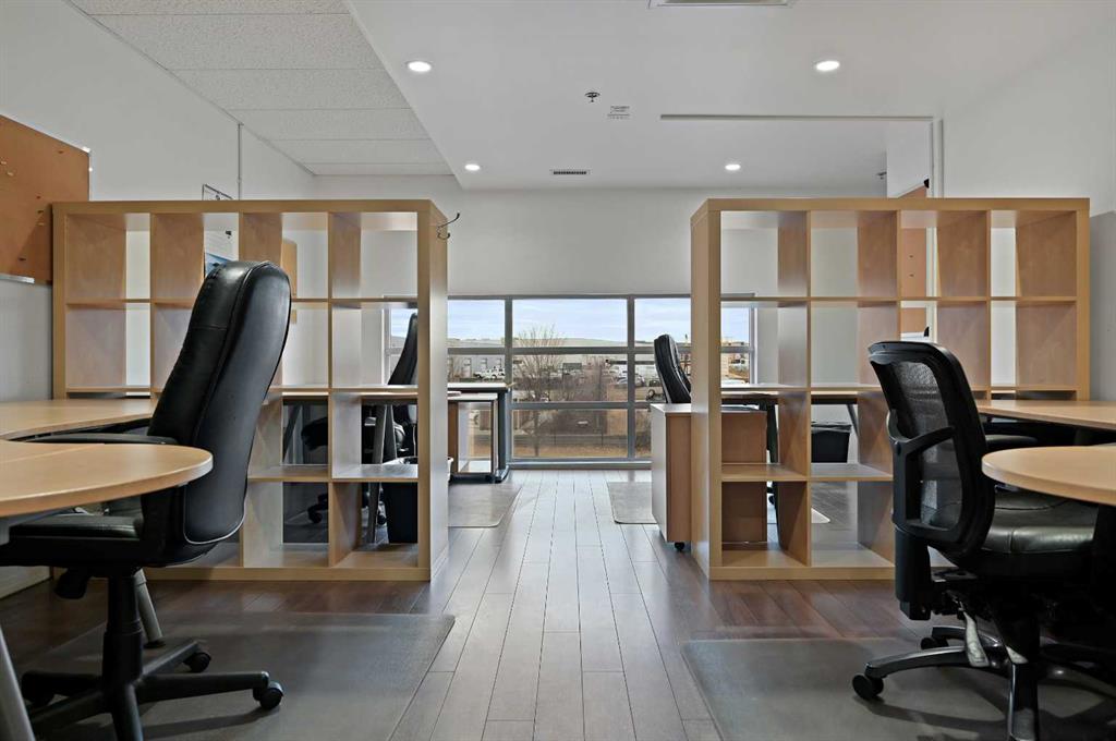 Commercial condos of this type are rare to find on the market in Airdrie. The unit is within the Kingsview Plaza, with excellent access to 40th Ave, Deerfoot Trail, Kingsview Market and Yankee Valley Blvd. The zoning is IB-1 for a variety of businesses, including business services, some retail and industrial services, animal services, microbrewery, health care and more. The condo includes 3,110 sq. ft. on 2 levels, consisting of a 570 sq. ft. shop / warehouse, reception, office, kitchen, bathroom and storage on the main level. The shop has 15 ft. clear height. The air conditioned second level is well designed offices and open area perfect for training plus a second bathroom. Loading is via a grade level 10 x 14 overhead door plus office entrance. Don't need both levels? - the second level can be easily secured from the main level for rental income. With assigned parking at the door and plenty of scramble parking, there is room for everyone. The rolling shelving system in the shop is available as a separate sale.