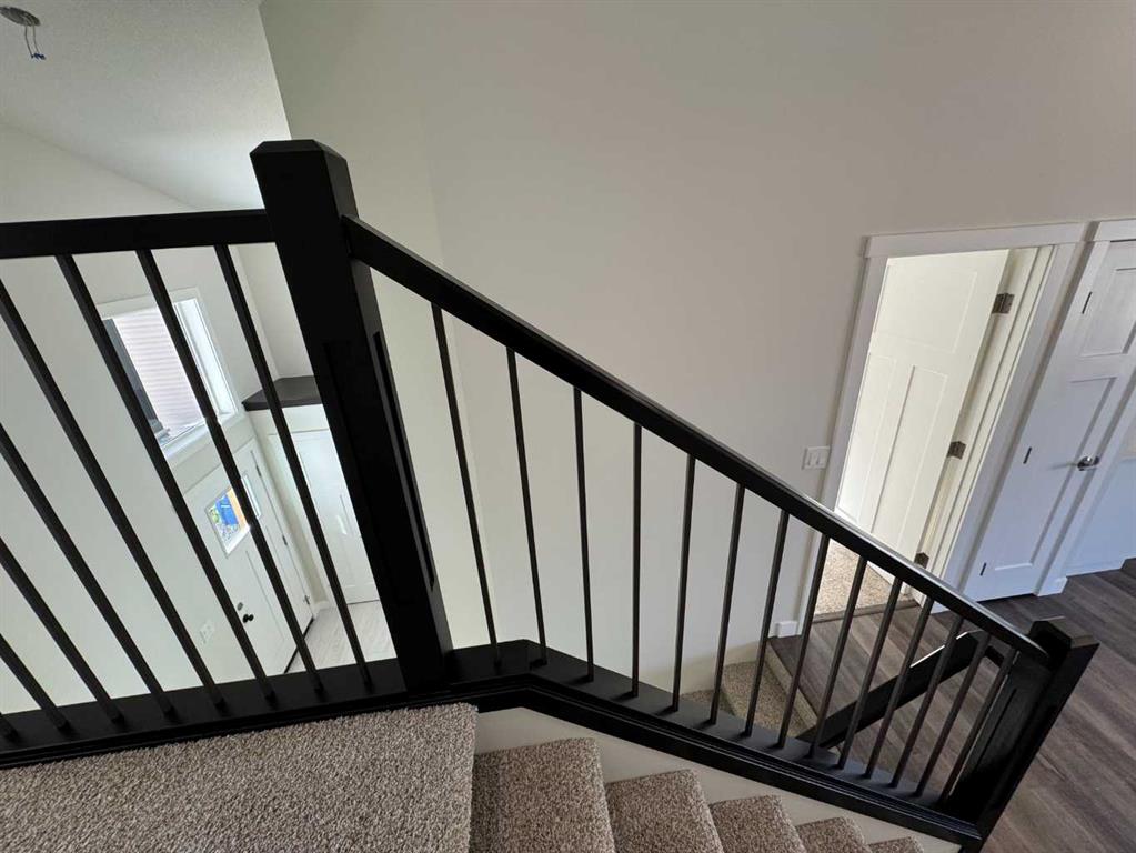 IN A DESIRABLE QUIET CLOSE LOCATION IN VALLEY RIDGE BLACKFALDS WITH A WALKOUT BASEMENT! WELCOME TO THIS SAN MARIA HOMES NEW BUILD MODIFIED BILEVEL! Enter to a spacious and tiled entry leading to the MAIN LEVEL OPEN PLAN LIVING/DINING/KITCHEN with luxury vinyl plank flooring, vaulted ceilings and an eye-catching electric fireplace with a floor-to-ceiling accented stone surround. Crisp white linen paint throughout! Impressive and Functional Dream Kitchen with white cabinetry/quartz countertops/center island with extended breakfast bar/pantry and all stainless steel appliances included (fridge with water!). The dining area, adjacent to the kitchen, is a generous size with a garden door out to the deck with a metal railing surround. Two secondary bedrooms on the main level and the main 4 pce bath with quartz countertop. The Primary Bedroom on the upper level has a walk in closet and 4 pce ensuite with quartz countertop and tile floor. The WALKOUT BASEMENT is open for development with 9 ft ceilings and sliding doors leading out to the concrete patio.....The basement also has roughed-in infloor heat and a furnace /laundry room combination that is framed and drywalled... The backyard is fenced on two sides! TAXES NOT YET ASSESSED.....
