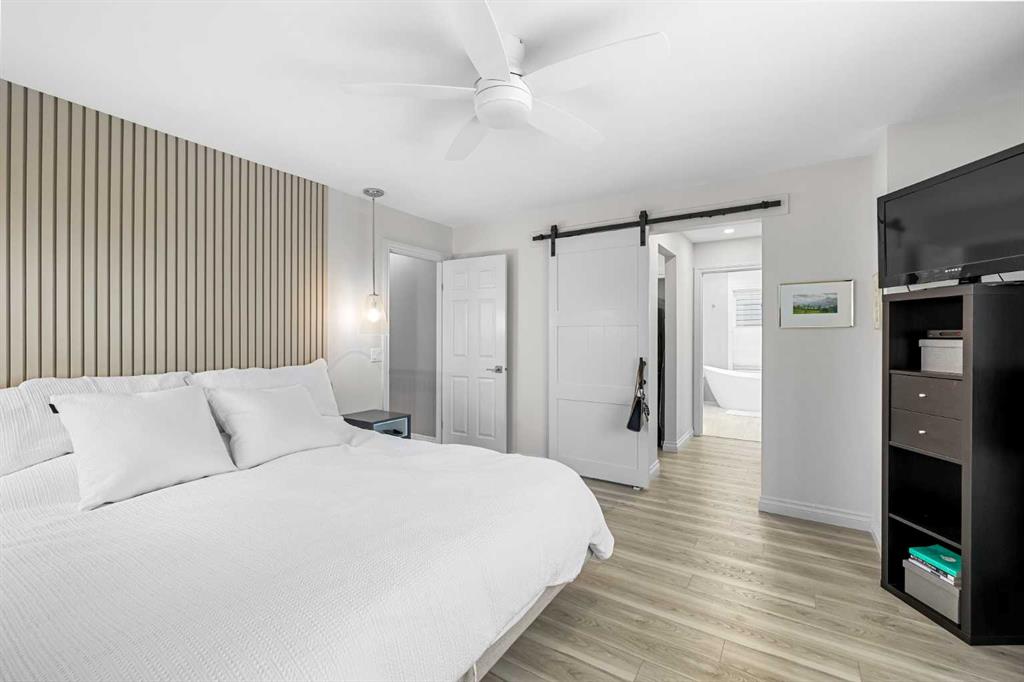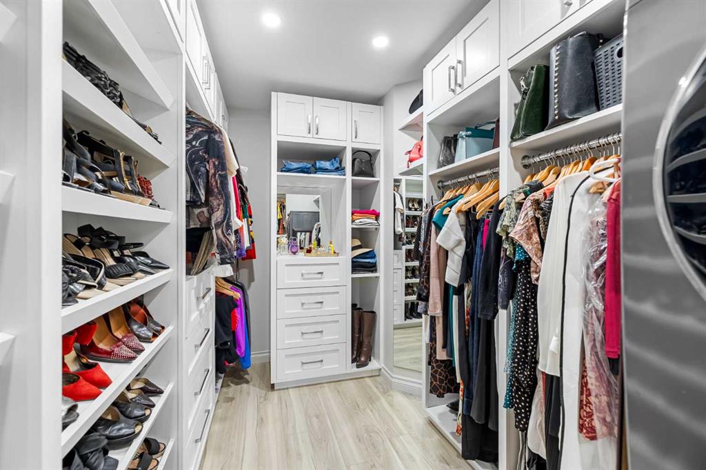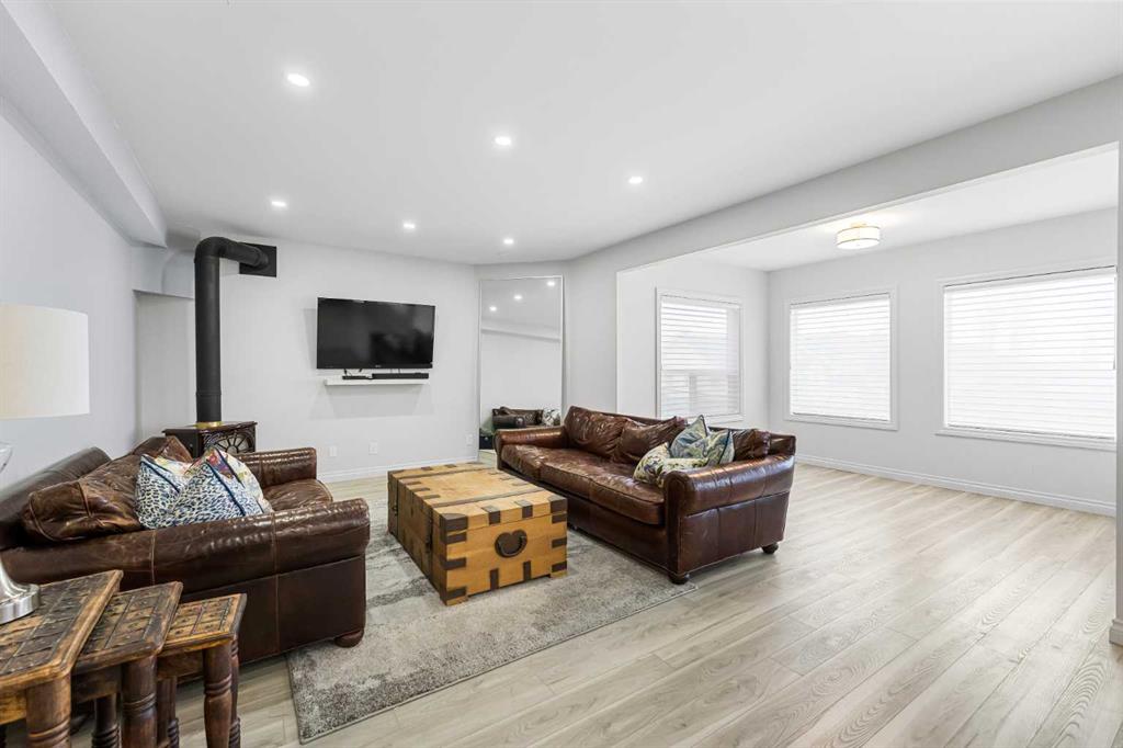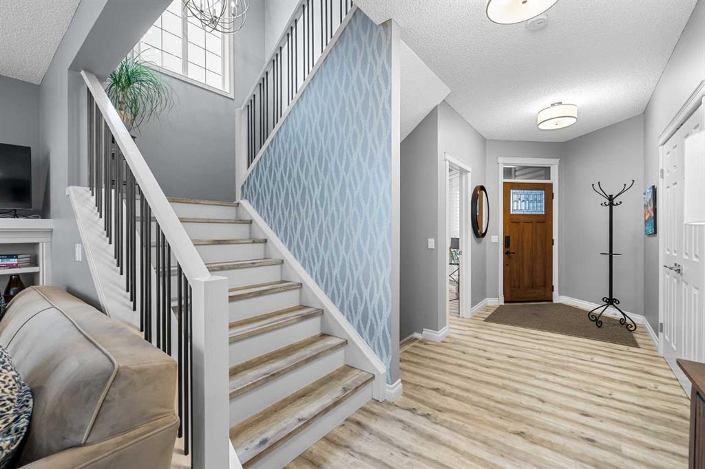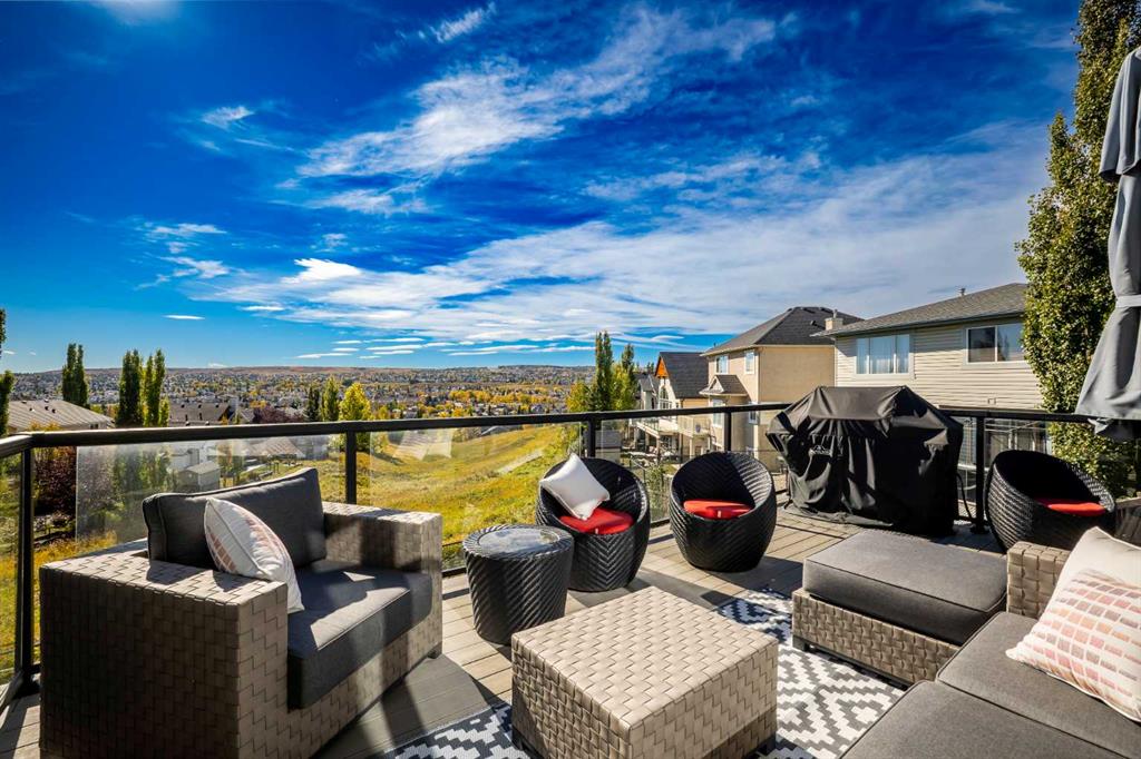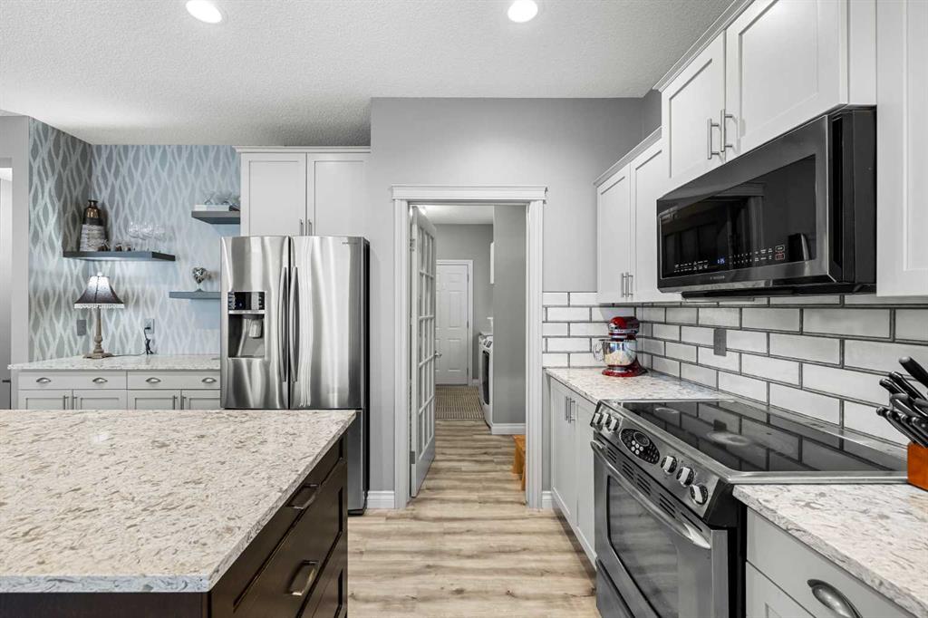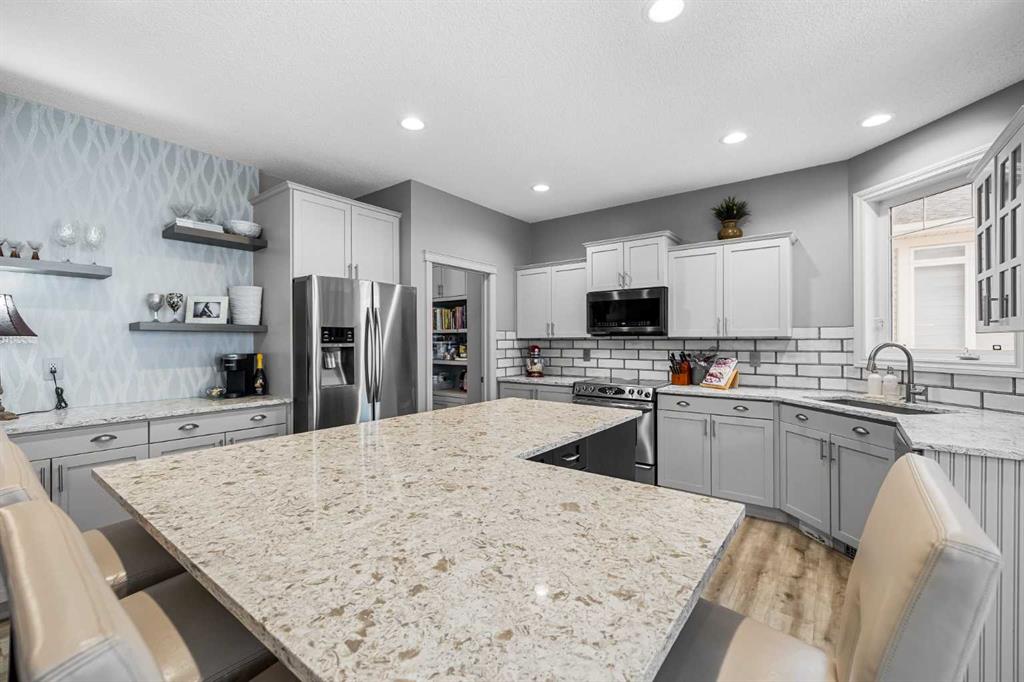 Welcome to this exceptional family home in sought-after Hansen Ranch, perfectly positioned backing onto a beautiful ravine green space with a sun-drenched south-facing backyard. This fully finished two-storey walkout boasting over 3,100 sqft of developed living space offers the perfect blend of luxury, functionality & an unbeatable natural setting in NW Calgary. Extensively renovated in 2021, this home showcases high-end finishes & thoughtful design throughout. Luxury vinyl plank flooring flows seamlessly across every level, complemented by quartz countertops throughout. Large windows flood the space with natural light & beautifully frame ravine views, creating a bright, inviting atmosphere. The main floor is elegant yet practical. A stunning stone gas fireplace anchors the living room, adding warmth & architectural presence. The chef-inspired kitchen features stainless steel appliances, a large center island perfect for gathering, a spacious dining nook overlooking the green space & a custom walkthrough pantry offering elevated storage & everyday convenience. A dedicated main floor office makes working from home effortless, while the main floor laundry/mudroom enhances the functional layout. Hunter Douglas blinds provide style & privacy throughout. Up the wide staircase with striking railing you’ll find three generous bedrooms, including a dreamy primary retreat. The spa-inspired ensuite offers dual sinks, a stand-alone soaker tub, gorgeous rain shower & a custom walk-in closet complete with its own stacked washer & dryer- a luxurious yet practical touch. Undercabinet lighting in the upstairs bathrooms adds a soft glow. Two additional great-sized bedrooms with custom closets & a 4 pc bathroom complete the upper level. The fully finished walkout basement expands your living space with a large recreation room with a beautiful corner gas fireplace that provides amazing heat to the space, fourth bedroom & full guest bathroom-ideal for visitors, teens or extended family-plus direct access to the peaceful landscaped backyard & ravine beyond. Step outside to your massive composite deck oasis with glass railing, custom stair lighting & a huge storage shed tucked neatly underneath. With no rear neighbors & direct access to green space, this south-facing yard offers privacy, sunshine & stunning natural views year-round. Additional highlights include a double attached garage, professionally landscaped backyard with a lower patio, underground irrigation, air conditioning, hot water on demand & a newer roof (high quality DKO Dynasty Shingle) for peace of mind. Close access to Stoney Trail with convenient proximity to grocery stores, amenities, restaurants, shopping & schools. Elegant & move-in ready, this is a rare opportunity to own a beautifully renovated walkout in one of northwest Calgary’s most established family communities. Lovingly cared for with pride of ownership shown throughout.