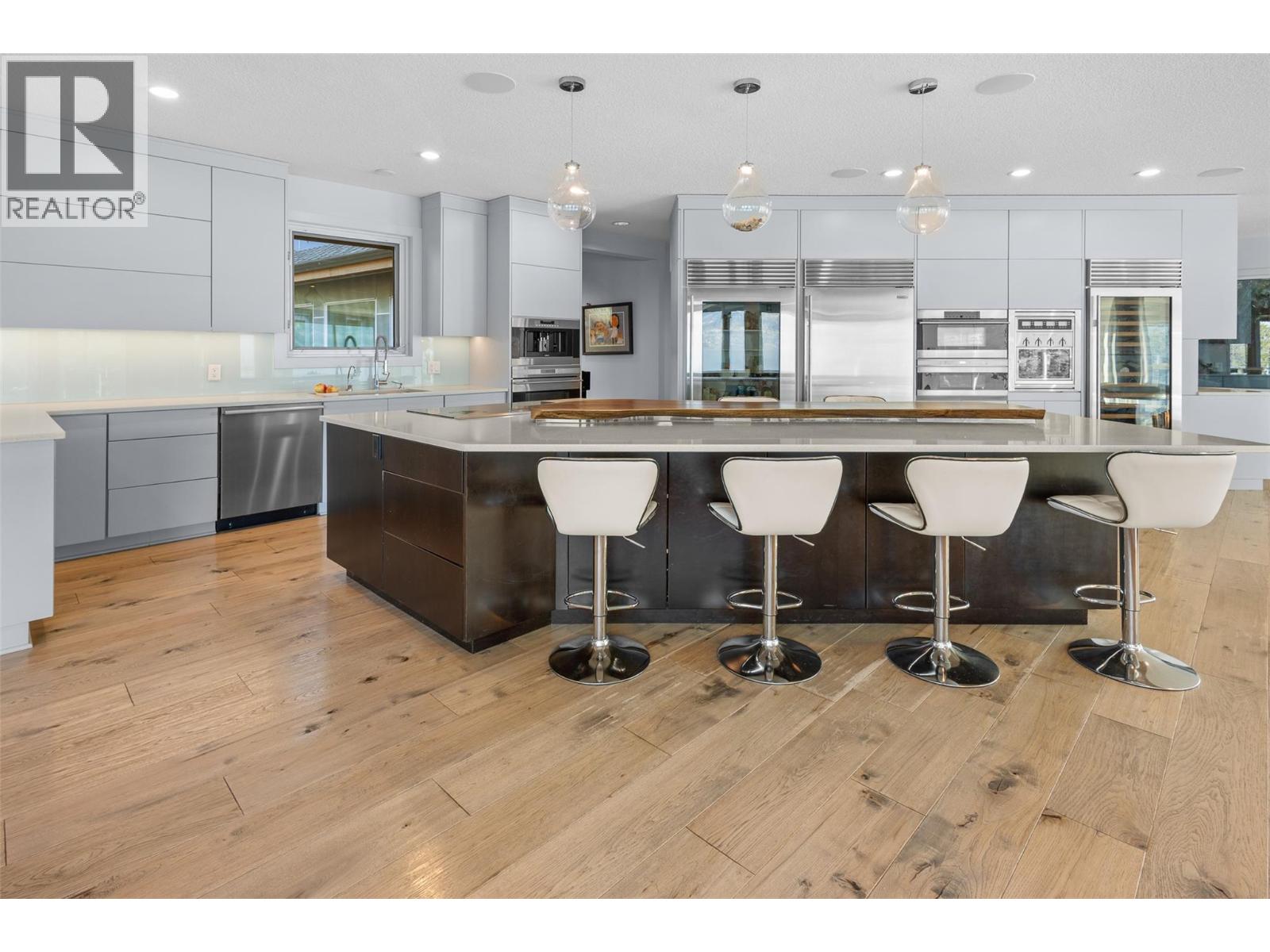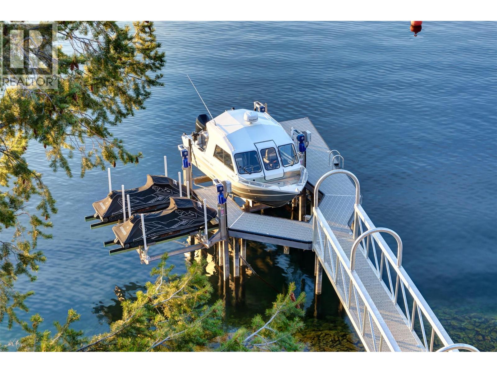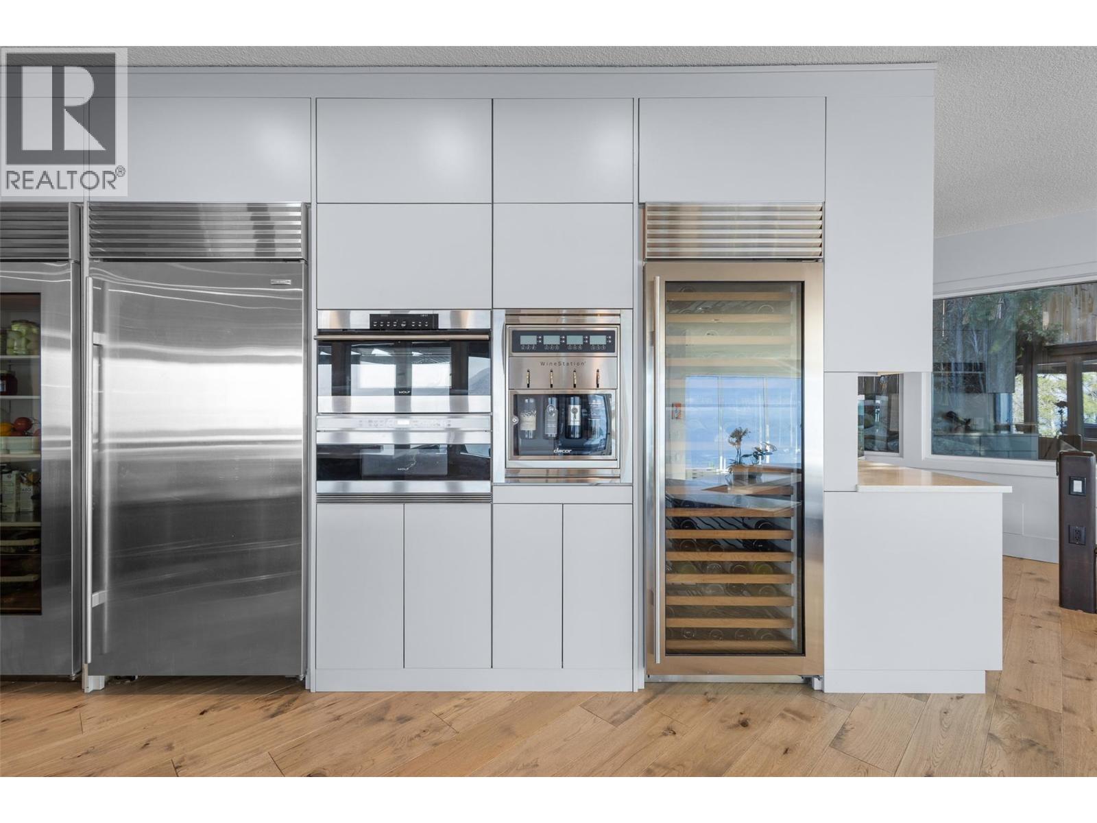Set on the sparkling shores of Okanagan Lake in the prestigious McKinley Landing community, this extensively renovated lakefront estate offers over 6,000 square feet of custom-designed luxury living. Panoramic lake views take centre stage, framed by more than 2,700 square feet of outdoor decks and patios with sleek glass railings for uninterrupted vistas. The private aluminum dock is complete with a boat lift, dual Sea-Doo lift, and moorage buoy, ready for effortless days on the water. Inside, every detail has been thoughtfully curated, from the chef’s kitchen featuring a massive custom island with a stunning live-edge centerpiece, Wolf appliances, a full-size wine refrigerator, and wine station, to the show-stopping circular open fire pit anchoring the living room. The luxurious primary retreat boasts a sprawling walk-in closet and a spa-inspired six piece ensuite. Designed for both lifestyle and entertainment, the home includes bonus spaces like a gym and home theatre. Find added value in the simple features, like a built-in vacuum and Telus security system, or with the two-bedroom in-law suite seamlessly connected to the main residence. Outdoors, multiple tiers of lounging space, a mini putting green, hot tub, and beachfront equipment storage create the ultimate resort-style setting. A four car tandem garage with a separate bay sized for RV or boat parking completes the package. Ideally located just minutes to Kelowna International Airport, The Okanagan Golf Club, and downtown Kelowna, this is Okanagan waterfront living at its finest.