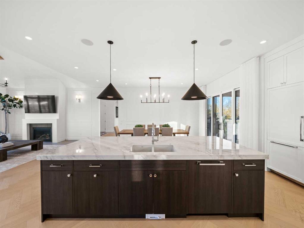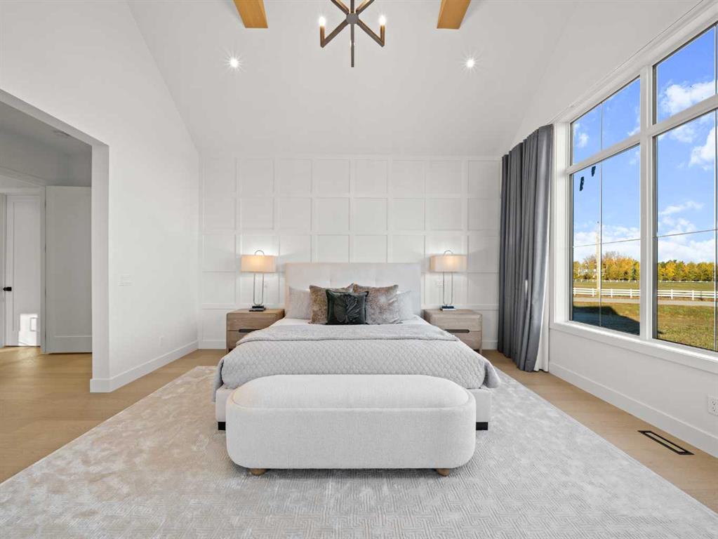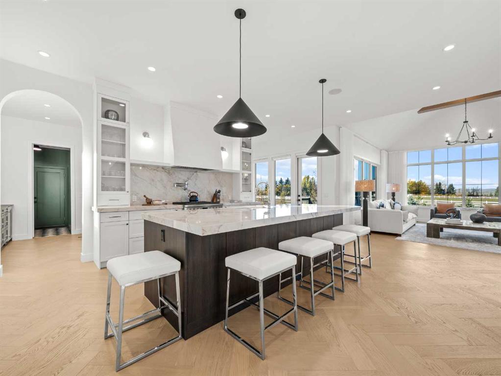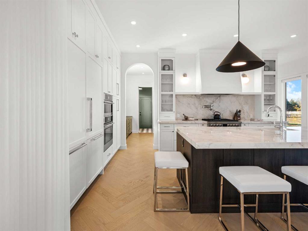Nestled in the rolling landscapes just outside Southwest Calgary, this stunning custom-built luxury estate offers the perfect balance between serene country living and urban convenience. Located on a 2.4-acre private lot in a quiet cul-de-sac surrounded by other executive homes, this brand-new residence combines timeless craftsmanship, elegant design, and modern functionality, just 3 minutes from Spruce Meadows and 30 minutes from downtown Calgary. With over 5,500 sq. ft. of finished living space, this home was built with meticulous attention to detail. Step inside to discover a bright, open layout filled with natural light, soaring ceilings, and elegant arched doorways that bring classic charm into the modern design. The main living area features large picture windows with mountain views, a beautiful fireplace centrepiece, and seamless flow into the dining area and spacious terrace, perfect for entertaining or relaxing while enjoying the peaceful scenery. The chef-inspired kitchen is a true showpiece, boasting an oversized island, Brazilian porcelain countertops, custom cabinetry, and Italian Fulgor Milano appliances. A fully equipped butler’s pantry adds functionality and extra storage, while the adjoining mudroom connects to a triple attached garage designed for convenience and versatility. The main-floor primary suite feels like a private retreat with vaulted ceilings, a fireplace, and a private covered deck for morning coffee or evening wine. The spa-like ensuite features a freestanding tub with mountain views, a glass-enclosed steam shower, and a massive walk-in closet with custom built-ins. Upstairs, a spectacular bonus room above the garage includes vaulted ceilings, a full bathroom, and a private west-facing balcony, ideal as a media room, guest suite, or entertainment area. The walkout basement offers incredible natural light and a flexible open layout, complete with a wet bar, a large family area, three spacious bedrooms (each with walk-in closets), and two full bathrooms. Step directly outside to a covered patio and your blank canvas backyard, ready for your dream landscape, pool, or outdoor kitchen. Every inch of this property reflects quality, craftsmanship, and thoughtful design—from heated tile floors and custom millwork to the seamless blend of comfort and sophistication throughout. If you’ve been searching for a home that offers privacy, space, and elegance without sacrificing proximity to the city, this one-of-a-kind estate is it.