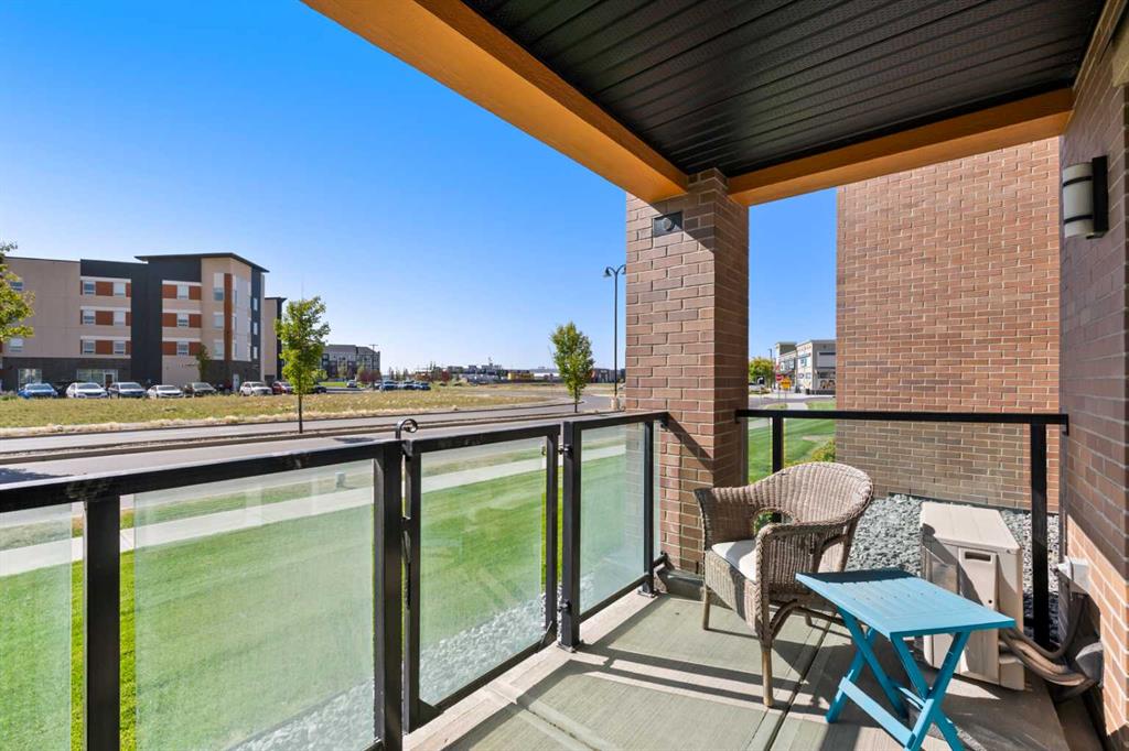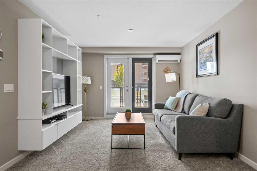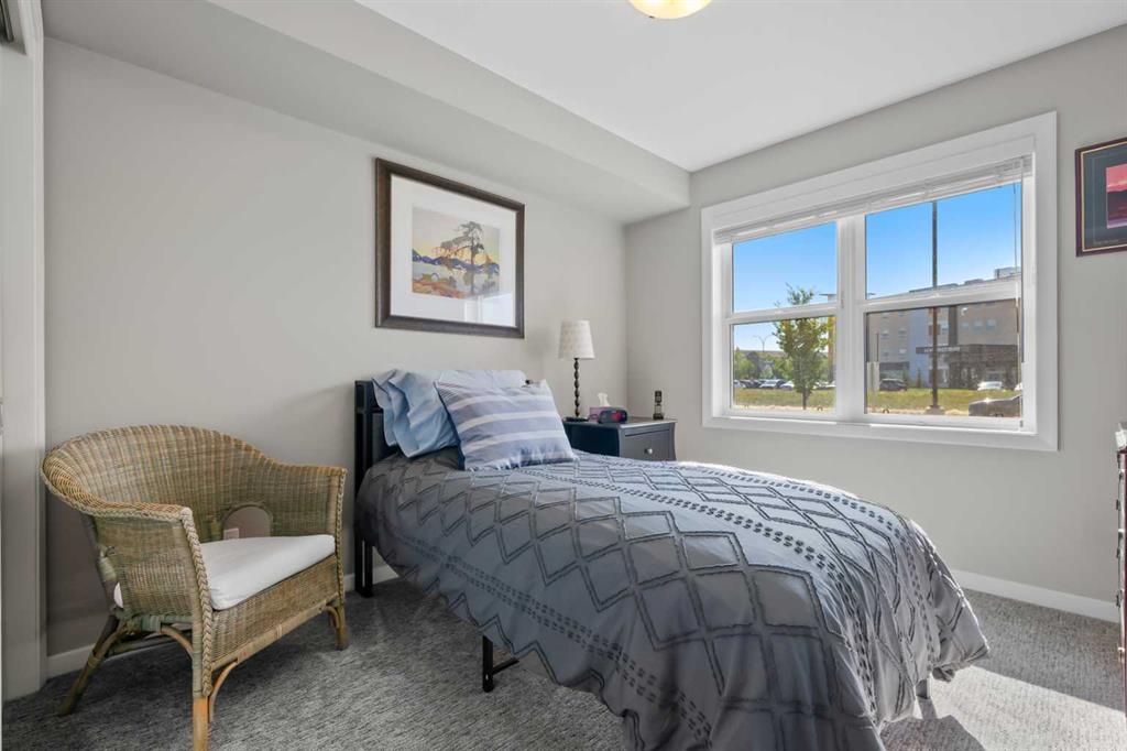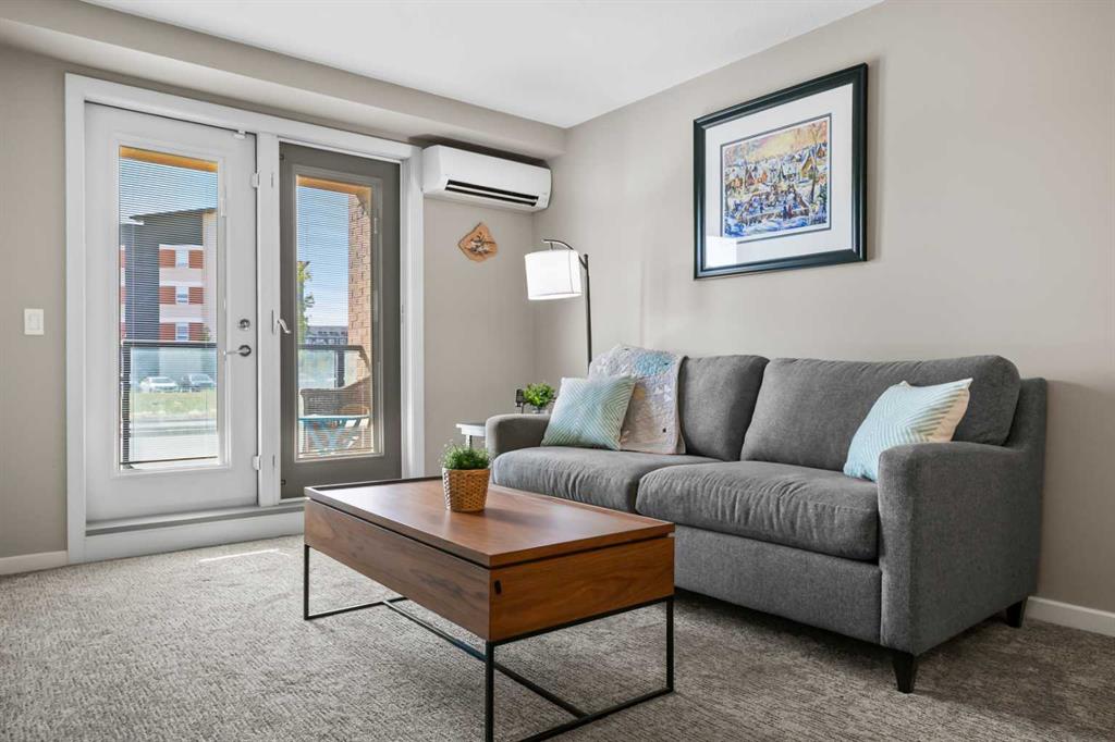 Welcome to The Chateaux! Airdrie's premier 55+ condo building in the wonderful community of Kings Heights known for its sophistication, exceptional pride of ownership and unbeatable access to nearby amenities. Upon entering this unit, you'll be impressed by the abundance of natural light, enhanced by its south-facing exposure. You're greeted by beautiful tile flooring that leads into a welcoming front entrance, where you'll find a spacious coat closet with built-in shelves, perfect for storing coats, keys and shoes. To your right is the kitchen, you will love not only the generous counter space but also the ample cabinetry this layout offers. The kitchen features granite countertops, a large sink, a lazy Susan in the corner cabinet, a garburator and a counter overhang for bar stool seating, ideal for casual meals. Stainless steel appliances and a well-appointed pantry with pull-out drawers complete this thoughtfully designed space. Moving into the living room, enjoy a spacious layout complemented by a beautiful custom California Closets media centre that is perfect for your TV, artwork and storage needs. Stay cool in the summer with a wall-mounted A/C UNIT! Your southwest-facing balcony offers year-round afternoon sun, making it the perfect place to enjoy your morning coffee, tea or an evening drink. This balcony was upgraded at the time of construction with glass panels and a gate, offering convenient direct access to the landscaped common areas, especially great for pet owners. The primary bedroom is a dream, with a large south-facing window and a spacious walk-through closet that leads into your ensuite bathroom. The ensuite features a walk-in shower with a built-in seat and elegant glass doors. The second bedroom is impressively sized and bright with custom built-in California Closet organizers that provide exceptional storage and organization. A second full bathroom is located just outside this room, complete with a beautiful vanity and a large bathtub. In-suite laundry is neatly tucked into a dedicated closet with room for storage and laundry supplies. This apartment also features a versatile den to the left of the front door that is ideal for a home office, additional storage or exercise space. For parking, enjoy the convenience of a titled underground stall located just steps from the elevator. In front of your stall, you’ll find a large, secure storage locker. Plus, there’s ample outdoor visitor parking for your guests. The Chateaux features a beautifully landscaped courtyard with a gas fireplace, and an amenity room available for private bookings where residents regularly gather here for social events and happy hours. There's also a secure underground workshop for woodworking enthusiasts. Located in Kings Heights, you’re within walking distance to Save-On-Food, Shoppers Drug Mart, banks, salons, restaurants and more meeting all your grocery, shopping and healthcare needs. Call for a private viewing today!