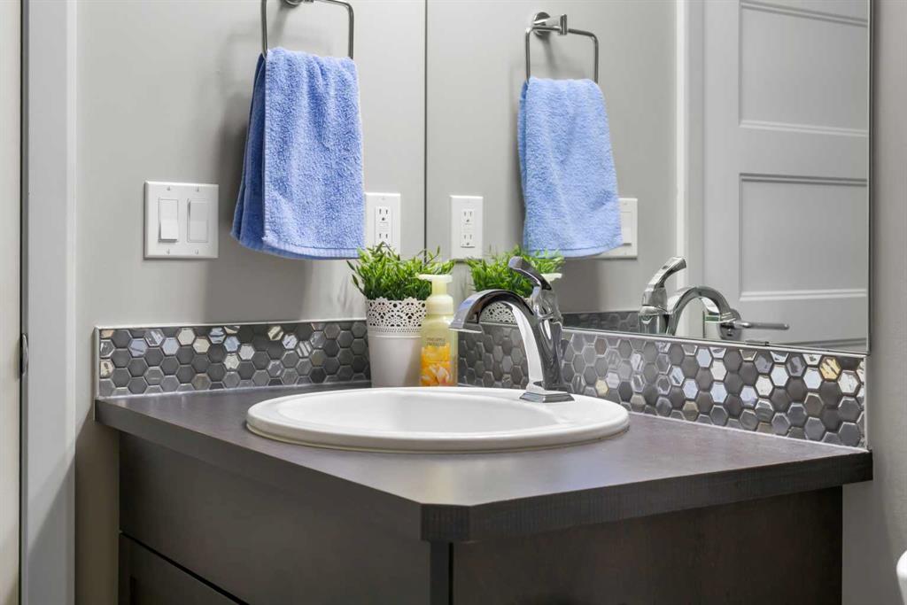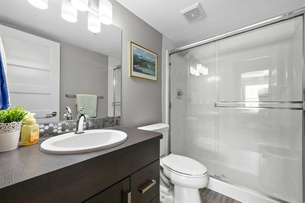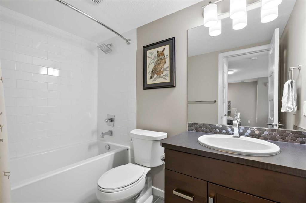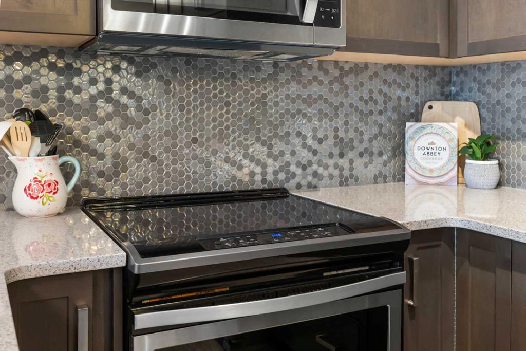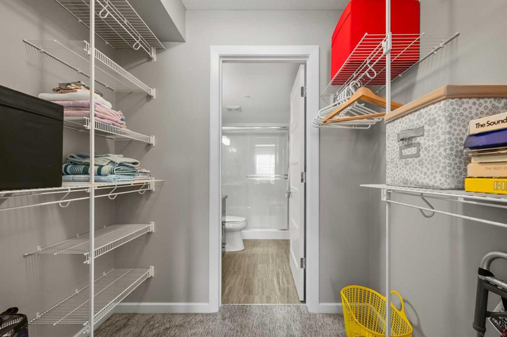 Welcome to The Chateaux! Airdrie's premier 55+ condo building in the wonderful community of Kings Heights known for its sophistication, exceptional pride of ownership and unbeatable access to nearby amenities. Upon entering this unit, you'll be impressed by the abundance of natural light, enhanced by its south-facing exposure. You're greeted by beautiful tile flooring that leads into a welcoming front entrance, where you'll find a spacious coat closet with built-in shelves, perfect for storing coats, keys and shoes. To your right is the kitchen, you will love not only the generous counter space but also the ample cabinetry this layout offers. The kitchen features granite countertops, a large sink, a lazy Susan in the corner cabinet, a garburator and a counter overhang for bar stool seating, ideal for casual meals. Stainless steel appliances and a well-appointed pantry with pull-out drawers complete this thoughtfully designed space. Moving into the living room, enjoy a spacious layout complemented by a beautiful custom California Closets media centre that is perfect for your TV, artwork and storage needs. Stay cool in the summer with a wall-mounted A/C UNIT! Your southwest-facing balcony offers year-round afternoon sun, making it the perfect place to enjoy your morning coffee, tea or an evening drink. This balcony was upgraded at the time of construction with glass panels and a gate, offering convenient direct access to the landscaped common areas, especially great for pet owners. The primary bedroom is a dream, with a large south-facing window and a spacious walk-through closet that leads into your ensuite bathroom. The ensuite features a walk-in shower with a built-in seat and elegant glass doors. The second bedroom is impressively sized and bright with custom built-in California Closet organizers that provide exceptional storage and organization. A second full bathroom is located just outside this room, complete with a beautiful vanity and a large bathtub. In-suite laundry is neatly tucked into a dedicated closet with room for storage and laundry supplies. This apartment also features a versatile den to the left of the front door that is ideal for a home office, additional storage or exercise space. For parking, enjoy the convenience of a titled underground stall located just steps from the elevator. In front of your stall, you’ll find a large, secure storage locker. Plus, there’s ample outdoor visitor parking for your guests. The Chateaux features a beautifully landscaped courtyard with a gas fireplace, and an amenity room available for private bookings where residents regularly gather here for social events and happy hours. There's also a secure underground workshop for woodworking enthusiasts. Located in Kings Heights, you’re within walking distance to Save-On-Food, Shoppers Drug Mart, banks, salons, restaurants and more meeting all your grocery, shopping and healthcare needs. Call for a private viewing today!