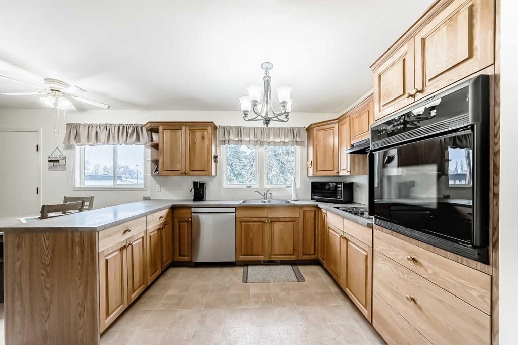 This well-maintained home offers excellent value with plenty of recent upgrades. The main floor features a bright open kitchen with newer oak cabinetry, roll-out pot drawers, pantry pullouts, a new dishwasher, and an upgraded wall oven. The kitchen flows into the nice sized living room. The primary bedroom includes a large closet, the main 4 pce bath offers a relaxing jetted tub. One more bedroom completes the main floor. Recent updates include a newer roof and soffits (approx. 3 years), front vinyl windows (2019) and hot-water tank (2018), central air conditioning, fresh paint, some new flooring and a new front walkway. The lower walk-out level offers excellent extra living space with a large family room (formerly the garage), another that could be bedroom or workshop area, laundry, and a half bath. The double detached garage (24x26) features two overhead doors, 220 wiring and convenient back-alley access. A rubber driveway adds durability and curb appeal and extra parking for an RV. Centrally located close to schools, shopping, and the downtown core, this home is move-in ready—perfect for first-time buyers, downsizers, or investors. Call today to book your showing!!