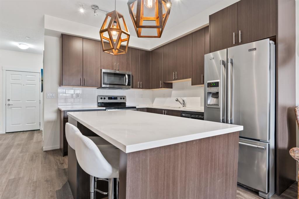 Discover this charming 2-bedroom + den, 1-bathroom condo in the sought-after NW community of Sage Hill. This bright and spacious unit offers an open-concept layout, with a large living area that provides direct access to a west-facing patio, perfect for enjoying beautiful sunsets and outdoor meals with the built-in gas line for a BBQ hookup. The modern kitchen features sleek quartz countertops, stainless steel appliances, and a generously sized center island, offering plenty of space for cooking and gathering. Abundant cabinet and drawer space ensures everything has its place, creating an organized and stylish cooking environment. The bright primary bedroom includes a walk-through closet that leads to a 4-piece bathroom. The second bedroom is also generously sized, perfect for family or guests, while the versatile den can easily serve as an office, extra storage, or a hobby space to suit your needs. Additional highlights include in-suite laundry, a titled surface parking stall, and an assigned storage locker. The well-maintained complex boasts low condo fees and is located just steps away from serene ponds, walking and bike paths, and expansive green spaces. Conveniently located close to schools, public transit, major roadways, and an abundance of amenities including shopping, restaurants, daycares, and fitness centers, this property is perfect for investors, first-time homebuyers, or downsizers looking for a modern and practical living space in a vibrant community. Don’t miss out on this great opportunity!