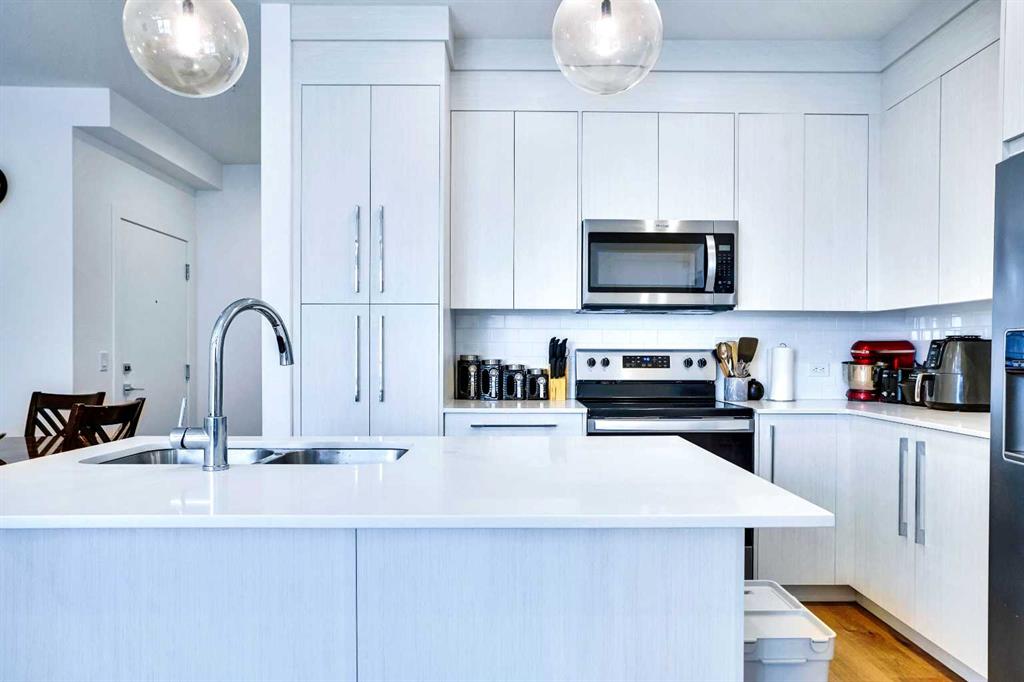 Welcome to this stunning main-floor corner unit condo in the Savanna II building, offering 863 sq. ft. of thoughtfully designed living space with extra privacy and abundant natural light. This beautiful 2-bedroom, 2-bathroom home features a spacious primary bedroom that easily accommodates a king-sized bed and is filled with natural light from large windows on two sides. The modern kitchen showcases sleek stainless-steel appliances and bright quartz countertops, seamlessly connecting to the open-concept living area that leads to a large balcony—perfect for relaxing, entertaining, or enjoying barbecue evenings with friends and family. The unit also includes convenient in-suite laundry, while the building offers excellent amenities such as a fitness center, comfortable resident lounge, dog wash station, and bike wash area. Ideally located just steps from restaurants, cafés, grocery stores, parks, and other everyday essentials, this condo offers exceptional urban convenience with everything you need within a short walk—don’t miss this opportunity and book your showing with your favorite realtor today.