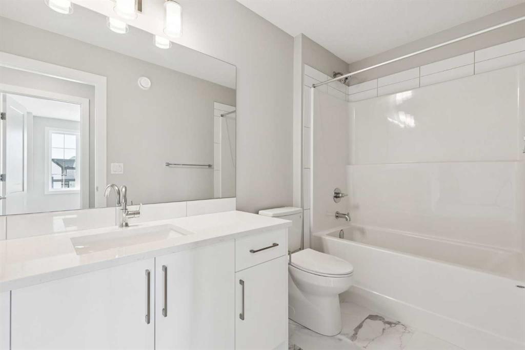 For those who work hard and play harder, this brand-new paired home in Upper Greenwich is the perfect blend of style, comfort, and convenience. Step inside and feel the calm wash over you – tall ceilings and wide-plank luxury flooring create a light, airy vibe. The chef-inspired kitchen is a showstopper with warm wood grain on the island, soft white cabinetry, quartz countertops, and a backsplash fittingly named White Brick Road. Whether you’re grabbing a quick breakfast before heading out the door or hosting friends on a night off, this space is made for real life. Upstairs, your primary suite is a private escape after long shifts. Soak away the stress of the day in the freestanding tub, or refresh under the frameless glass walk-in shower with tile surround and adjustable-height faucet. Dual sinks, a private water closet, and elegant finishes give it a spa-like feel. Two more bedrooms and a bonus room mean there’s space for guests, a Peloton corner, or a quiet reading nook. Your commute? 20 minutes to downtown Calgary. Your weekend? 45 minutes to the mountains. Walk to the Calgary Farmers’ Market for fresh ingredients, hit the pickleball courts, or follow the nearby paths to the Bow River for a run, paddle, or just a moment of stillness. Winsport and the Calgary Climbing Centre are practically in your backyard, keeping your active lifestyle within easy reach. This isn’t just a house – it’s a home designed for your pace, your goals, and your well-earned downtime.