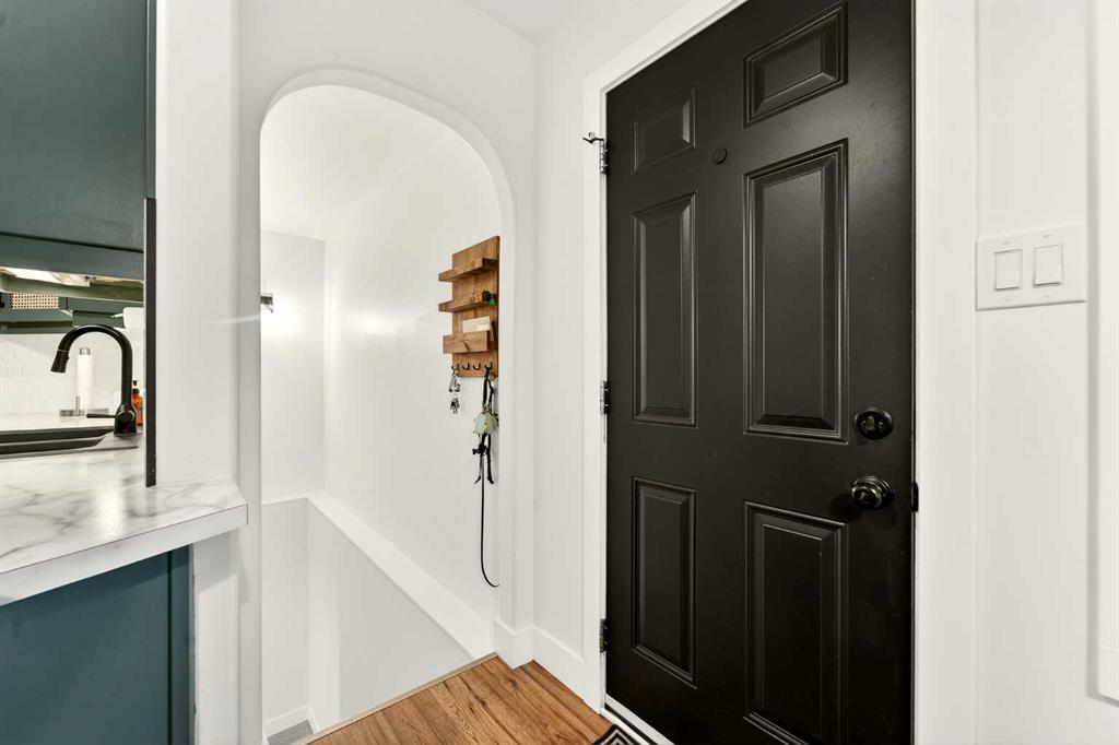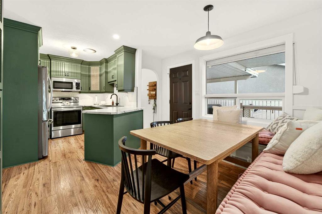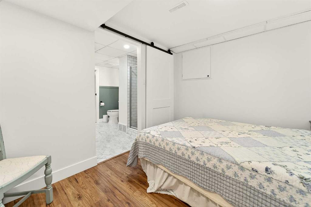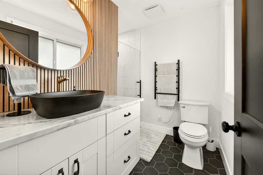 This fully renovated bungalow is a rare blend of high-design finishes and thoughtful energy-efficient upgrades, resulting in a home that feels both elevated and intentionally built for long-term comfort. From the outside in, nearly every detail has been updated, including solar panels, vinyl windows, and thickened exterior walls with added insulation—improving efficiency without sacrificing style. The main living space feels bright and welcoming, anchored by warm flooring, clean white walls, and large windows that flood the room with natural light. The aesthetic throughout the home is modern but approachable, with carefully selected textures and finishes that create visual interest without feeling overdone. The kitchen is the showpiece. Custom green cabinetry adds depth and character, paired beautifully with striking countertops, a crisp tile backsplash, and under-mount cabinet lighting that gives the space a soft, ambient glow in the evenings. Matte black hardware and fixtures tie everything together, creating a cohesive, designer look that feels both current and timeless. The primary bedroom is spacious and calming, finished with warm tones, new wall sconces, and a walk-in closet. The ensuite is nothing short of stunning, featuring a curbless tile shower with a glass door, modern fixtures, and layered textures that give the space a boutique-hotel feel. Just next door, the four-piece main bathroom continues the design theme with a new tile floor, tiled shower surround, and clean, contemporary finishes. A second bedroom on this level has also been fully updated and works perfectly as a guest room, nursery, or home office. Downstairs, the fully developed basement adds substantial living space with plush carpet in the family room, creating a cozy area for movie nights or relaxing evenings. Additional storage has been thoughtfully incorporated, along with a dedicated laundry area. Two more generously sized bedrooms are located on this level, along with another updated bathroom that maintains the same modern design language as the rest of the home. Outside, the double detached garage provides excellent parking and storage, rounding out a property that has been comprehensively renovated with both form and function in mind. There is also a carport at the front of the home for additional parking. This is a home where design, efficiency, and everyday livability come together seamlessly—offering a truly move-in-ready experience with standout style.