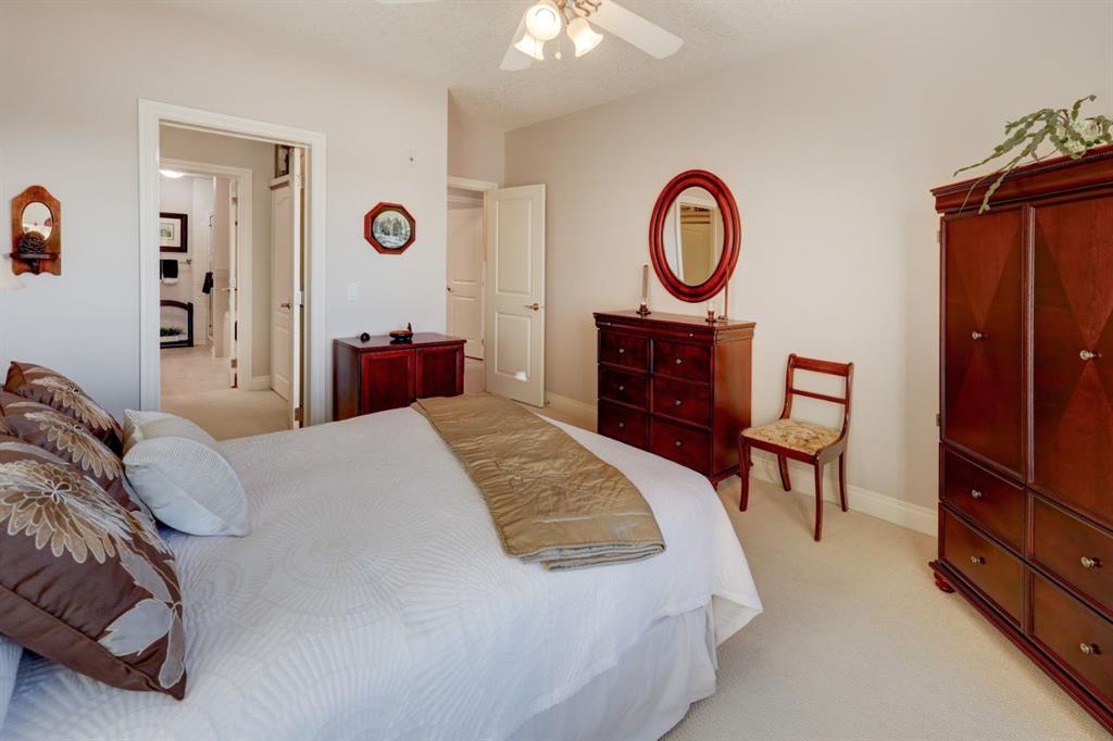 OPEN HOUSE - SATURDAY, JANUARY 17, 2:00-4:00PM. Perched in the heart of Tuscany's coveted Villa d'Este, this impeccable second-floor two-bedroom condo backs directly onto a serene coulee valley—your private gateway to nature right in the city. Step onto the expansive covered balcony to soak in stunning mountain vistas and unwind amid walking paths and trails that wind through the ravine just below, blending urban convenience with peaceful escapes. Meticulously maintained to feel like new, the home features fresh neutral paint throughout and smart upgrades, including convenient pull-out drawers in the cabinets for effortless organization. The bright, open-concept main living space is enhanced by air-conditioning, gleaming engineered hardwood floors, and wall-to-wall windows that frame those incredible views. The modern kitchen flows seamlessly with rich maple cabinetry, a spacious island, granite counters, undercabinet lighting, and stainless steel appliances. Two airy bedrooms offer quiet retreats, highlighted by the primary suite's dual closets and luxurious ensuite with soaker tub, double vanities, and oversized shower. Additional highlights include tiled bathroom floors, Hunter Douglas blinds, a reverse osmosis system, a practical laundry/storage room with built-ins, and the ultimate lock-and-leave lifestyle: two titled heated underground parking stalls plus a dedicated storage locker. Surrounded by friendly neighbours who create a true sense of community, and just minutes from the Tuscany Club, market, LRT, and shopping—this is effortless, view-inspired living at its best.
