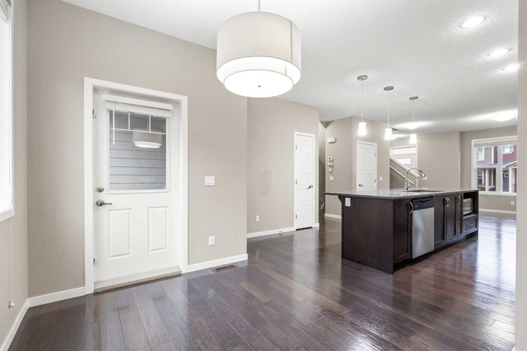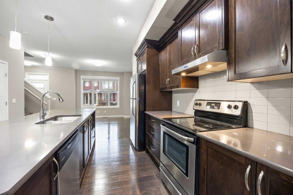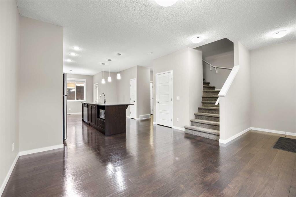 Welcome to this bright and inviting 2-storey townhome in the sought-after community of Panorama Hills, offering 3 bedrooms, 2.5 baths, and 1,333 sq ft of well planned living space. Ideally located just steps from a tranquil courtyard park with seating area—perfect for outdoor relaxation and community connection. Step inside to the main level and be greeted by an open floorplan with 9-foot ceilings and elegant engineered hardwood flooring throughout. The sunny South-facing Living room fills the space with natural light, seamlessly flowing into the well-appointed Kitchen featuring a centre island, quartz countertops, stainless steel appliances, and ample cabinetry for all your storage needs. The adjacent Dining room opens to a private balcony with gas hookup—perfect for summer grilling or enjoying your morning coffee. A convenient half bath completes this level. On the upper level, the spacious Primary bedroom features a large window, a walk-in closet with window for added light, and a full ensuite bath with quartz countertops. Two additional bedrooms and a 4-piece bath provide comfortable space for family or guests. The partially finished basement offers practical living with Laundry access and leads to the Double attached garage, complete with built-in ceiling shelves for extra storage. Located in Panorama Hills, this townhome offers the perfect blend of low-maintenance living and family-friendly convenience. Enjoy close proximity to top-rated schools, Panorama Hills Golf & Country Club, shopping at Superstore and Country Hills Village, Vivo Recreation Centre, transit, and major roadways including Stoney Trail. This move-in ready home combines open-concept living, sunny South-facing light, peaceful courtyard park setting, and an unbeatable location in one of Calgary's most desirable Northwest communities.
